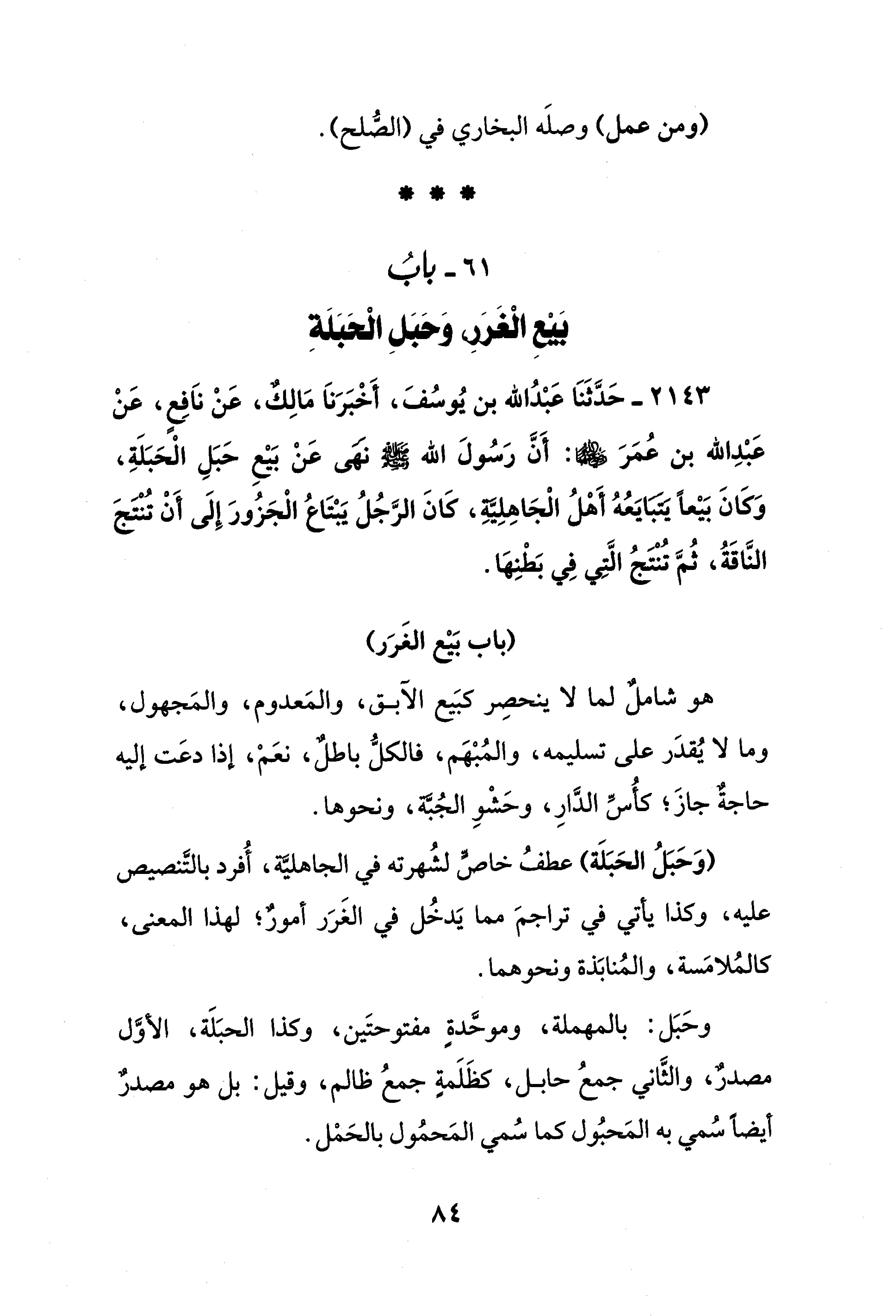 2143 - حَدَّثَنَا عَبْدُ الله بن يُوسُفَ، أَخْبَرَناَ مَالِكٌ، عَنْ ناَفِعٍ، عَنْ عَبْدِ الله بن عُمَرَ - رضي الله عنهما -: أَنَّ رَسُولَ الله - صلى الله عليه وسلم - نَهَى عَنْ بَيْعِ حَبَلِ الْحَبَلَةِ، وَكَانَ بَيْعًا يَتَبَايَعُهُ أَهْلُ الْجَاهِلِيِّةِ، كَانَ الرَّجُلُ يَبْتَاعُ الْجَزُورَ إِلَى أَنْ تُنْتَجَ النَّاقَةُ، ثُمَّ تُنْتَجُ الَّتِي في بَطْنِهَا.