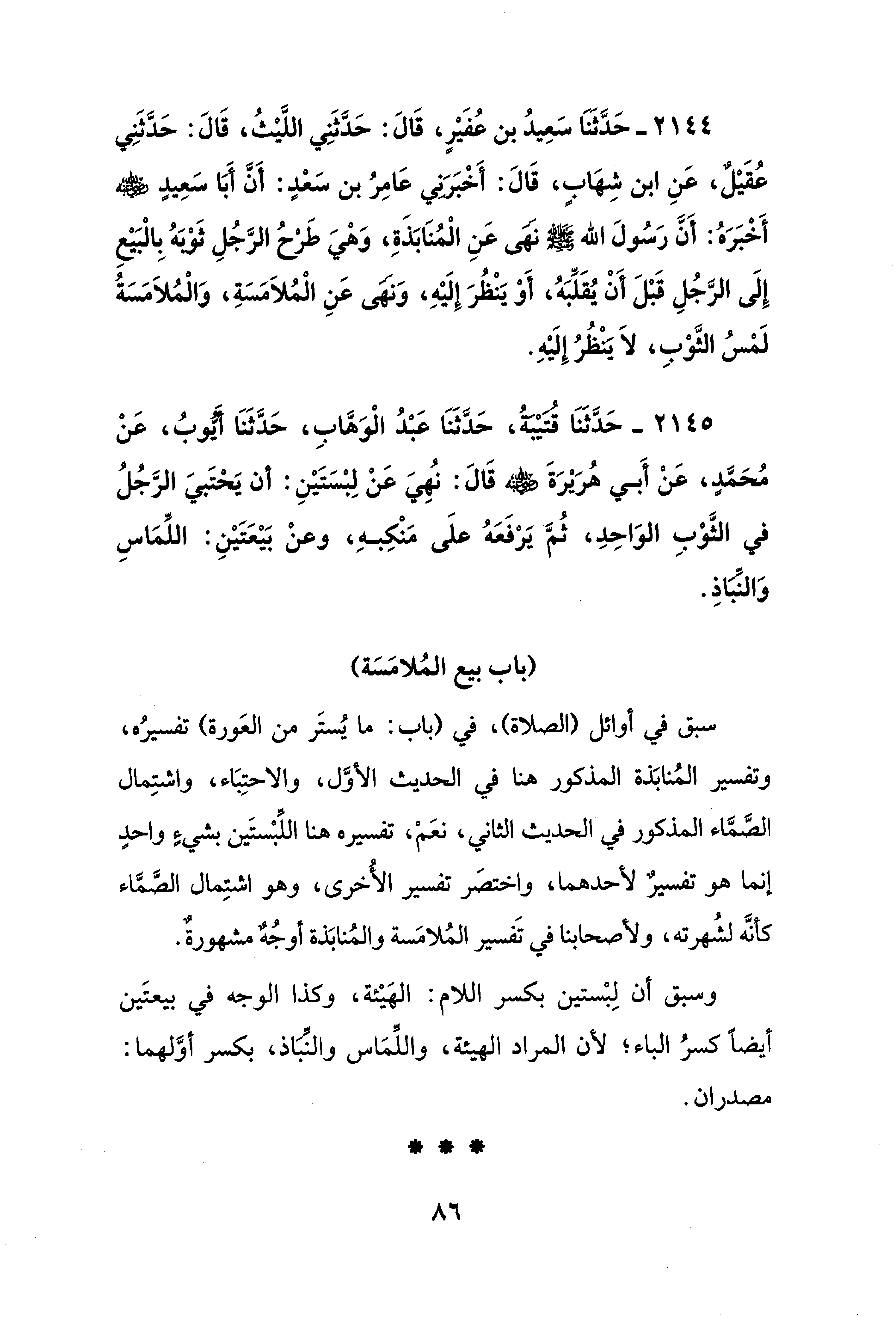 سبق في أوائل (الصلاة)، في (باب: ما يُستَر من العَورة) تفسيرُه، وتفسير المُنابَذة المذكور هنا في الحديث الأوَّل، والاحتِبَاء، واشتِمال الصَّمَّاء المذكور في الحديث الثاني، نعَمْ، تفسيره هنا اللِّبْستَين بشيءٍ واحدٍ إنما هو تفسيرٌ لأحدهما، واختصَر تفسير الأُخرى، وهو اشتِمال الصَّمَّاء كأنَّه لشُهرته، ولأصحابنا في تَفسير المُلامَسة والمُنابَذة أوجُهٌ مشهورةٌ.