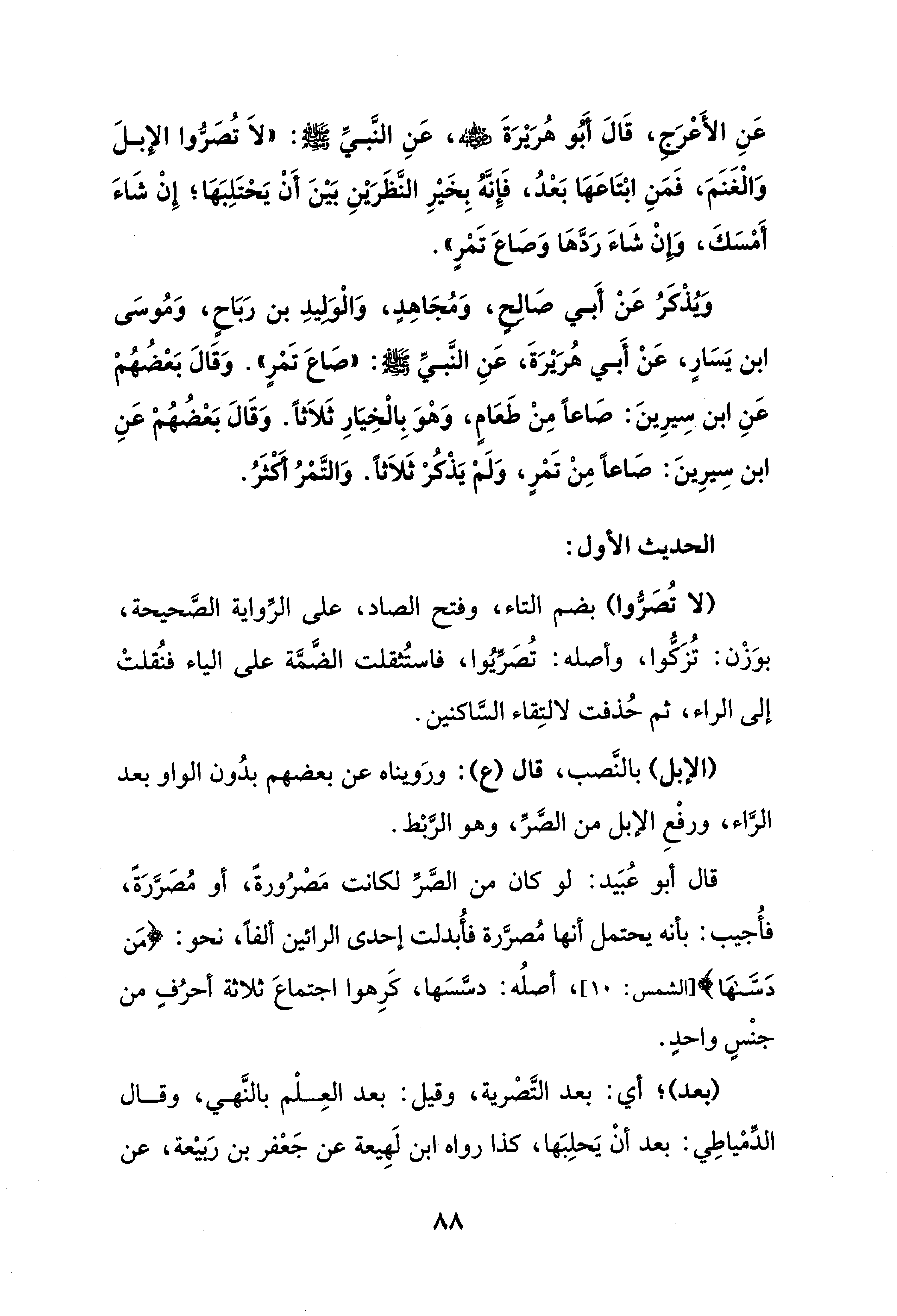 عَنِ الأَعْرَج، قَالَ أَبُو هُرَيْرَةَ - رضي الله عنه -، عَنِ النَّبيِّ - صلى الله عليه وسلم -: "لاَ تُصَرُّوا الإِبلَ وَالْغَنَمَ، فَمَنِ ابْتَاعَهَا بَعْدُ، فَإِنَّهُ بِخَيْرِ النَّظَرَيْنِ بَيْنَ أَنْ يَحْتَلِبَهَا؛ إِنْ شَاءَ أَمْسَكَ، وإنْ شَاءَ رَدَّهَا وَصَاعَ تَمْرٍ".