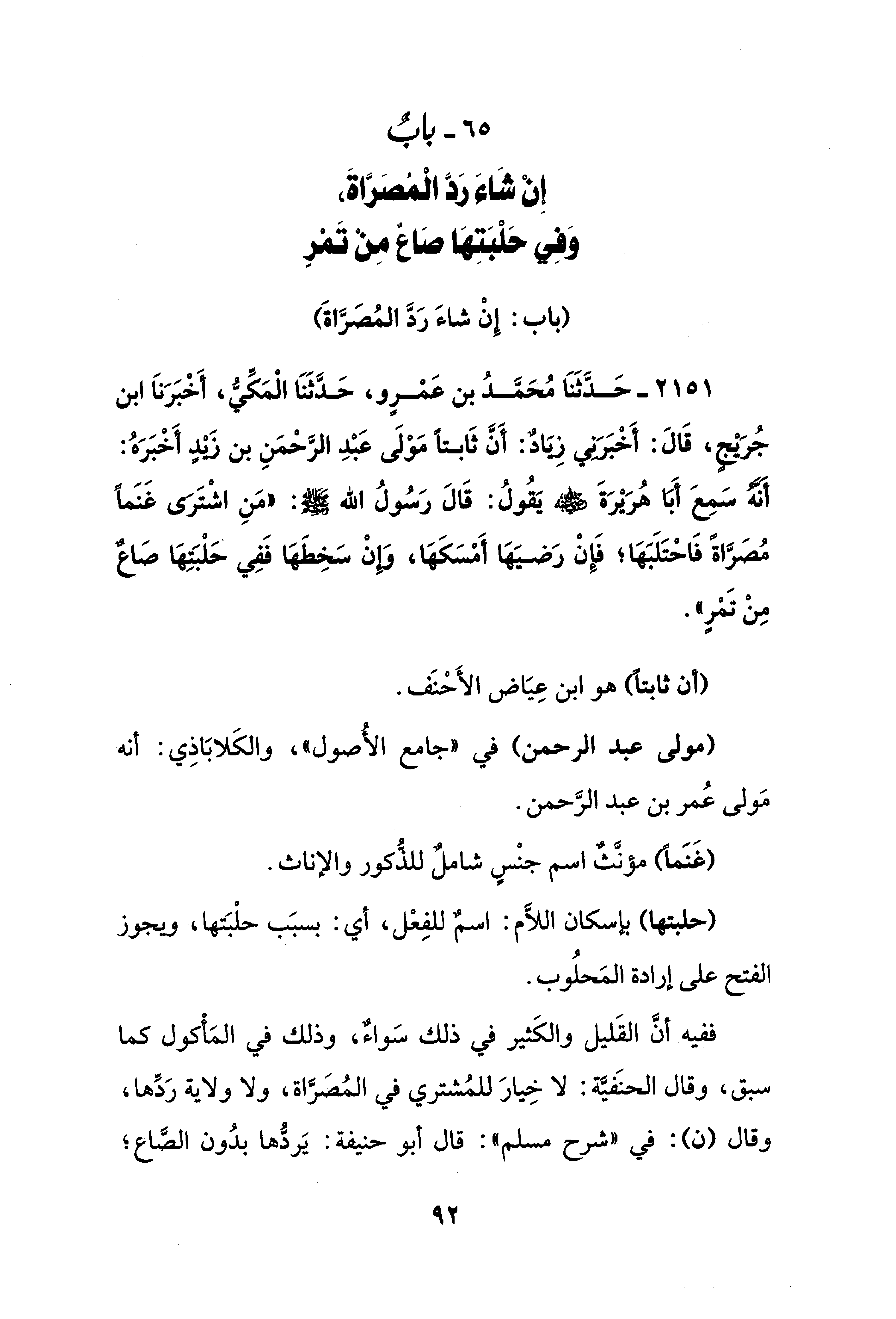 2151 - حَدَّثَنَا مُحَمَّدُ بن عَمْرٍو، حَدَّثَنَا الْمَكِّيُّ، أَخْبَرَناَ ابن جُرَيْجٍ، قَالَ: أَخْبَرَنِي زِيَادٌ: أَنَّ ثَابتًا مَوْلَى عَبْدِ الرَّحْمَنِ بن زَيْدٍ أَخْبَرَهُ: أَنَّهُ سَمِعَ أَبَا هُرَيْرَةَ - رضي الله عنه - يَقُولُ: قَالَ رَسُولُ الله - صلى الله عليه وسلم -: "مَنِ اشْتَرى غَنَمًا مُصَرَّاةً فَاحْتَلَبَهَا؛ فَإِنْ رَضيَهَا أَمْسَكَهَا، وَإِنْ سَخِطَهَا فَفِي حَلْبَتِهَا صَاعٌ منْ تَمْرٍ".