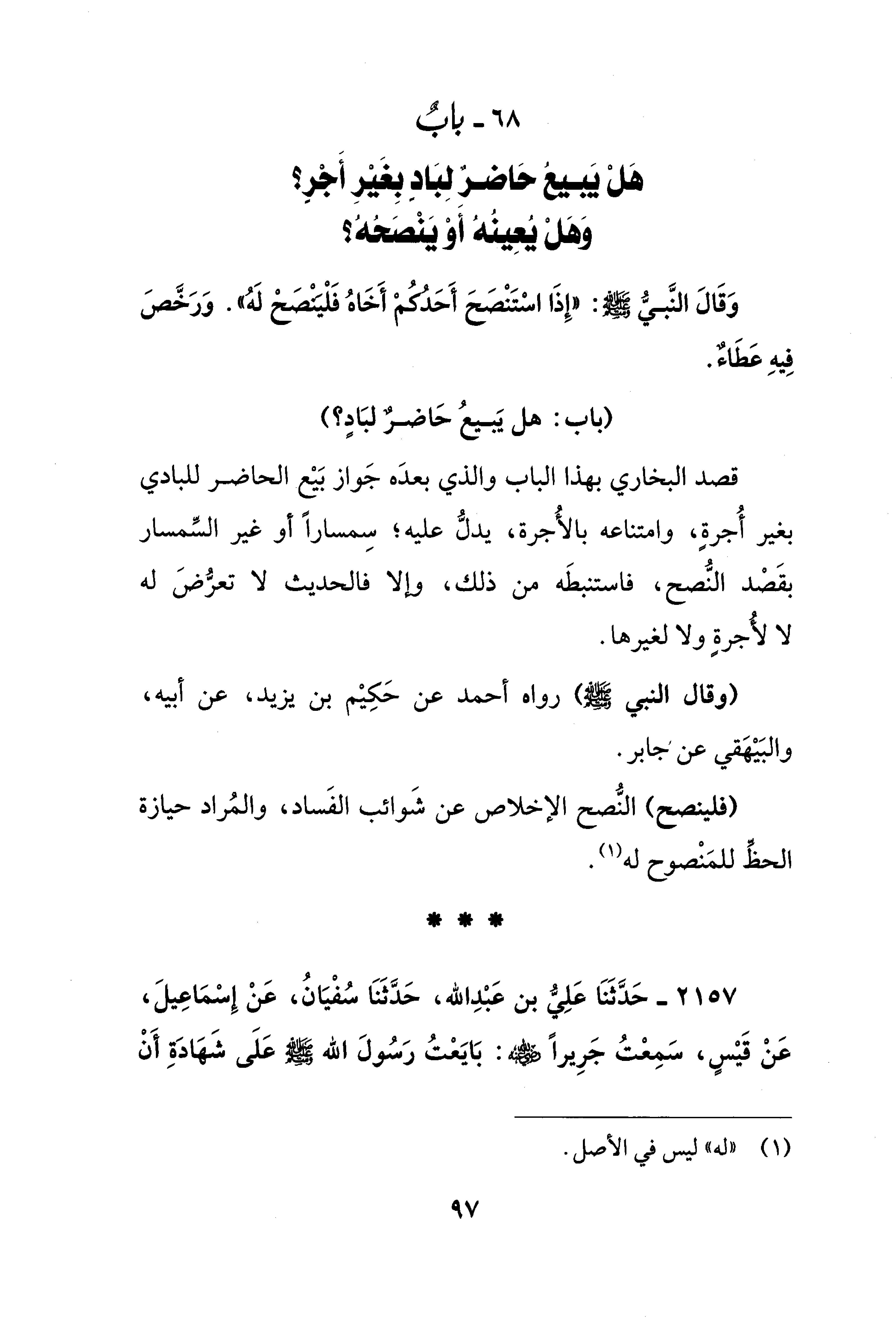 68 - بابٌ هَلْ يَبيعُ حَاضرٌ لِبَادٍ بِغَيْرِ أَجْرٍ؟ وَهَلْ يُعِينُهُ أَوْ يَنْصَحُهُ؟
