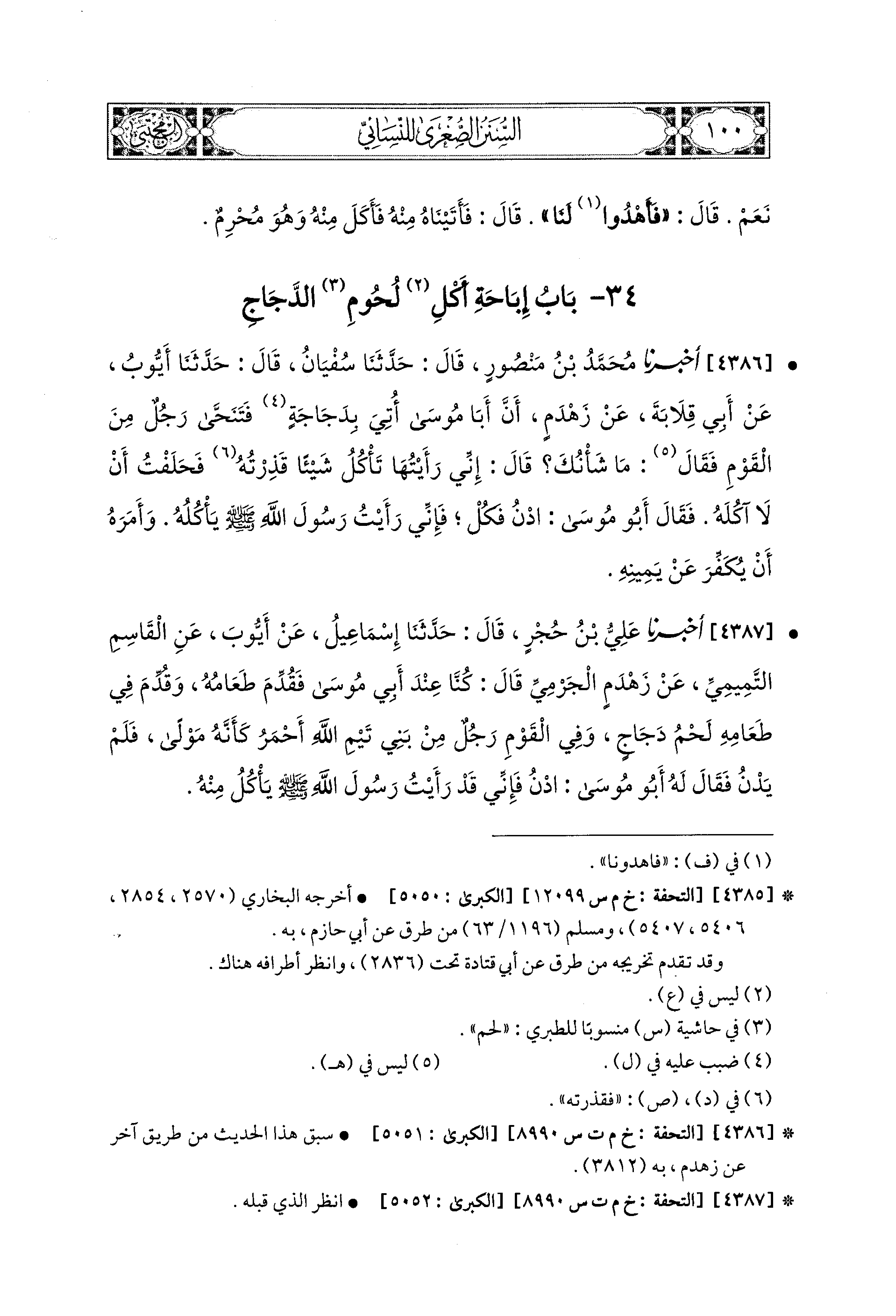 4386- أَخبَرَنا مُحَمد بْنُ مَنْصُورٍ، قال: حَدثنا سُفْيَانُ، قال: حَدثنا أَيُّوبُ، عَن أَبِي قِلاَبَةَ، عَن زَهْدَمٍ، أَنَّ أَبَا مُوسَى أُتِيَ بِدَجَاجَةٍ فَتَنَحَّى رَجُلٌ مِنَ القَوْمِ، فَقَالَ: مَا شَأْنُكَ؟ قَالَ: إِنِّي رَأَيْتُهَا تَأْكُلُ شَيْئًا قَذِرْتُهُ فَحَلَفْتُ أَنْ لاَ آكُلَهُ، فَقَالَ أَبو مُوسَى: ادْنُ فَكُلْ، فَإِنِّي رَأَيْتُ رَسُولَ اللهِ صَلى الله عَليه وسَلم يَأْكُلُهُ، وَأَمَرَهُ أَنْ يُكَفِّرَ عَن يَمينِهِ.