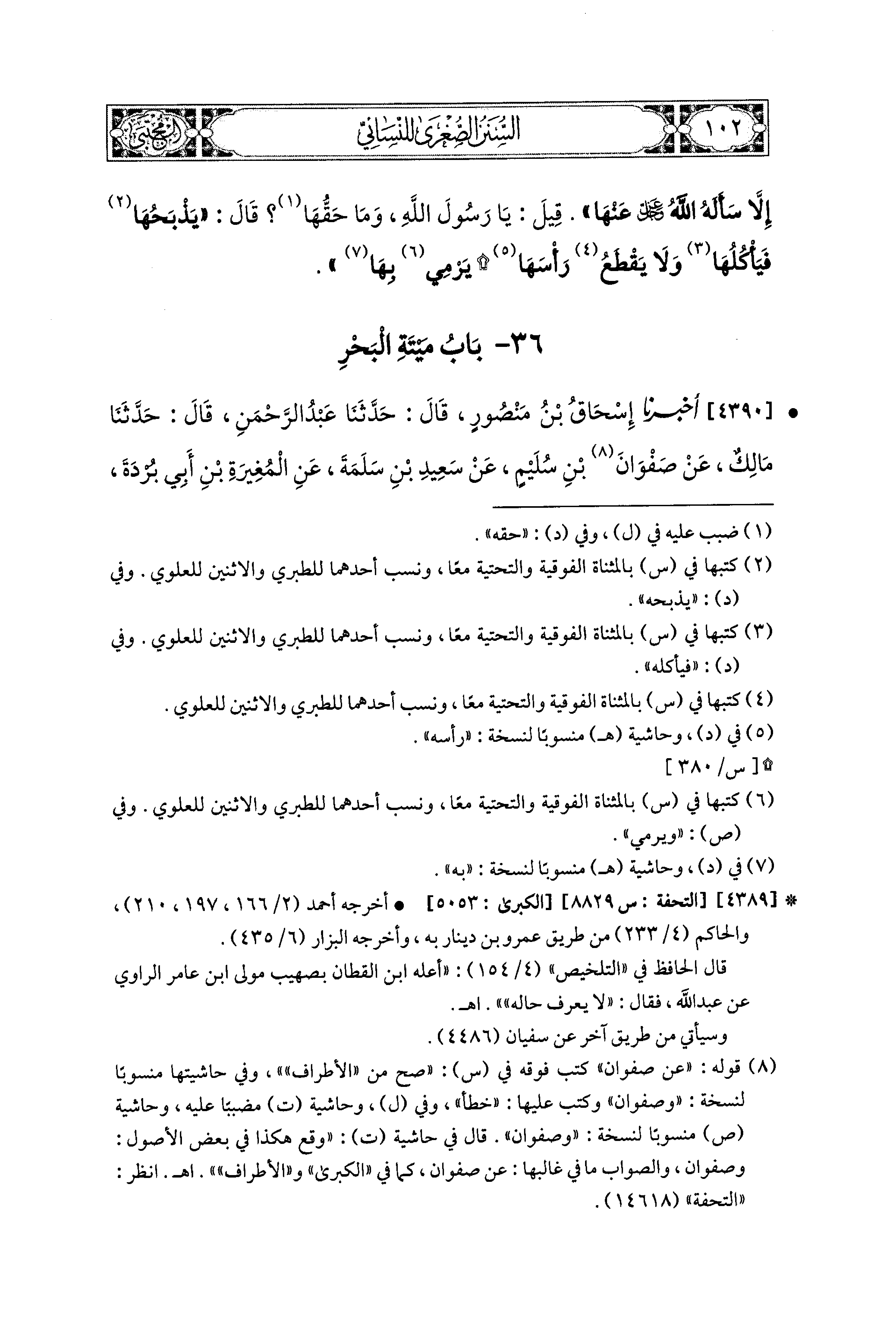 4390- أَخبَرَنا إِسحَاقُ بْنُ مَنْصُورٍ، قال: حَدثنا عَبدُ الرَّحمَنِ، قال: حَدثنا مَالِكٌ، عَن صَفْوَانَ بْنِ سُلَيْمٍ، عَن سَعيدِ بْنِ سَلَمَةَ، عَنِ المُغِيرَةِ بْنِ أَبِي بُرْدَةَ، عَن أَبِي هُرَيرَةَ، عَنِ النَّبيِّ صَلى الله عَليه وسَلم فِي مَاءِ البَحْرِ: هُوَ الطَّهُورُ مَاؤُهُ، الحل مَيْتَتُهُ.