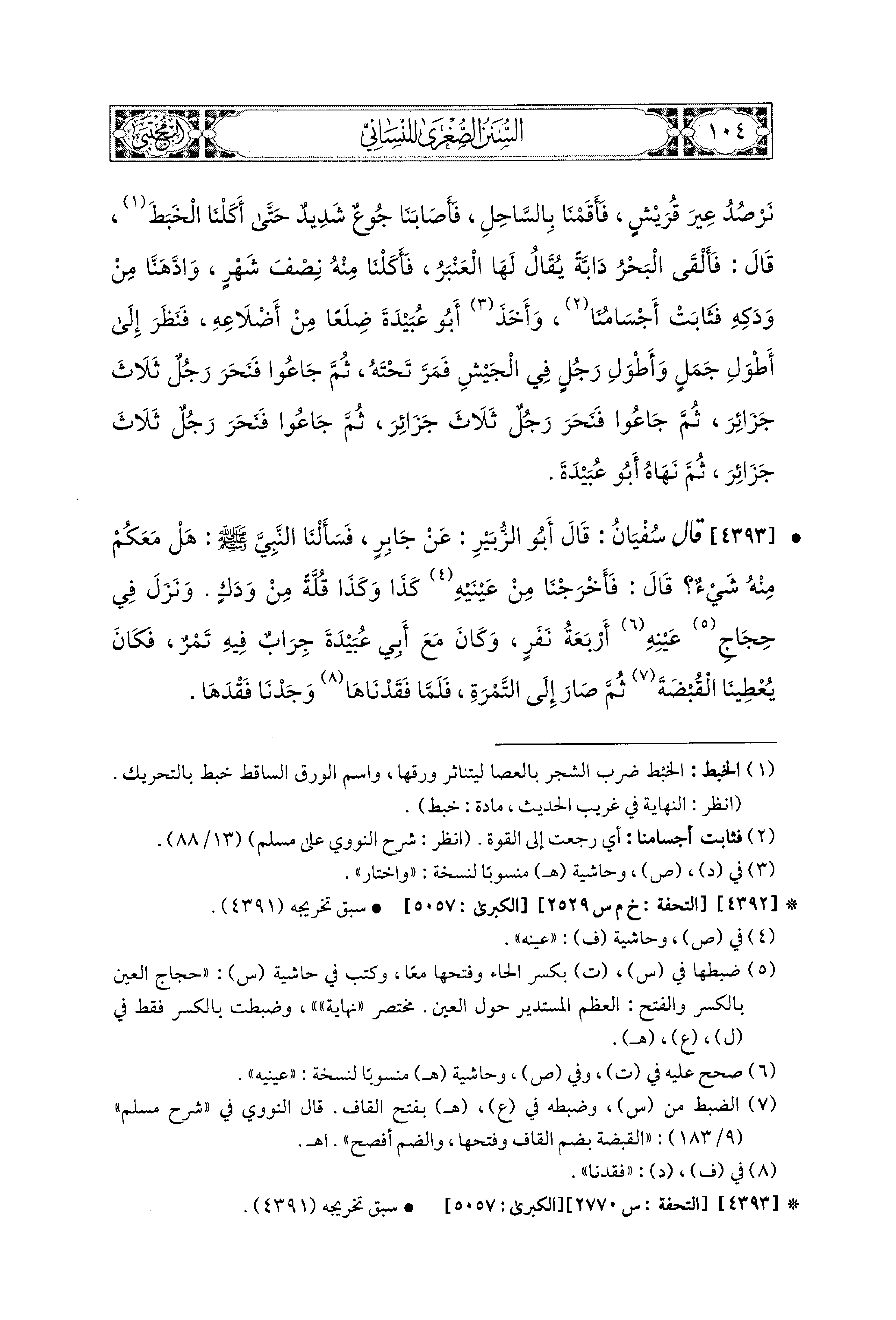 4393- قَالَ: سُفْيَانُ قَالَ: أَبو الزُّبَيْرِ عَن جَابِرٍ، فَسَأَلْنَا النَّبيَّ صَلى الله عَليه وسَلم, هَلْ مَعَكُمْ مِنْهُ شَيْءٌ؟ قَالَ: فَأَخْرَجْنَا مِنْ عَيْنَيْهِ كَذَا وَكَذَا، قُلَّةً مِنْ وَدَكٍ، وَنَزَلَ فِي حَجَّاجِ عَيْنِهِ أَرْبَعَةُ نَفَرٍ، وَكَانَ مَعَ أَبِي عُبَيدَةَ جِرَابٌ فِيهِ تَمْرٌ، فَكَانَ يُعْطِينَا القَبْضَةَ، ثُمَّ صَارَ إِلَى التَّمْرَةِ، فَلَمَّا فَقَدْنَاهَا وَجَدْنَا فَقْدَهَا.