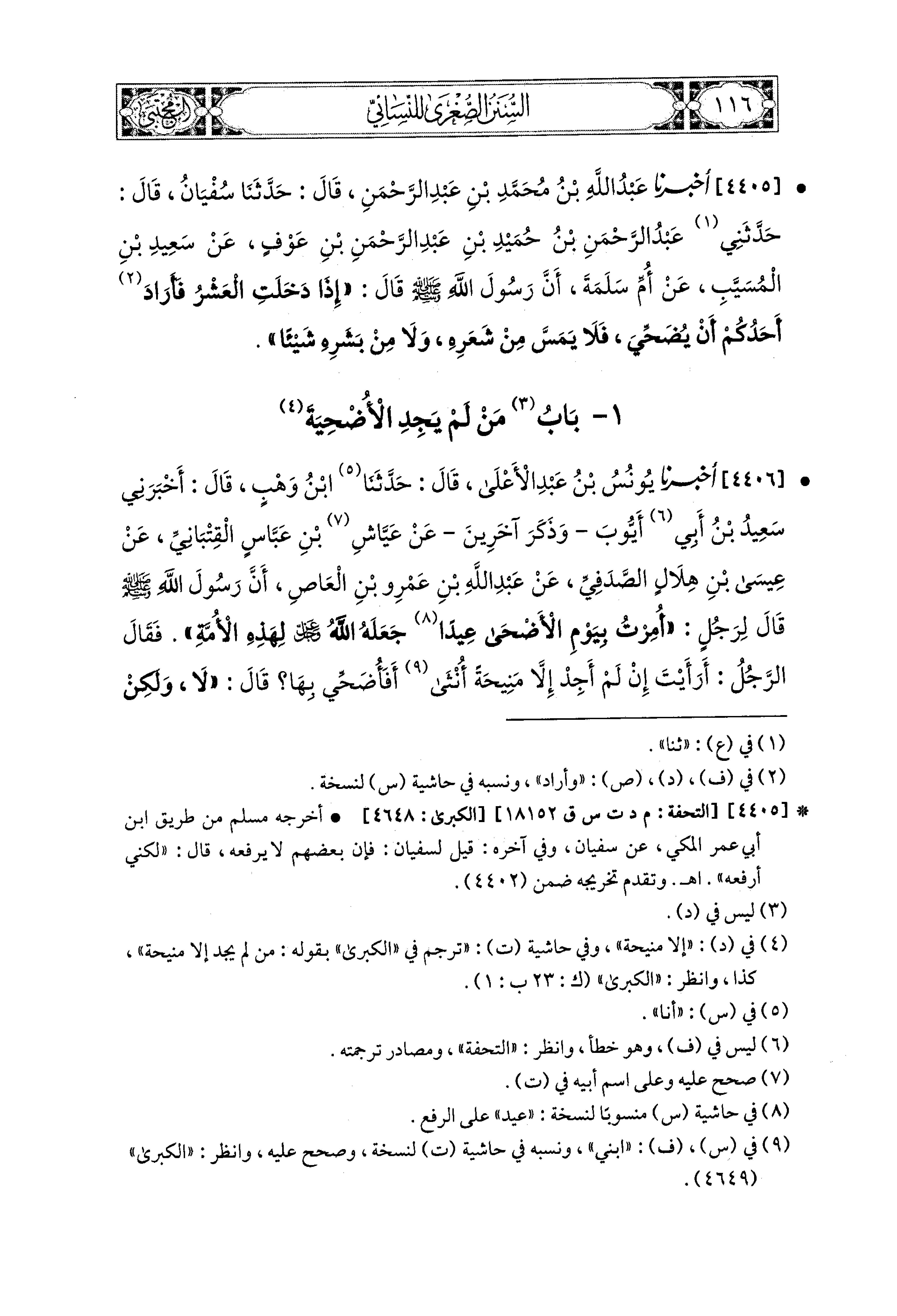4406- أَخبَرَنا يُونُسُ بن عَبدِ الأَعلَى، قال: حَدثنا ابْنُ وَهْبٍ، قَالَ: أَخْبَرَني سَعيدُ بْنُ أَبِي أَيُّوبَ، وَذَكَرَ آخَرِينَ: عَن عَيَّاشِ بْنِ عَبَّاسٍ القِتْبَانيِّ، عَن عِيسَى بْنِ هِلاَلٍ الصَّدَفِيِّ، عَن عَبد اللهِ بن عَمْرِو بْنِ العَاصِ، أَنَّ رَسُولَ اللهِ صَلى الله عَليه وسَلم قَالَ لِرَجُلٍ: أُمِرْتُ بِيَوْمِ الأَضْحَى عيدًا جَعَلَهُ اللهُ عَزَّ وَجَلَّ لِهَذِهِ الأُمَّةِ، فَقَالَ الرَّجُلُ: أَرَأَيْتَ إِنْ لَمْ أَجِدْ إِلاَّ مَنيحَةً أُنْثَى أَفَأُضَحِّي بِهَا؟ قَالَ: لاَ، وَلَكِنْ تَأْخُذُ مِنْ شَعْرِكَ، وَتُقَلِّمُ أَظْفَارَكَ، وَتَقُصُّ شَارِبَكَ، وَتَحْلِقُ عَانَتَكَ، فَذَلِكَ تَمَامُ أُضْحِيَّتِكَ عِنْدَ اللهِ عَزَّ وَجَلَّ.