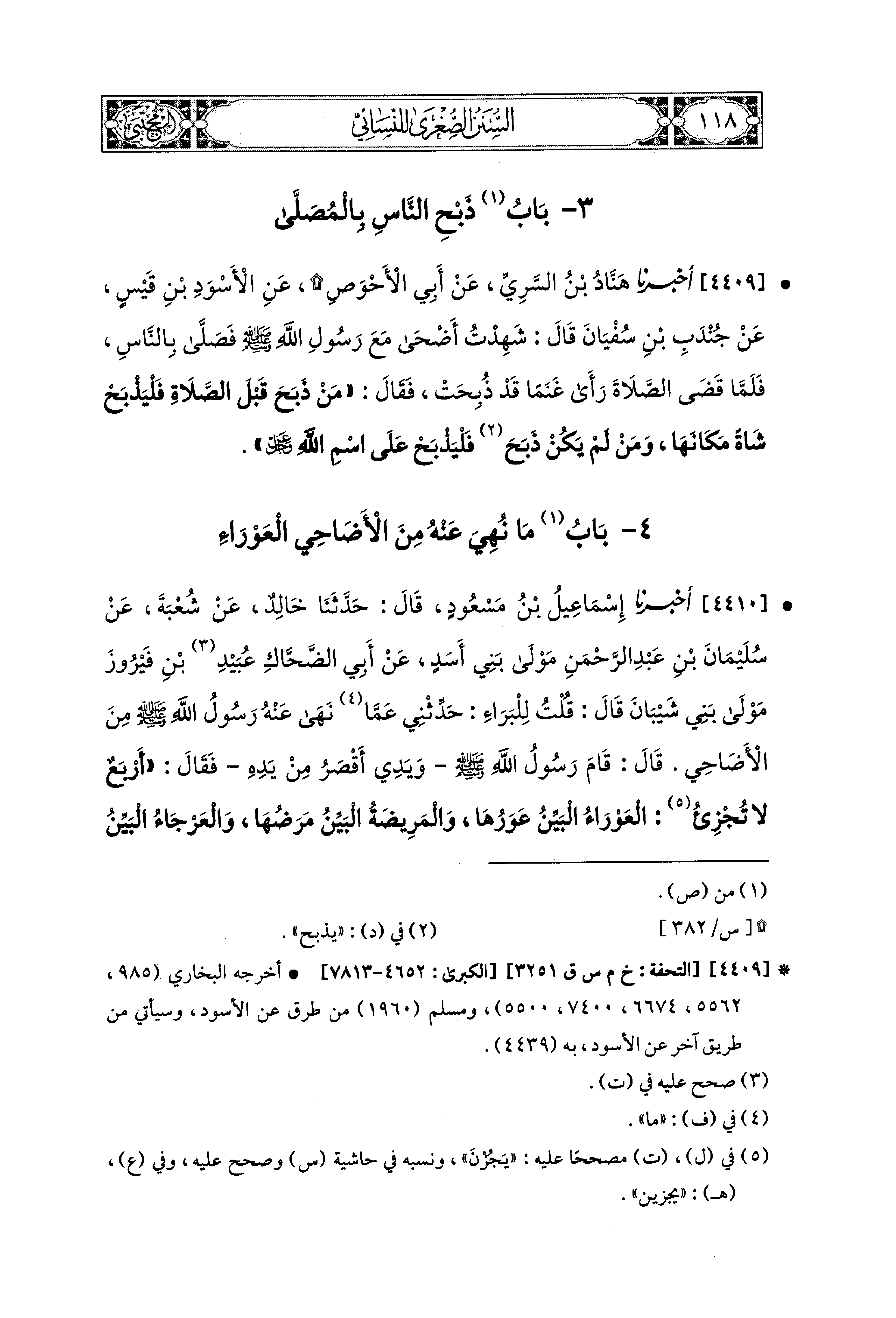 4409- أَخبَرَنا هَنَّادُ بْنُ السَّرِيِّ، عَن أَبِي الأَحْوَصِ، عَنِ الأَسْوَدِ بْنِ قَيْسٍ، عَن جُنْدُبِ بْنِ سُفْيَانَ قَالَ: شَهِدْتُ أَضْحًى مَعَ رَسُولِ اللهِ صَلى الله عَليه وسَلم، فَصَلَّى بِالنَّاسِ، فَلَمَّا قَضَى الصَّلاَةَ رَأَى غَنَمًا قَدْ ذُبِحَتْ، فَقَالَ: مَنْ ذَبَحَ قَبْلَ الصَّلاَةِ فَلْيَذْبَحْ شَاةً مَكَانَهَا، وَمَنْ لَمْ يَكُنْ ذَبَحَ فَلْيَذْبَحْ عَلَى اسْمِ اللهِ عَزَّ وَجَلَّ.