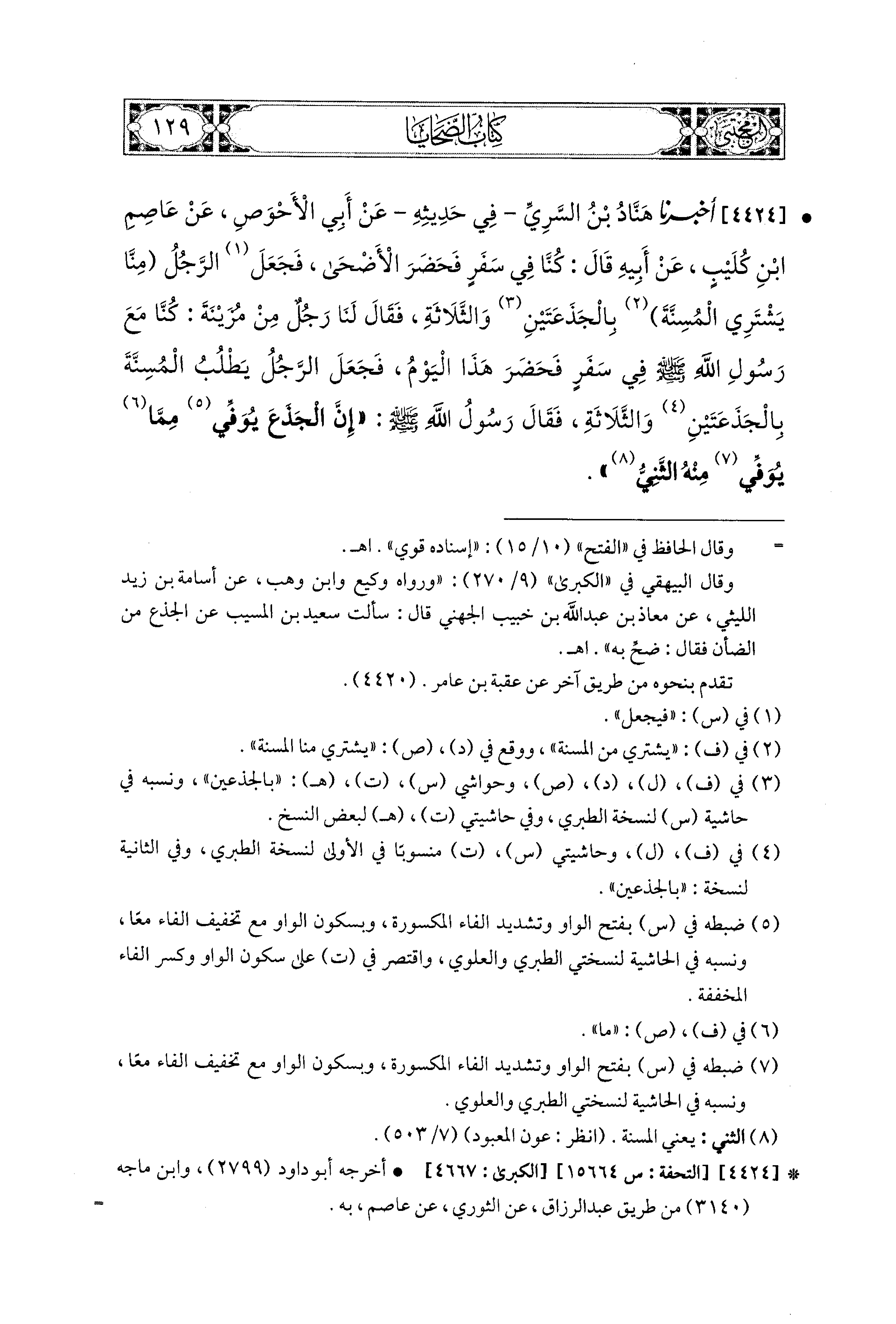 4424- أَخبَرَنا هَنَّادُ بْنُ السَّرِيِّ فِي حَدِيثِهِ، عَن أَبِي الأَحْوَصِ، عَن عَاصِمِ بْنِ كُلَيْبٍ، عَن أَبِيهِ، قَالَ: كُنَّا فِي سَفَرٍ فَحَضَرَ الأَضْحَى، فَجَعَلَ الرَّجُلُ مِنَّا يَشْتَرِي المُسِنَّةَ بِالجَذَعَتَيْنِ وَالثَّلاَثَةِ، فَقَالَ لَنَا رَجُلٌ مِنْ مُزَيْنَةَ: كُنَّا مَعَ رَسُولِ اللهِ صَلى الله عَليه وسَلم فِي سَفَرٍ، فَحَضَرَ هَذَا اليَوْمُ، فَجَعَلَ الرَّجُلُ يَطْلُبُ المُسِنَّةَ بِالجَذَعَتَيْنِ وَالثَّلاَثَةِ، فَقَالَ رَسُولُ اللهِ صَلى الله عَليه وسَلم: إِنَّ الجَذَعَ يُوفِي مِمَّا يُوفِي مِنْهُ الثَّنيُّ.