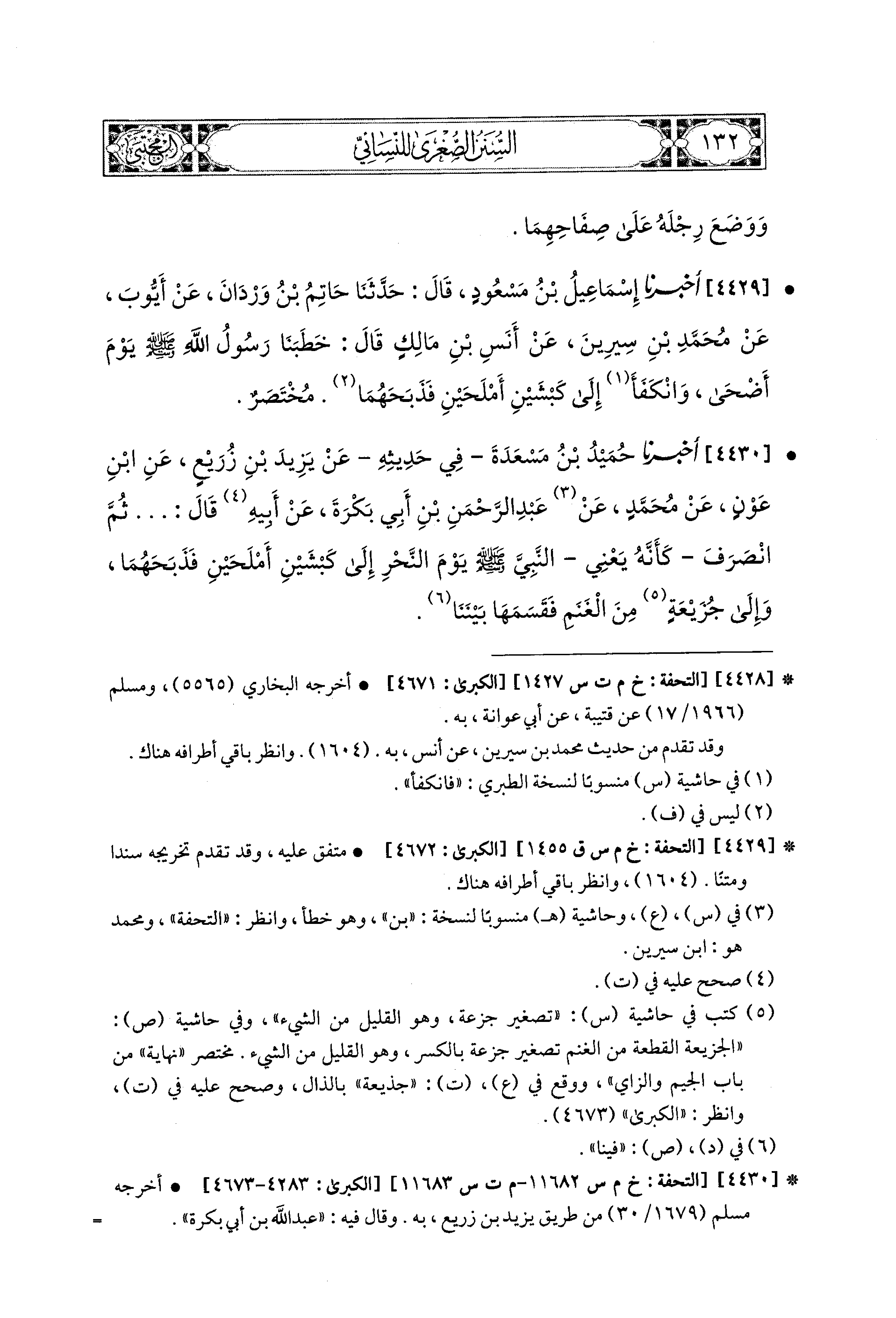 4429- أَخبَرَنا إِسماعِيلُ بْنُ مَسْعُودٍ، قال: حَدثنا حَاتِمُ بْنُ وَرْدَانَ، عَن أَيُّوبَ، عَن مُحَمدِ بْنِ سِيرِينَ، عَن أَنَسِ بْنِ مَالِكٍ قَالَ: خَطَبَنَا رَسُولُ اللهِ صَلى الله عَليه وسَلم يَوْمَ أَضْحًى، وَانْكَفَأَ إِلَى كَبْشَيْنِ أَمْلَحَيْنِ، فَذَبَحَهُمَا. مُخْتَصَرٌ.