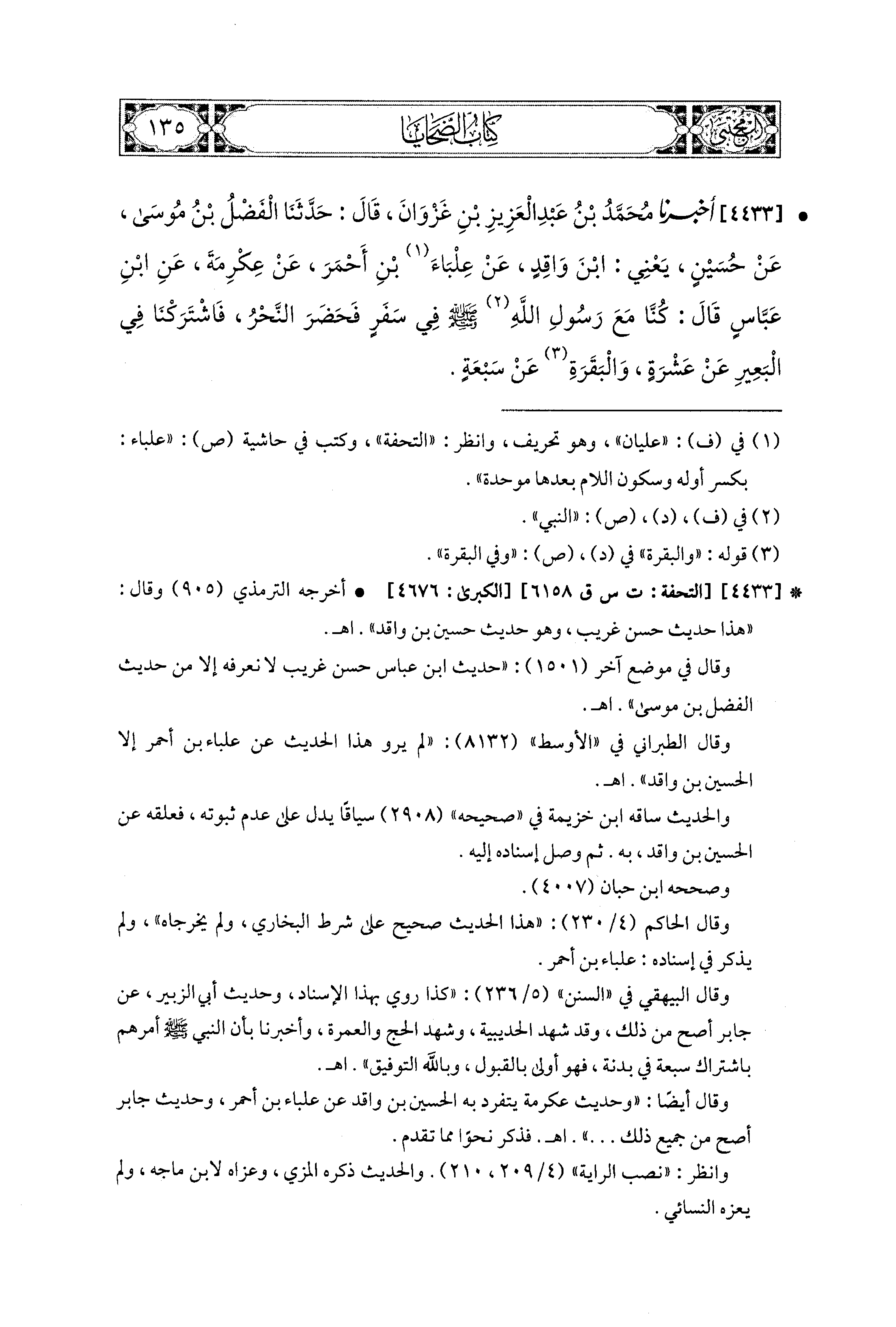 4433- أَخبَرَنا مُحَمد بْنُ عَبدِ العَزِيزِ بْنِ غَزْوَانَ، قال: حَدثنا الفَضْلُ بْنُ مُوسَى، عَن حُسَيْنٍ، يَعْني ابْنَ وَاقِدٍ، عَن عِلْبَاءَ بْنِ أَحْمَرَ، عَن عِكْرِمَةَ، عَنِ ابنِ عَبَّاسٍ، قَالَ: كُنَّا مَعَ رَسُولِ اللهِ صَلى الله عَليه وسَلم فِي سَفَرٍ، فَحَضَرَ النَّحْرُ، فَاشْتَرَكْنَا فِي البَعِيرِ عَن عَشْرَةٍ وَالبَقَرَةِ عَن سَبْعَةٍ.