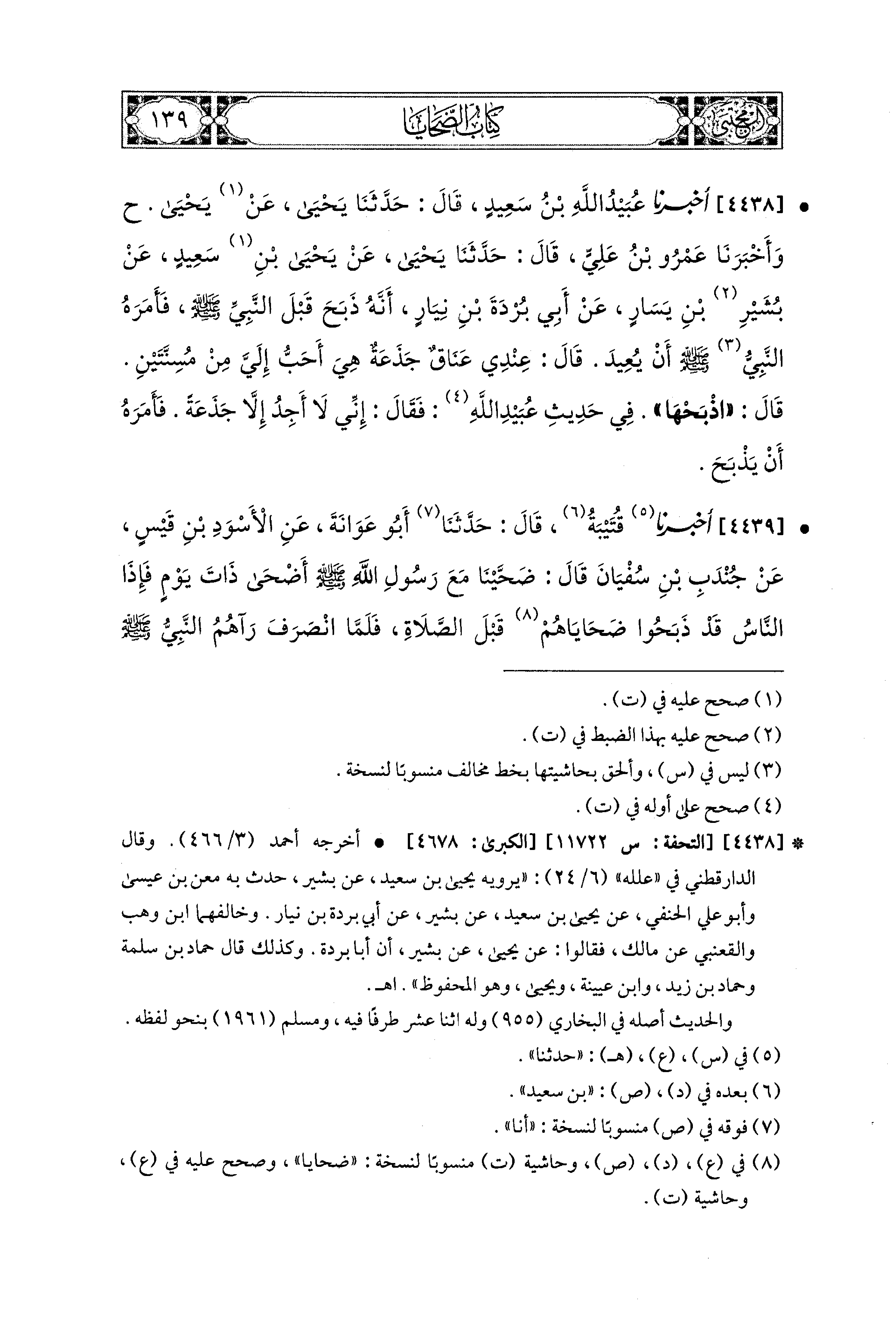 4438- أَخبَرَنا عُبَيدُ اللهِ بْنُ سَعيدٍ، قال: حَدثنا يَحيَى، عَن يَحيَى (ح) وَأَخبَرنا عَمْرُو بْنُ عَلِيٍّ، قال: حَدثنا يَحيَى، عَن يَحيَى بْنِ سَعيدٍ، عَن بُشَيْرِ بْنِ يَسَارٍ، عَن أَبِي بُرْدَةَ بْنِ نيَارٍ أَنَّهُ ذَبَحَ قَبْلَ النَّبيِّ صَلى الله عَليه وسَلم، فَأَمَرَهُ النَّبيُّ صَلى الله عَليه وسَلم أَنْ يُعيدَ، قَالَ: عِنْدِي عَنَاقُ جَذَعَةٍ هِيَ أَحَبُّ إِلَيَّ مِنْ مُسِنَّتَيْنِ، قَالَ: اذْبَحْهَا، فِي حَدِيثِ عُبَيدِ اللهِ فَقَالَ: إِنِّي لاَ أَجِدُ إِلاَّ جَذَعَةً، فَأَمَرَهُ أَنْ يَذْبَحَ.