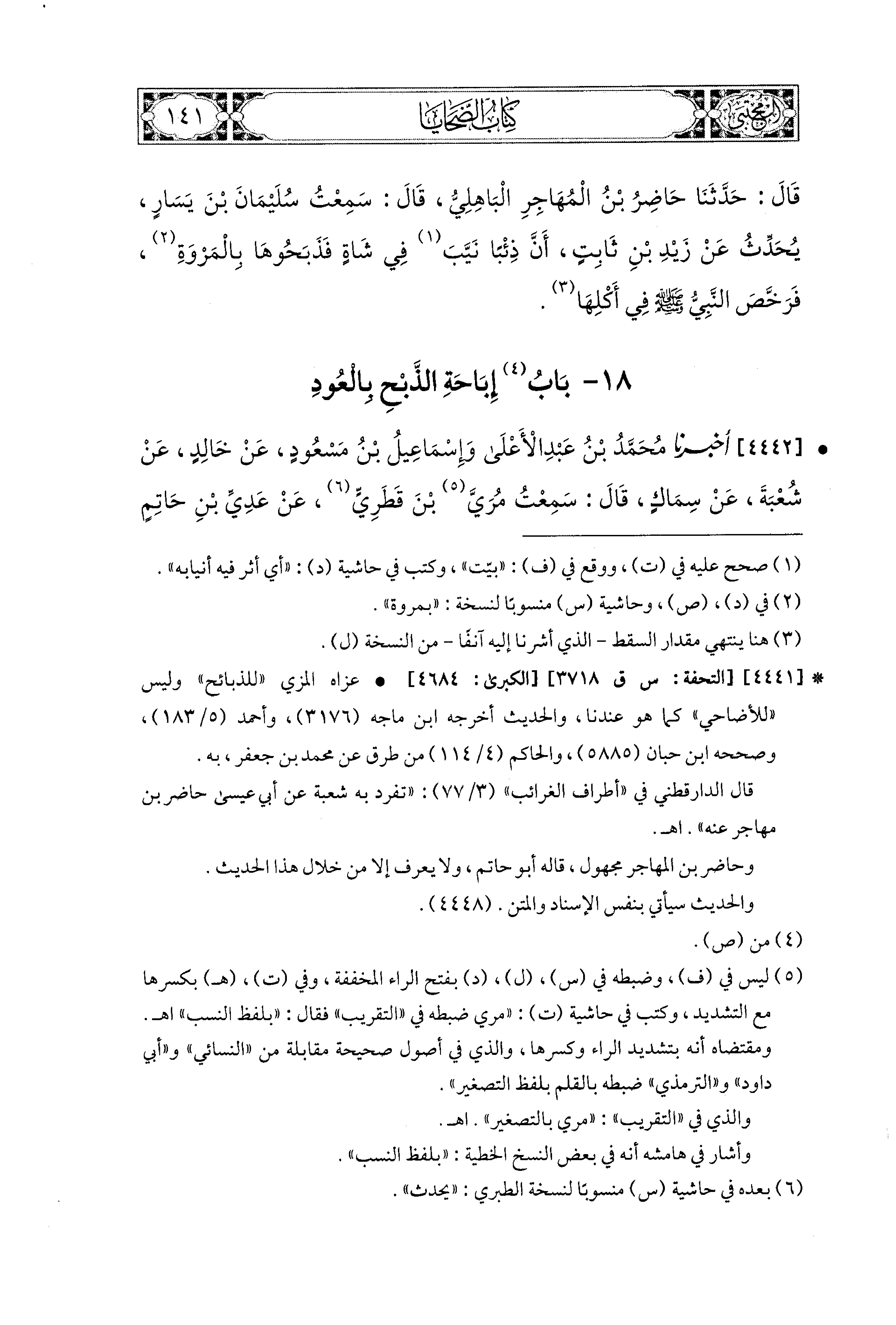 4442- أَخبَرَنا مُحَمد بن عَبدِ الأَعلَى، وَإِسماعِيلُ بْنُ مَسْعُودٍ، عَن خَالِدٍ، عَن شُعْبَةَ، عَن سِمَاكٍ، قَالَ: سَمِعْتُ مُرِّيَّ بْنَ قُطْرِيٍّ، عَن عَدِيِّ بْنِ حَاتِمٍ قَالَ: قُلْتُ: يَا رَسُولَ اللهِ، إِنِّي أُرْسِلُ كَلْبِي، فَآخُذُ الصَّيْدَ فَلاَ أَجِدُ مَا أُذَكِّيهِ بِهِ، فَأَذْبَحُهُ بِالمَرْوَةِ وَبِالعَصَا، قَالَ: أَنْهِرِ الدَّمَ بِمَا شِئْتَ، وَاذْكُرِ اسْمَ اللهِ عَزَّ وَجَلَّ.