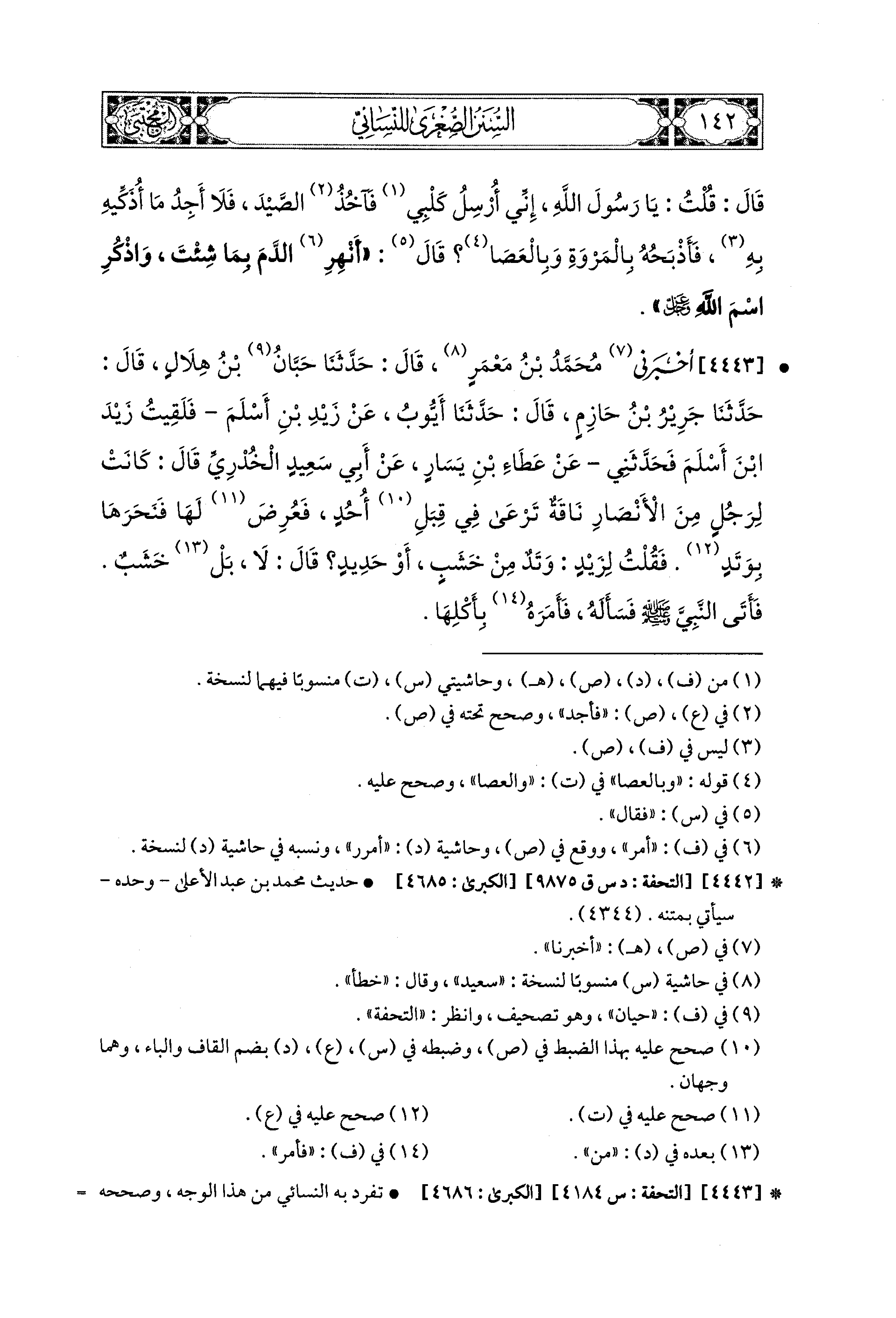 4443- أَخْبَرَني مُحَمدُ بْنُ مَعْمَرٍ، قال: حَدثنا حَبَّانُ بْنُ هِلاَلٍ، قال: حَدثنا جَرِيرُ بْنُ حَازِمٍ، قال: حَدثنا أَيُّوبُ، عَن زَيْدِ بْنِ أَسْلَمَ، فَلَقِيتُ زَيْدَ بْنَ أَسْلَمَ، فَحَدَّثَني عَن عَطَاءِ بْنِ يَسَارٍ، عَن أَبِي سَعيدٍ الخُدْرِيِّ قَالَ: كَانَتْ لِرَجُلٍ مِنَ الأَنصَارِ نَاقَةٌ تَرْعَى فِي قِبَلِ أُحُدٍ، فَعُرِضَ لَهَا، فَنَحَرَهَا بِوَتَدٍ، فَقُلْتُ لِزَيْدٍ: وَتَدٌ مِنْ خَشَبٍ، أَوْ حَدِيدٍ؟ قَالَ: لاَ، بَلْ خَشَبٌ، فَأَتَى النَّبيَّ صَلى الله عَليه وسَلم فَسَأَلَهُ: فَأَمَرَهُ بِأَكْلِهَا.