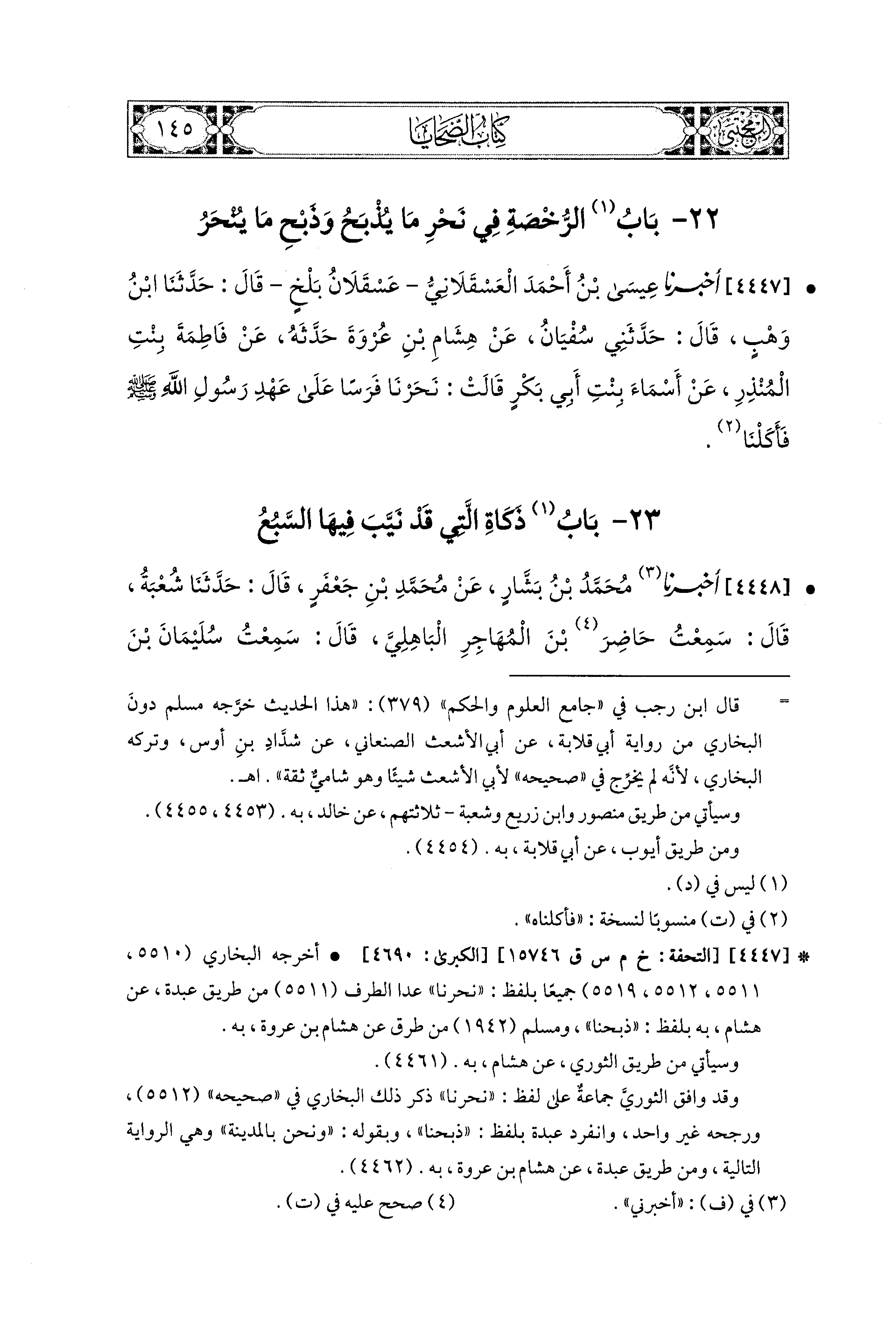 4447- أَخبَرَنا عِيسَى بْنُ أَحْمَدَ العَسْقَلاَنيُّ عَسْقَلاَنُ بَلْخٍ، قال: حَدثنا ابْنُ وَهْبٍ، قَالَ: حَدَّثَني سُفْيَانُ، عَن هِشَامِ بْنِ عُرْوَةَ حَدَّثَهُ، عَن فَاطِمَةَ بِنْتِ المُنْذِرِ، عَن أَسْمَاءَ بِنْتِ أَبِي بَكْرٍ قَالَتْ: نَحَرْنَا فَرَسًا عَلَى عَهْدِ رَسُولِ اللهِ صَلى الله عَليه وسَلم فَأَكَلْنَاهُ (1).