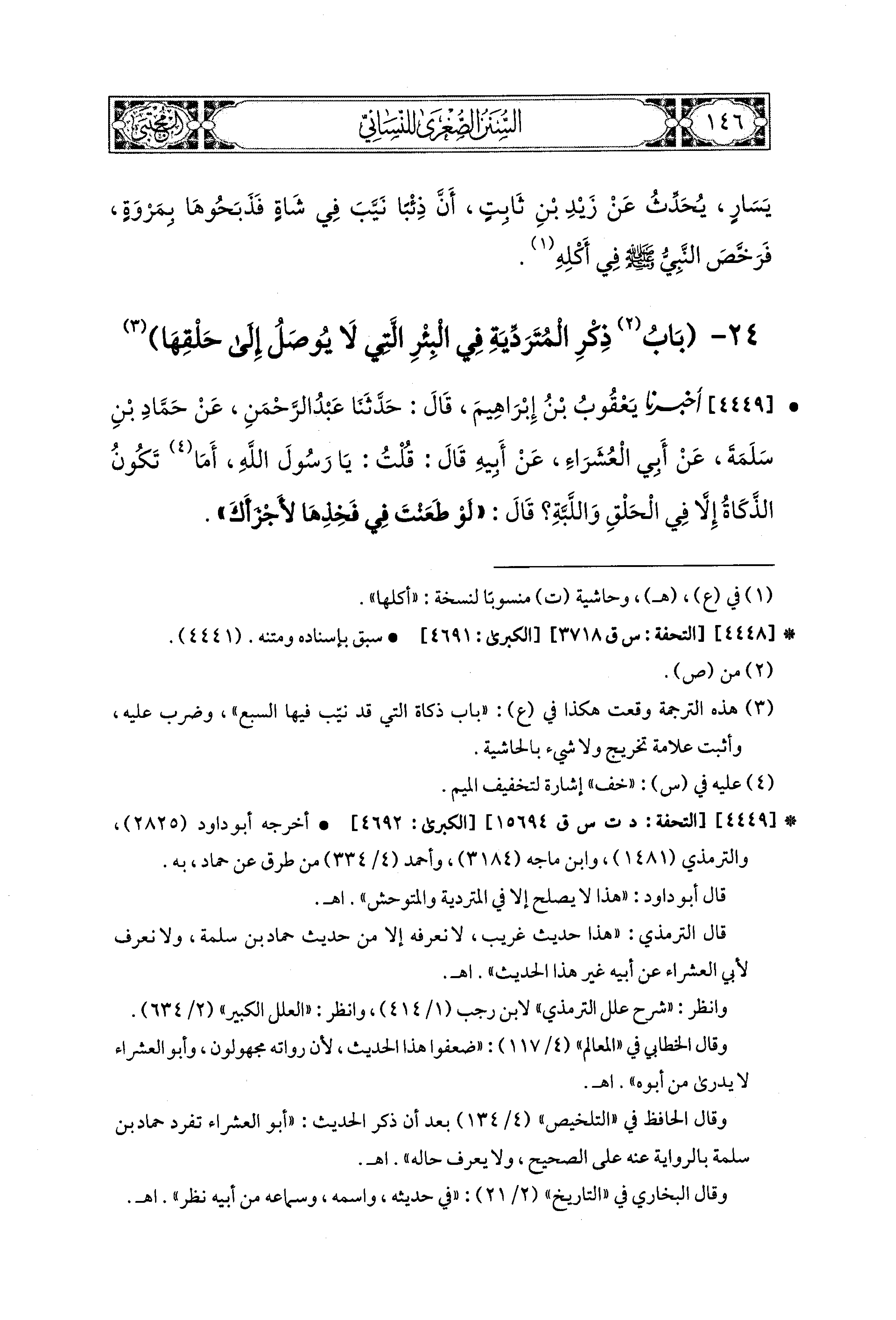 4449- أَخبَرَنا يَعْقُوبُ بْنُ إِبراهِيمَ، قال: حَدثنا عَبدُ الرَّحمَنِ، عَن حَمَّادِ بْنِ سَلَمَةَ، عَن أَبِي العُشَرَاءِ، عَن أَبِيهِ، قَالَ: قُلْتُ: يَا رَسُولَ اللهِ، أَمَا تَكُونُ الذَّكَاةُ إِلاَّ فِي الحَلْقِ وَاللَّبَّةِ؟ قَالَ: لَوْ طَعَنْتَ فِي فَخِذِهَا لأَجْزَأَكَ.