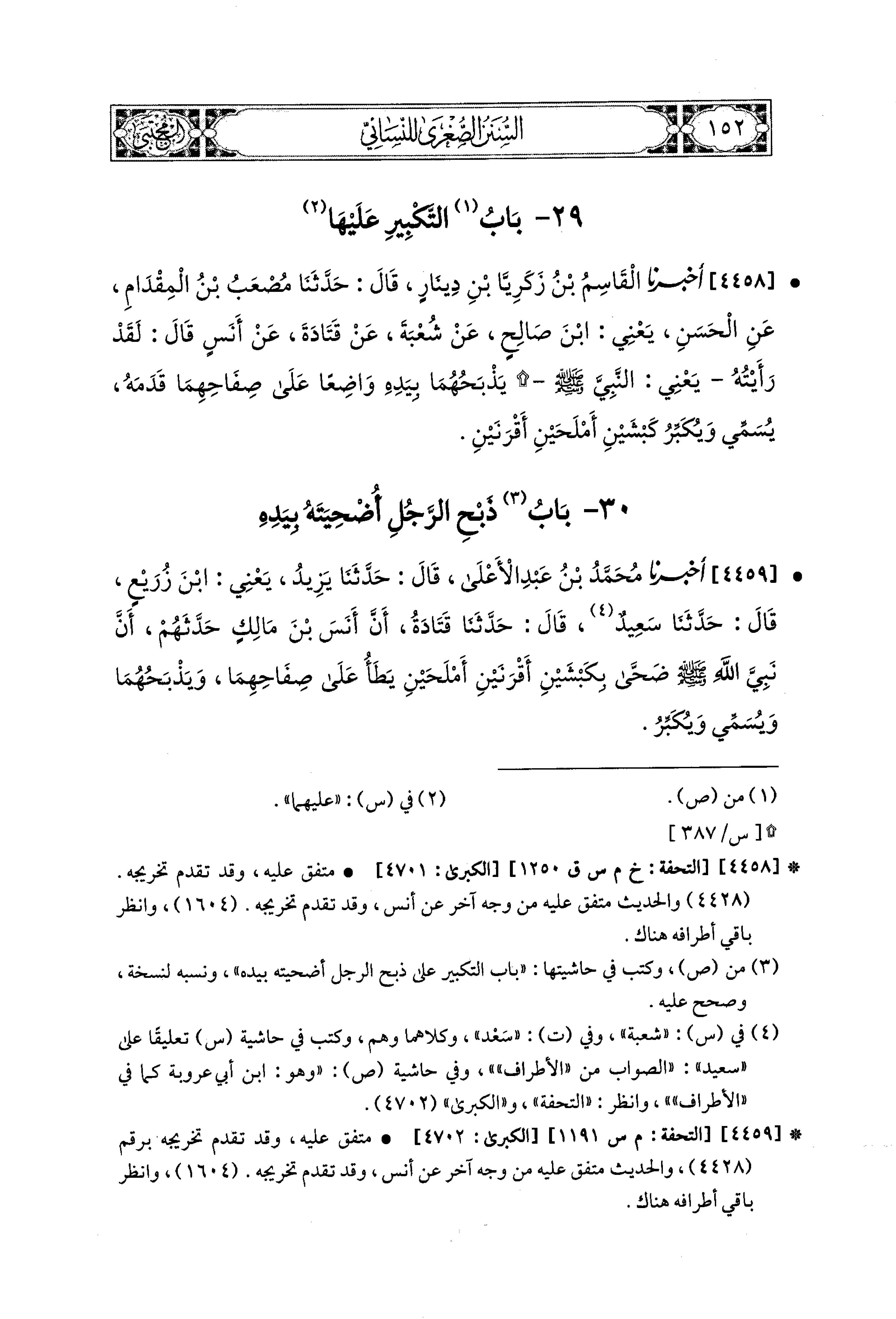 4458- أَخبَرَنا القَاسِمُ بْنُ زَكَرِيَّا بْنِ دِينَارٍ، قال: حَدثنا مُصْعَبُ بْنُ المِقْدَامِ، عَنِ الحَسَنِ، يَعْني ابْنَ صَالِحٍ، عَن شُعْبَةَ، عَن قَتَادَةَ، عَن أَنَسٍ قَالَ: لَقَدْ رَأَيْتُهُ، يَعْني النَّبيَّ صَلى الله عَليه وسَلم، يَذْبَحُهُمَا بِيَدِهِ وَاضِعًا عَلَى صِفَاحِهِمَا قَدَمَهُ، يُسَمِّي وَيُكَبِّرُ، كَبْشَيْنِ أَمْلَحَيْنِ أَقْرَنَيْنِ.