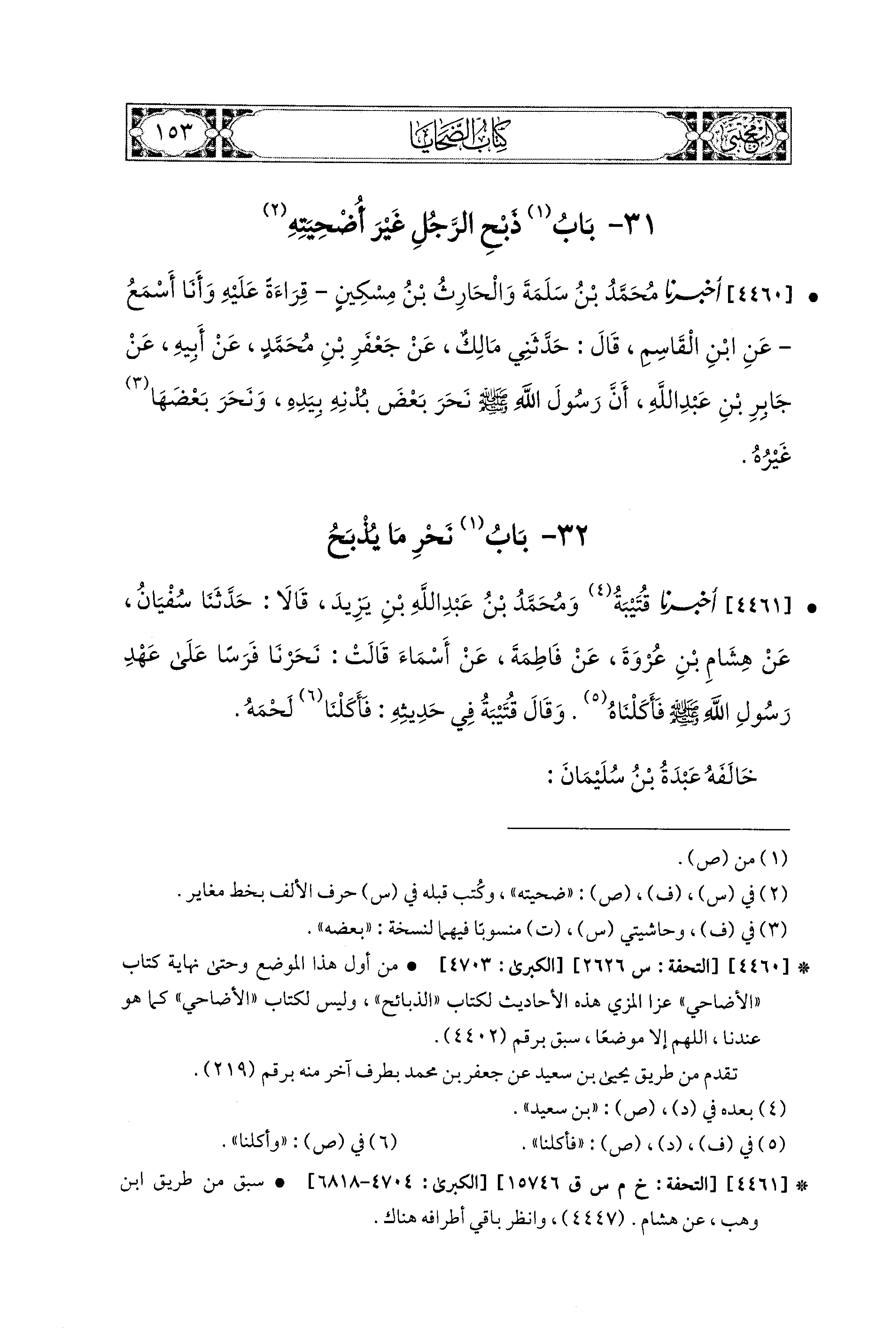 4460- أَخبَرَنا مُحَمد بْنُ سَلَمَةَ، وَالحَارِثُ بْنُ مِسْكِينٍ، قِرَاءَةً عَلَيْهِ وَأَنَا أَسْمَعُ، عَنِ ابنِ القَاسِمِ، قَالَ: حَدَّثَني مَالِكٌ، عَن جَعْفَرِ بْنِ مُحَمدٍ، عَن أَبِيهِ، عَن جَابِرِ بْنِ عَبدِ اللهِ، أَنَّ رَسُولَ اللهِ صَلى الله عَليه وسَلم: نَحَرَ بَعْضَ بُدْنِهِ بِيَدِهِ، وَنَحَرَ بَعْضَهَا غَيْرُهُ.