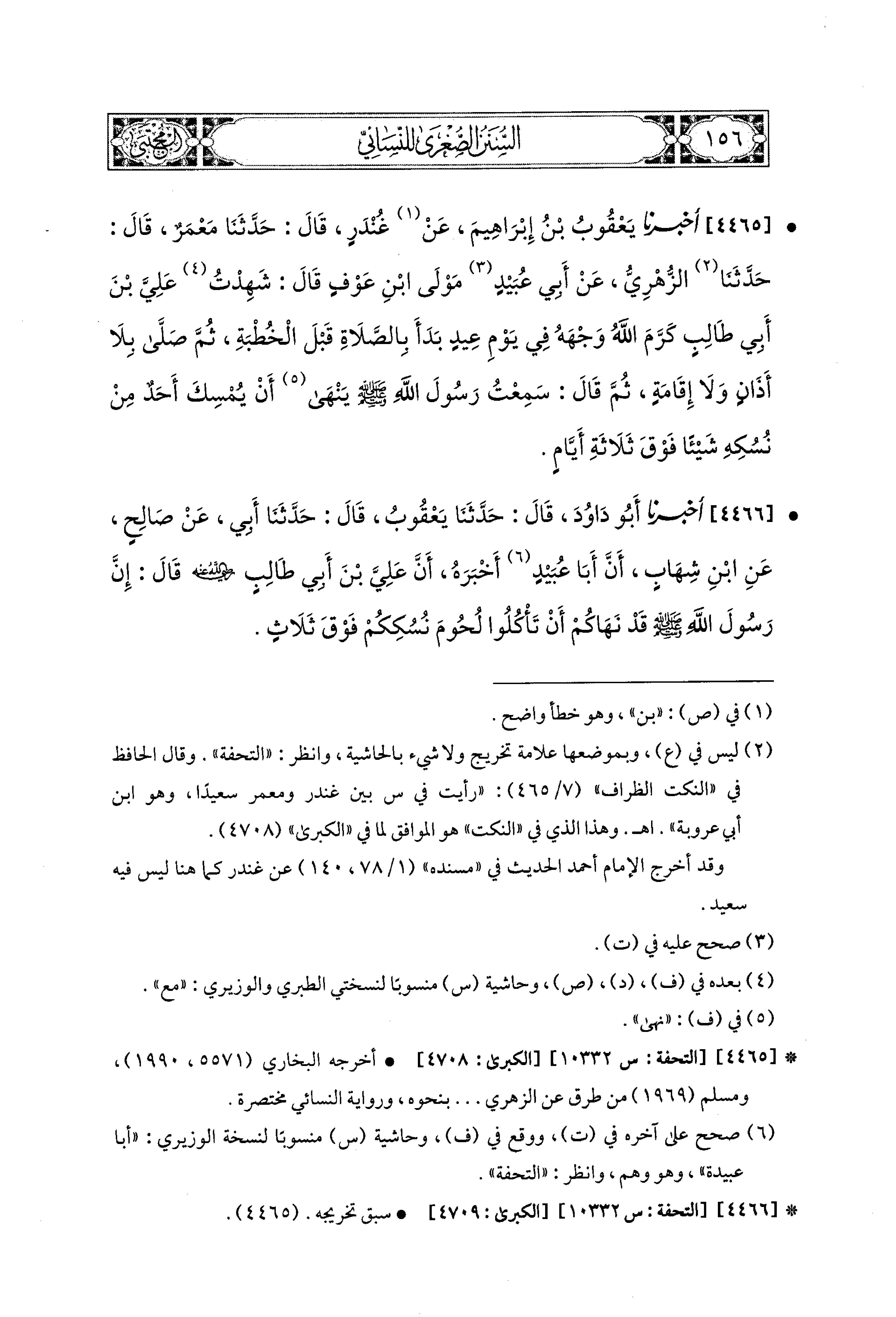 4465- أَخبَرَنا يَعْقُوبُ بْنُ إِبراهِيمَ، عَن غُنْدَرٍ، قال: حَدثنا مَعْمَرٌ، قال: حَدثنا الزُّهْرِيُّ، عَن أَبِي عُبَيدٍ، مَوْلَى ابنِ عَوْفٍ قَالَ: شَهِدْتُ عَلِيَّ بْنَ أَبِي طَالِبٍ كَرَّمَ اللهُ وَجْهَهُ فِي يَوْمِ عيدٍ، بَدَأَ بِالصَّلاَةِ قَبْلَ الخُطْبَةِ، ثُمَّ صَلَّى بِلاَ أَذَانٍ وَلاَ إِقَامَةٍ، ثُمَّ، قَالَ: سَمِعْتُ رَسُولَ اللهِ صَلى الله عَليه وسَلم: يَنْهَى أَنْ يُمْسِكَ أَحَدٌ مِنْ نُسُكِهِ شَيْئًا فَوْقَ ثَلاَثَةِ أَيَّامٍ.