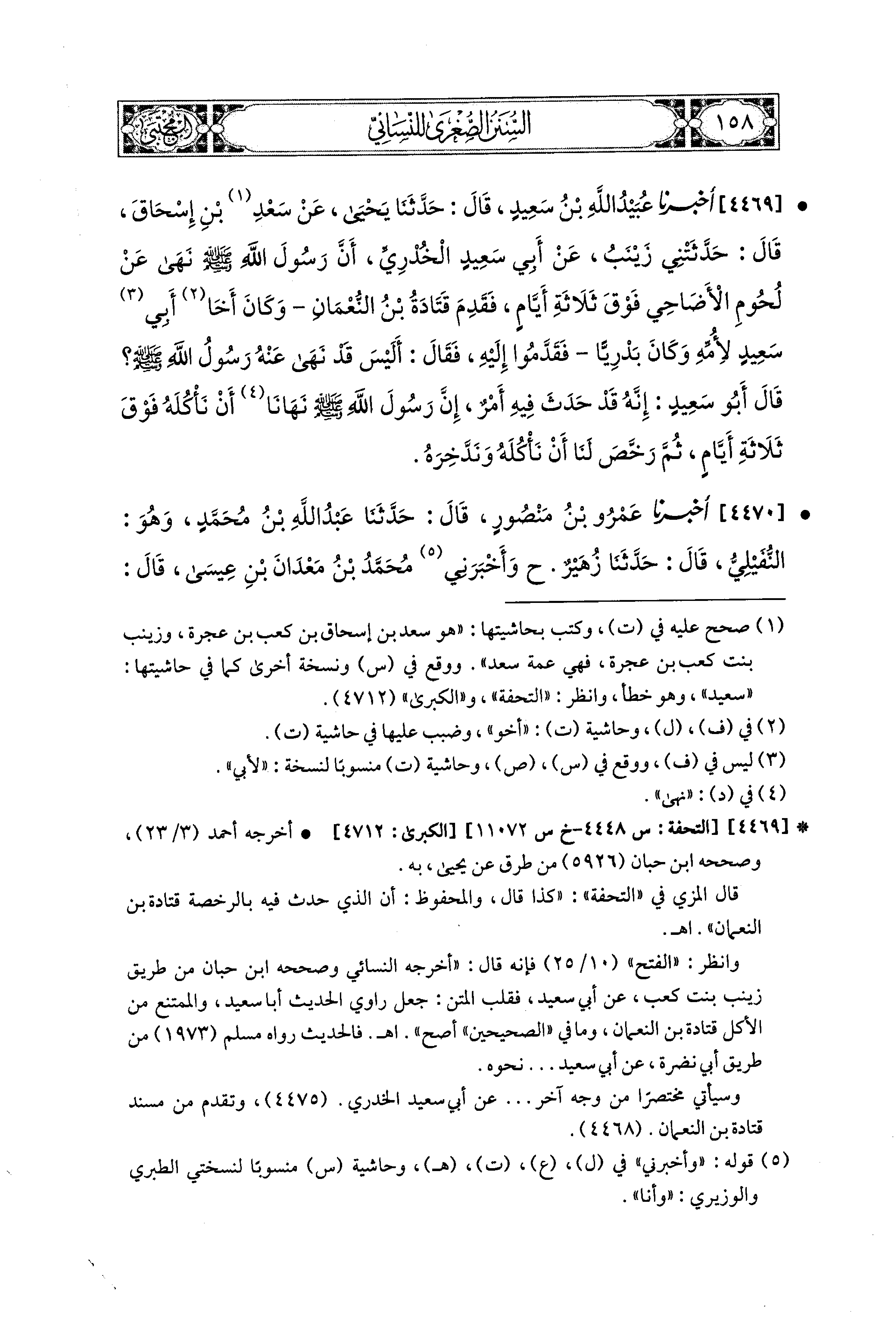 4469- أَخبَرَنا عُبَيدُ اللهِ بْنُ سَعيدٍ، قال: حَدثنا يَحيَى، عَن سَعْدِ بْنِ إِسحَاقَ قَالَ: حَدَّثَتْني زَيْنَبُ، عَن أَبِي سَعيدٍ الخُدْرِيِّ، أَنَّ رَسُولَ اللهِ صَلى الله عَليه وسَلم نَهَى عَن لُحُومِ الأَضَاحِيِّ فَوْقَ ثَلاَثَةِ أَيَّامٍ، فَقَدِمَ قَتَادَةُ بْنُ النُّعْمَانِ وَكَانَ أَخَا أَبِي سَعيدٍ لأُمِّهِ وَكَانَ بَدْرِيًّا، فَقَدَّمُوا إِلَيْهِ، فَقَالَ: أَلَيْسَ قَدْ نَهَى عَنْهُ رَسُولُ اللهِ صَلى الله عَليه وسَلم؟ قَالَ أَبو سَعيدٍ: إِنَّهُ قَدْ حَدَثَ فِيهِ أَمْرٌ, إِنَّ رَسُولَ اللهِ صَلى الله عَليه وسَلم نَهَانَا أَنْ نَأْكُلَهُ فَوْقَ ثَلاَثَةِ أَيَّامٍ، ثُمَّ رَخَّصَ لَنَا أَنْ نَأْكُلَهُ، وَنَدَّخِرَهُ.