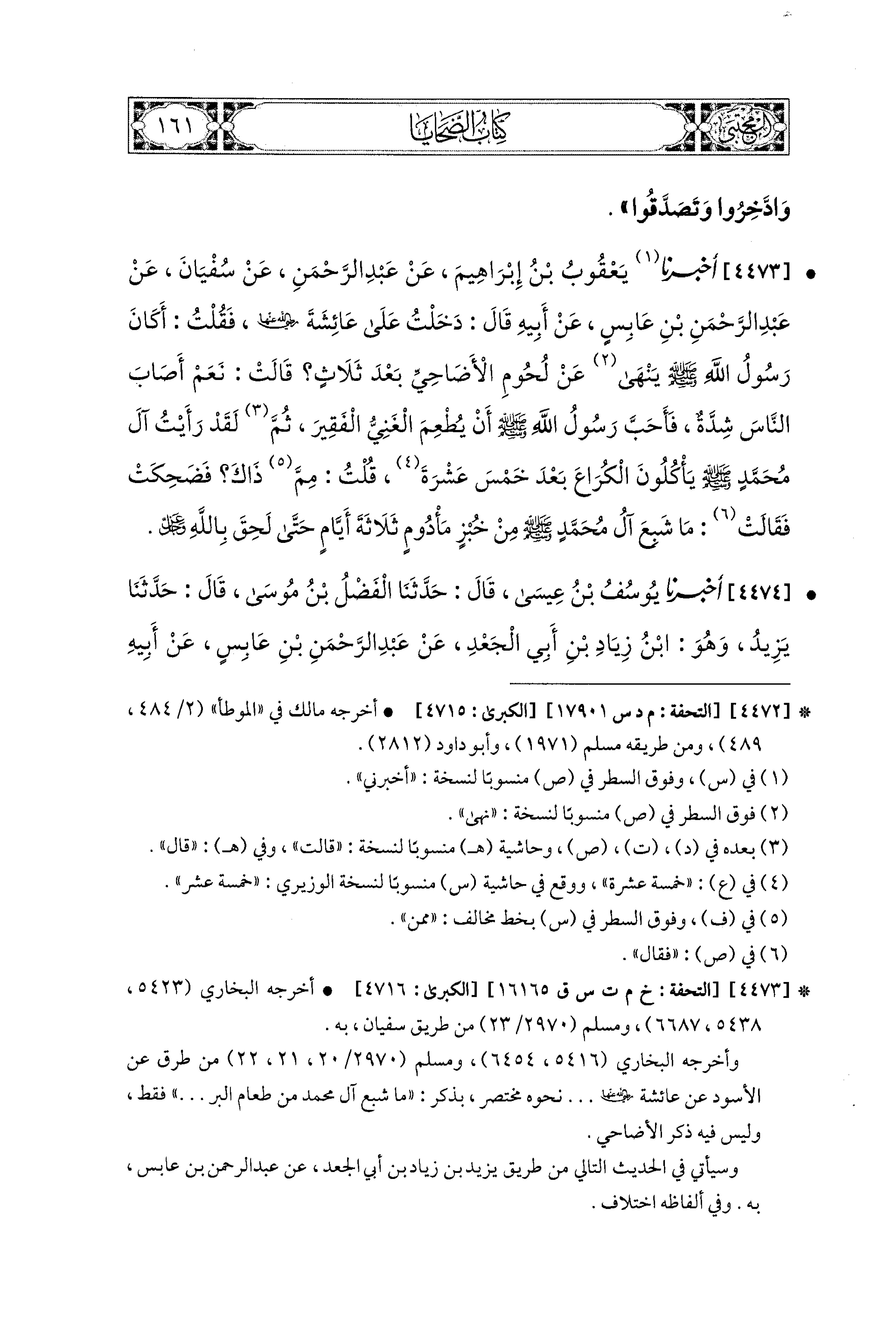 4473- أَخبَرَنا يَعْقُوبُ بْنُ إِبراهِيمَ، عَن عَبدِ الرَّحمَنِ، عَن سُفْيَانَ، عَن عَبدِ الرَّحمَنِ بْنِ عَابِسٍ، عَن أَبِيهِ، قَالَ: دَخَلْتُ عَلَى عَائِشَةَ رضي الله عنها فَقُلْتُ: أَكَانَ رَسُولُ اللهِ صَلى الله عَليه وسَلم يَنْهَى عَن لُحُومِ الأَضَاحِيِّ بَعْدَ ثَلاَثٍ؟ قَالَتْ: نَعَمْ، أَصَابَ النَّاسَ شِدَّةٌ، فَأَحَبَّ رَسُولُ اللهِ صَلى الله عَليه وسَلم أَنْ يُطْعِمَ الغَنيُّ الفَقِيرَ، ثُمَّ لَقَدْ رَأَيْتُ آلَ مُحَمدٍ صَلى الله عَليه وسَلم يَأْكُلُونَ الكُرَاعَ بَعْدَ خَمْسَ عَشْرَةَ، قُلْتُ: مِمَّ ذَاكَ؟ فَضَحِكَتْ، فَقَالَتْ: مَا شَبِعَ آلُ مُحَمدٍ صَلى الله عَليه وسَلم مِنْ خُبْزٍ مَأْدُومٍ ثَلاَثَةَ أَيَّامٍ حَتَّى لَحِقَ بِالله عَزَّ وَجَلَّ.
