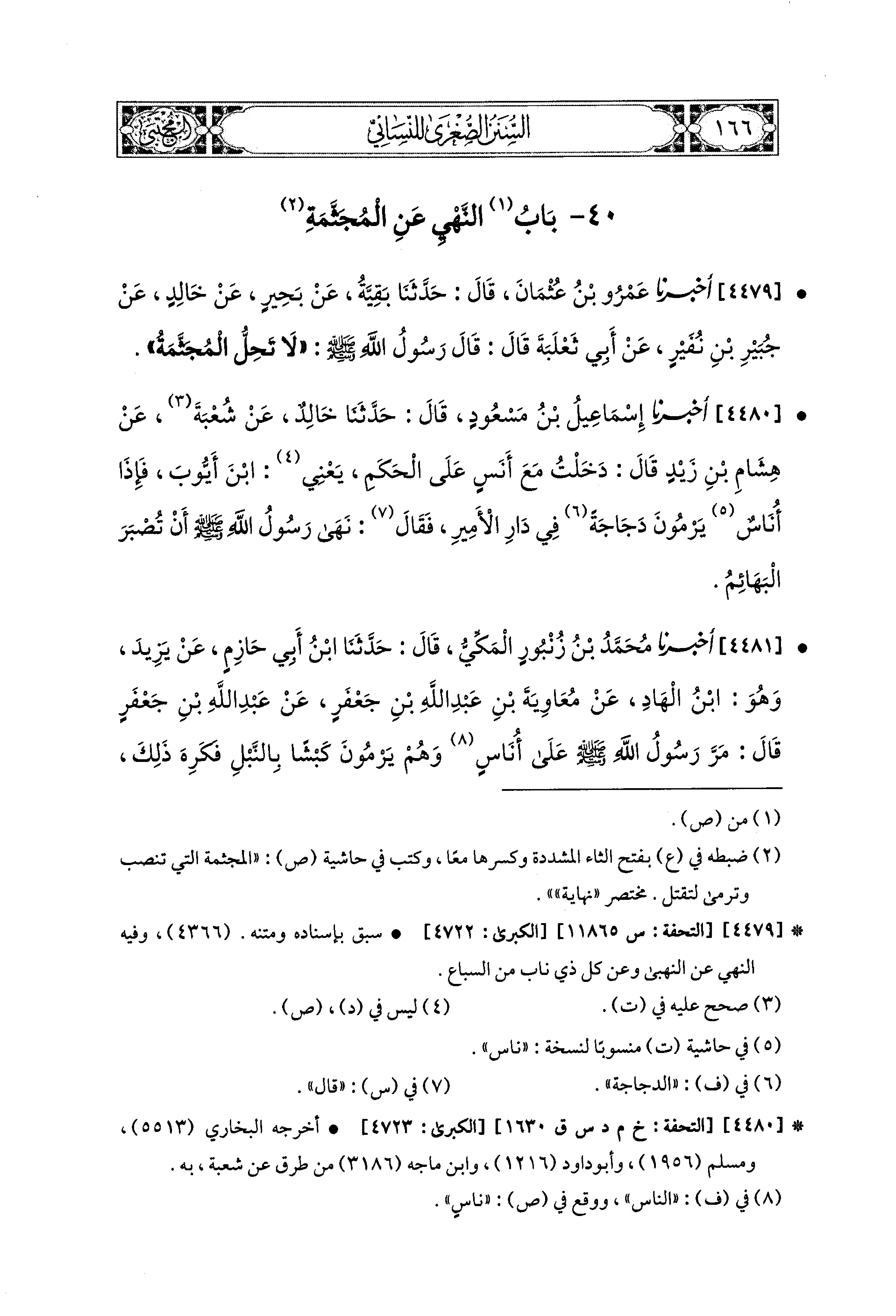 4481- أَخبَرَنا مُحَمد بْنُ زُنْبُورٍ المَكِّيُّ، قال: حَدثنا ابْنُ أَبِي حَازِمٍ، عَن يَزِيدَ، وَهُوَ ابْنُ الهَادِ، عَن مُعَاوِيَةَ بْنِ عَبدِ اللهِ بْنِ جَعْفَرٍ، عَن عَبد اللهِ بن جَعْفَرٍ قَالَ: مَرَّ رَسُولُ اللهِ صَلى الله عَليه وسَلم عَلَى أُنَاسٍ وَهُمْ يَرْمُونَ كَبْشًا بِالنَّبْلِ، فَكَرِهَ ذَلِكَ، وَقَالَ: لاَ تَمْثُلُوا بِالبَهَائِمِ.