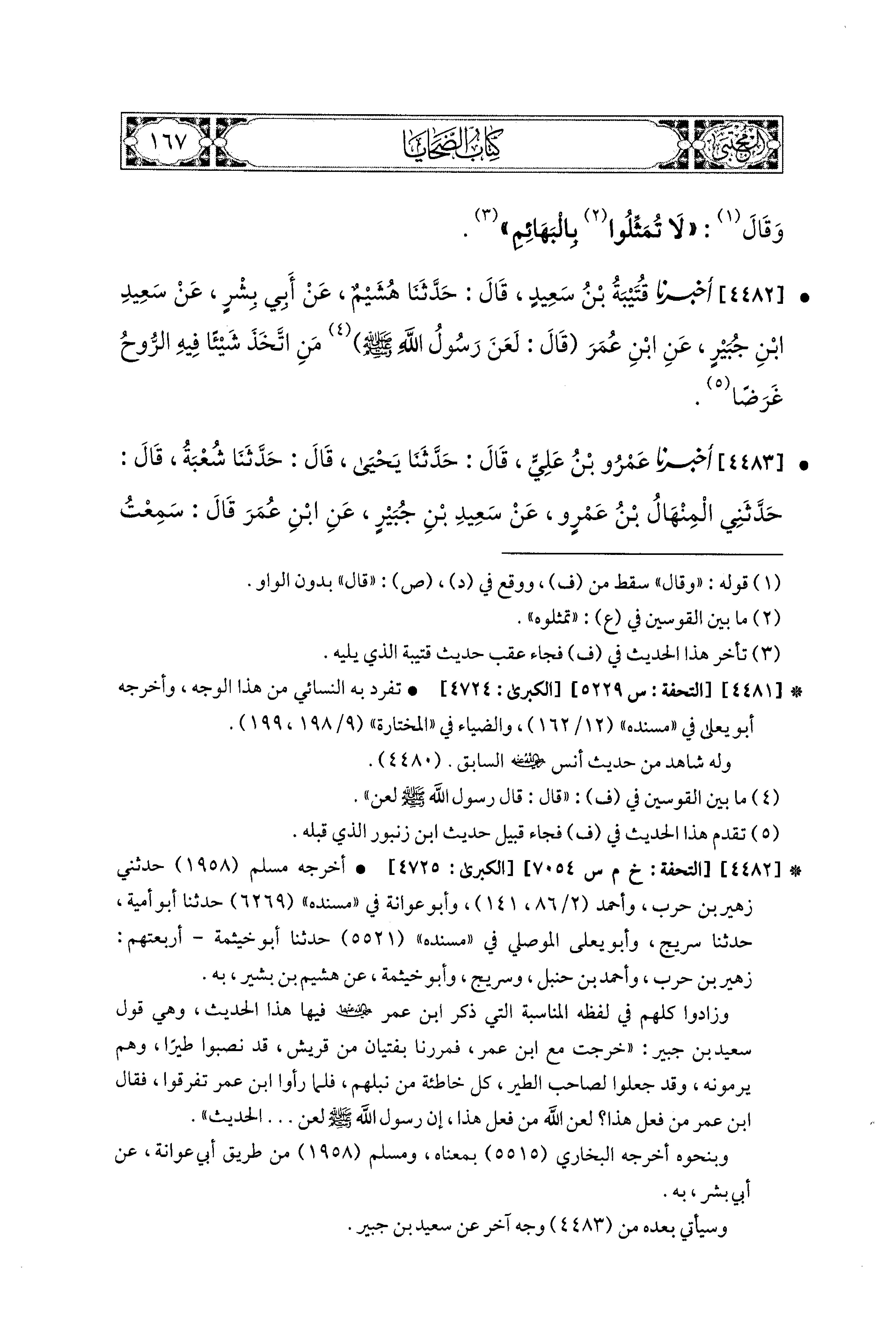 4483- أَخبَرَنا عَمْرُو بْنُ عَلِيٍّ، قال: حَدثنا يَحيَى، قال: حَدثنا شُعْبَةُ، قَالَ: حَدَّثَني المِنْهَالُ بْنُ عَمْرٍو، عَن سَعيدِ بْنِ جُبَيْرٍ، عَنِ ابنِ عُمَرَ، قَالَ: سَمِعْتُ رَسُولَ اللهِ صَلى الله عَليه وسَلم يَقُولُ: لَعَنَ اللهُ مَنْ مَثَّلَ بِالحَيَوَانِ.
