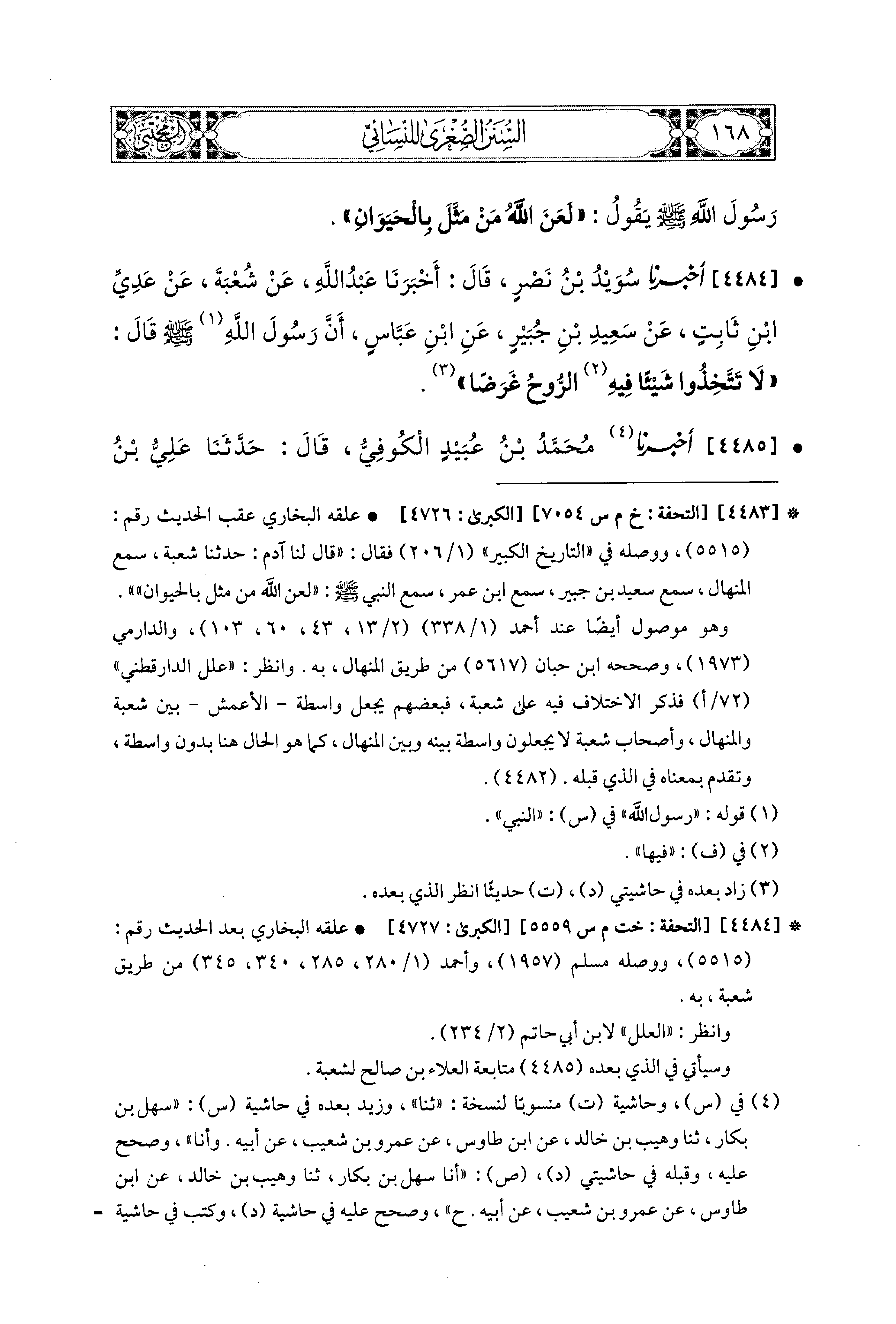4484- أَخبَرَنا سُوَيْدُ بْنُ نَصْرٍ، قَالَ: أَخبَرنا عَبدُ اللهِ، عَن شُعْبَةَ، عَن عَدِيِّ بْنِ ثَابِتٍ، عَن سَعيدِ بْنِ جُبَيْرٍ، عَنِ ابنِ عَبَّاسٍ، أَنَّ رَسُولَ اللهِ صَلى الله عَليه وسَلم قَالَ: لاَ تَتَّخِذُوا شَيْئًا فِيهِ الرُّوحُ غَرَضًا.