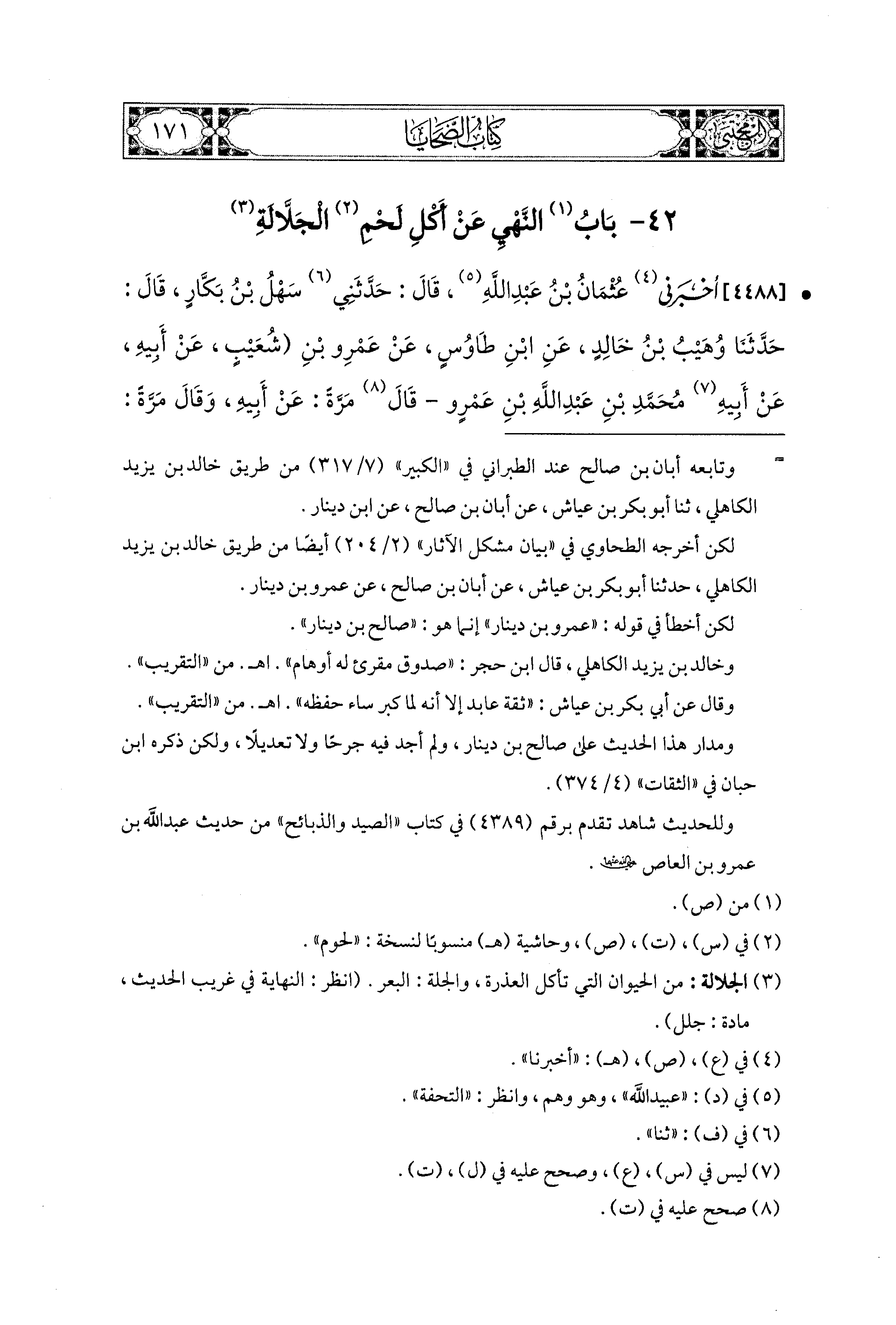 4488- أَخْبَرَني عُثمَانُ بْنُ عَبدِ اللهِ، قَالَ: حَدَّثَني سَهْلُ بْنُ بَكَّارٍ، قال: حَدثنا وُهَيْبُ بْنُ خَالِدٍ، عَنِ ابنِ طَاوُوسٍ، عَن عَمْرِو بْنِ شُعَيبٍ، عَن أَبِيهِ، عَن أَبِيهِ مُحَمدِ بْنِ عَبدِ اللهِ بْنِ عَمْرٍو، قَالَ مَرَّةً: عَن أَبِيهِ، وَقَالَ مَرَّةً: عَن جَدِّهِ، أَنَّ رَسُولَ اللهِ صَلى الله عَليه وسَلم نَهَى يَوْمَ خَيْبَرَ عَن لُحُومِ الحُمُرِ الأَهْلِيَّةِ، وَعَنِ الجَلاَّلَةِ، وَعَنْ رُكُوبِهَا، وَعَنْ أَكْلِ لَحْمِهَا.