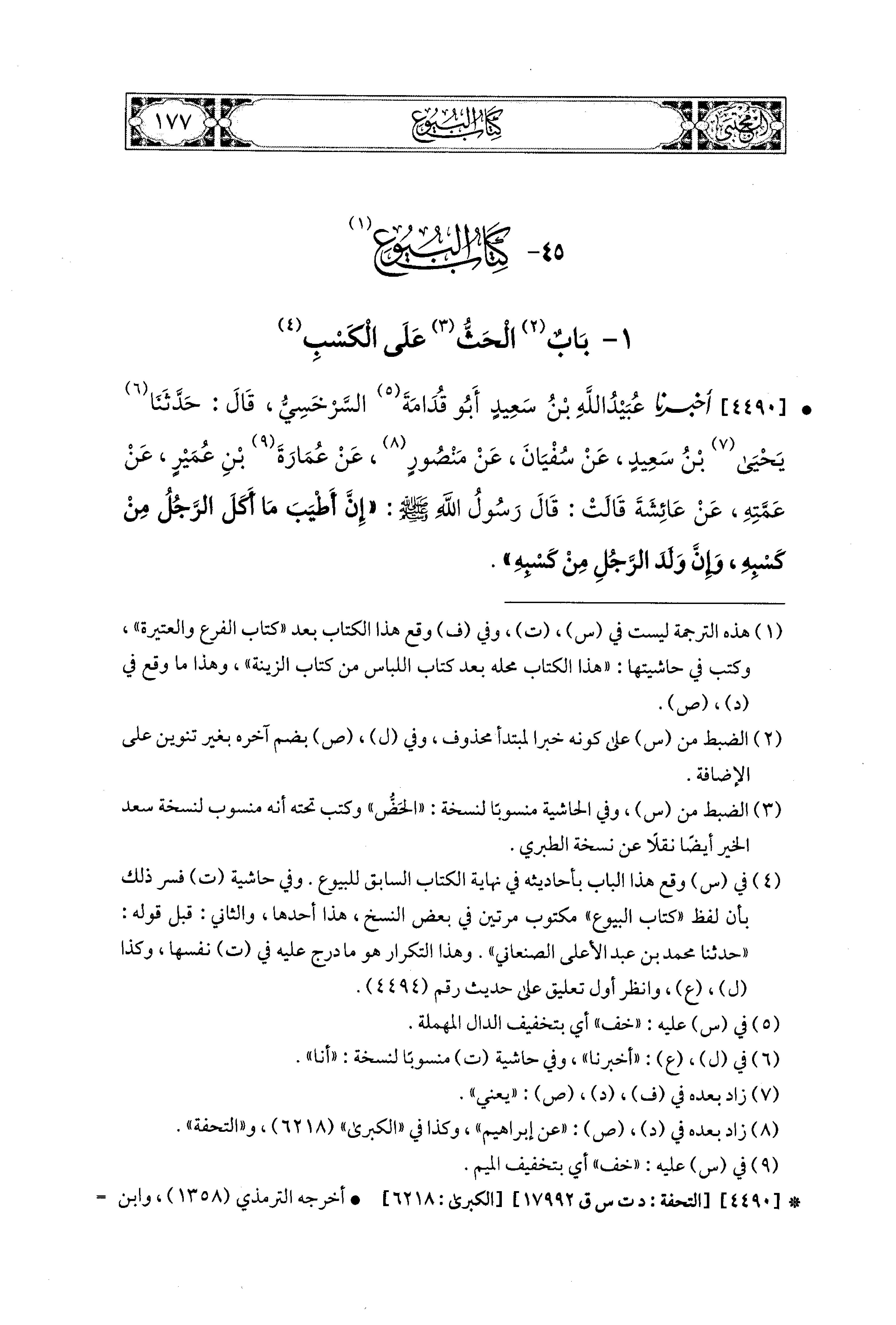 4490 - أَخبَرَنا عُبَيدُ اللهِ بْنُ سَعيدٍ، أَبو قُدَامَةَ السَّرْخَسِيُّ، قال: حَدثنا يَحيَى بْنُ سَعيدٍ، عَن سُفْيَانَ، عَن مَنْصُورٍ، عَن إِبراهِيمَ (1) , عَن عُمَارَةَ بْنِ عُمَيْرٍ، عَن عَمَّتِهِ، عَن عَائِشَةَ، قَالَتْ: قَالَ رَسُولُ اللهِ صَلى الله عَليه وسَلم: إِنَّ أَطْيَبَ مَا أَكَلَ الرَّجُلُ مِنْ كَسْبِهِ، وَإِنَّ وَلَدَ الرَّجُلِ مِنْ كَسْبِهِ.