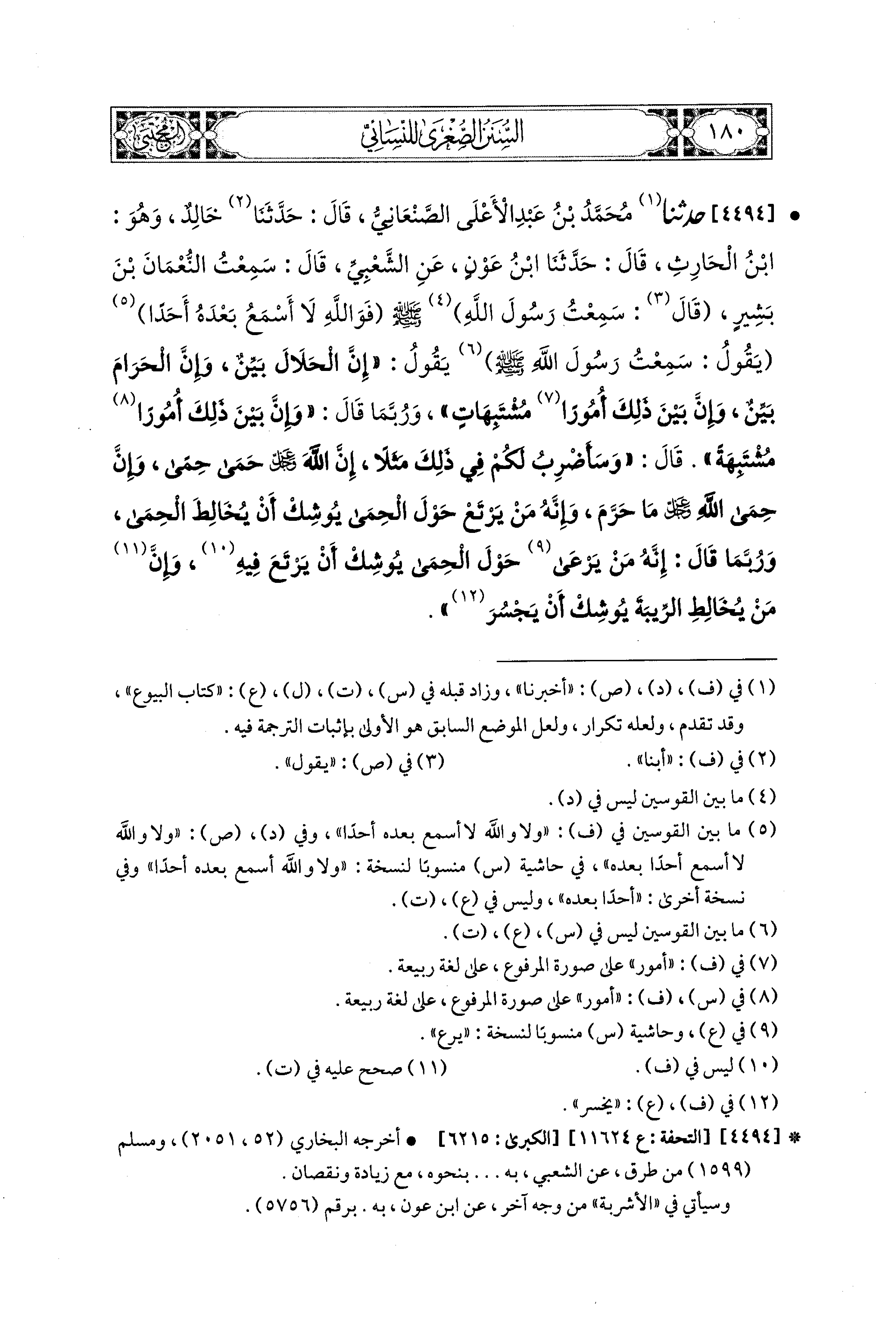 4494 - حَدَّثَنَا مُحَمدُ بن عَبدِ الأَعلَى الصَّنْعَانيُّ، قال: حَدثنا خَالِدٌ، وَهُوَ ابْنُ الحَارِثِ، قال: حَدثنا ابْنُ عَوْنٍ، عَنِ الشَّعْبِيِّ، قَالَ: سَمِعْتُ النُّعْمَانَ بْنَ بَشِيرٍ، قَالَ: سَمِعْتُ رَسُولَ اللهِ صَلى الله عَليه وسَلم، فَوَالله لاَ أَسْمَعُ بَعْدَهُ أَحَدًا، يَقُولُ: سَمِعْتُ رَسُولَ اللهِ صَلى الله عَليه وسَلم يَقُولُ: إِنَّ الحَلاَلَ بَيِّنٌ، وَإِنَّ الحَرَامَ بَيِّنٌ، وَإِنَّ بَيْنَ ذَلِكَ أُمُورًا مُشْتَبِهَاتٍ، وَرُبَّمَا قَالَ: وَإِنَّ بَيْنَ ذَلِكَ أُمُورًا مُشْتَبِهَةً، قَالَ: وَسَأَضْرِبُ لَكُمْ فِي ذَلِكَ مَثَلاً إِنَّ اللهَ عَزَّ وَجَلَّ حَمَى حِمًى، وَإِنَّ حِمَى اللهِ عَزَّ وَجَلَّ مَا حَرَّمَ، وَإِنَّهُ مَنْ يَرْتَعُ حَوْلَ الحِمَى يُوشِكُ أَنْ يُخَالِطَ الحِمَى، وَرُبَّمَا قَالَ: إِنَّهُ مَنْ يَرْعَى حَوْلَ الحِمَى يُوشِكُ أَنْ يُرْتِعَ فِيهِ، وَإِنَّ مَنْ يُخَالِطِ الرِّيبَةَ يُوشِكُ أَنْ يَجْسُرَ.