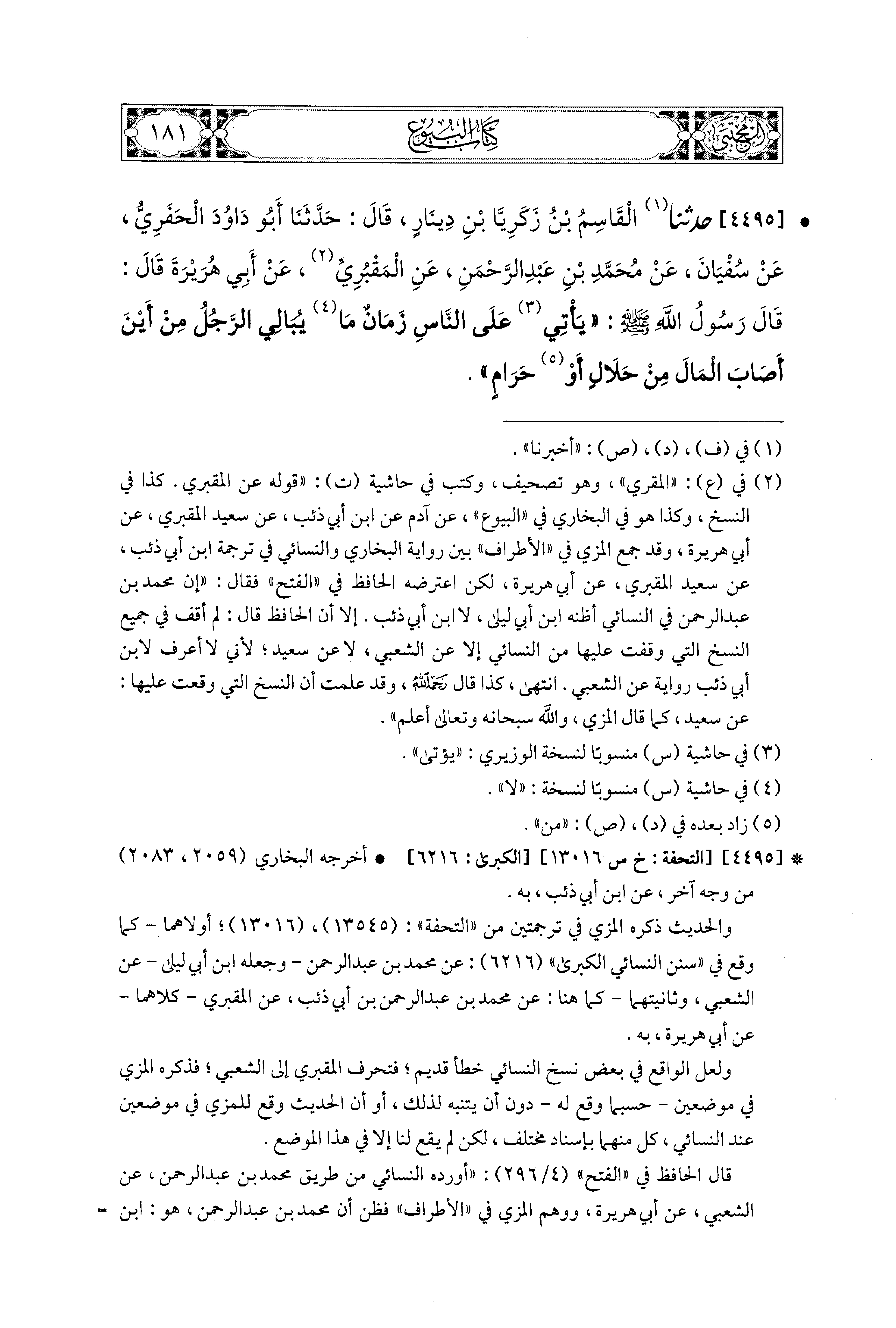 4495 - حَدَّثَنَا القَاسِمُ بْنُ زَكَرِيَّا بْنِ دِينَارٍ، قال: حَدثنا أَبو دَاوُدَ الحَفْرِيُّ، عَن سُفْيَانَ، عَن مُحَمدِ بْنِ عَبدِ الرَّحمَنِ، عَنِ المَقْبُرِيِّ، عَن أَبِي هُرَيرَةَ قَالَ: قَالَ رَسُولُ اللهِ صَلى الله عَليه وسَلم: يَأْتِي عَلَى النَّاسِ زَمَانٌ مَا يُبَالِي الرَّجُلُ مِنْ أَيْنَ أَصَابَ المَالَ مِنْ حَلاَلٍ، أَوْ حَرَامٍ.