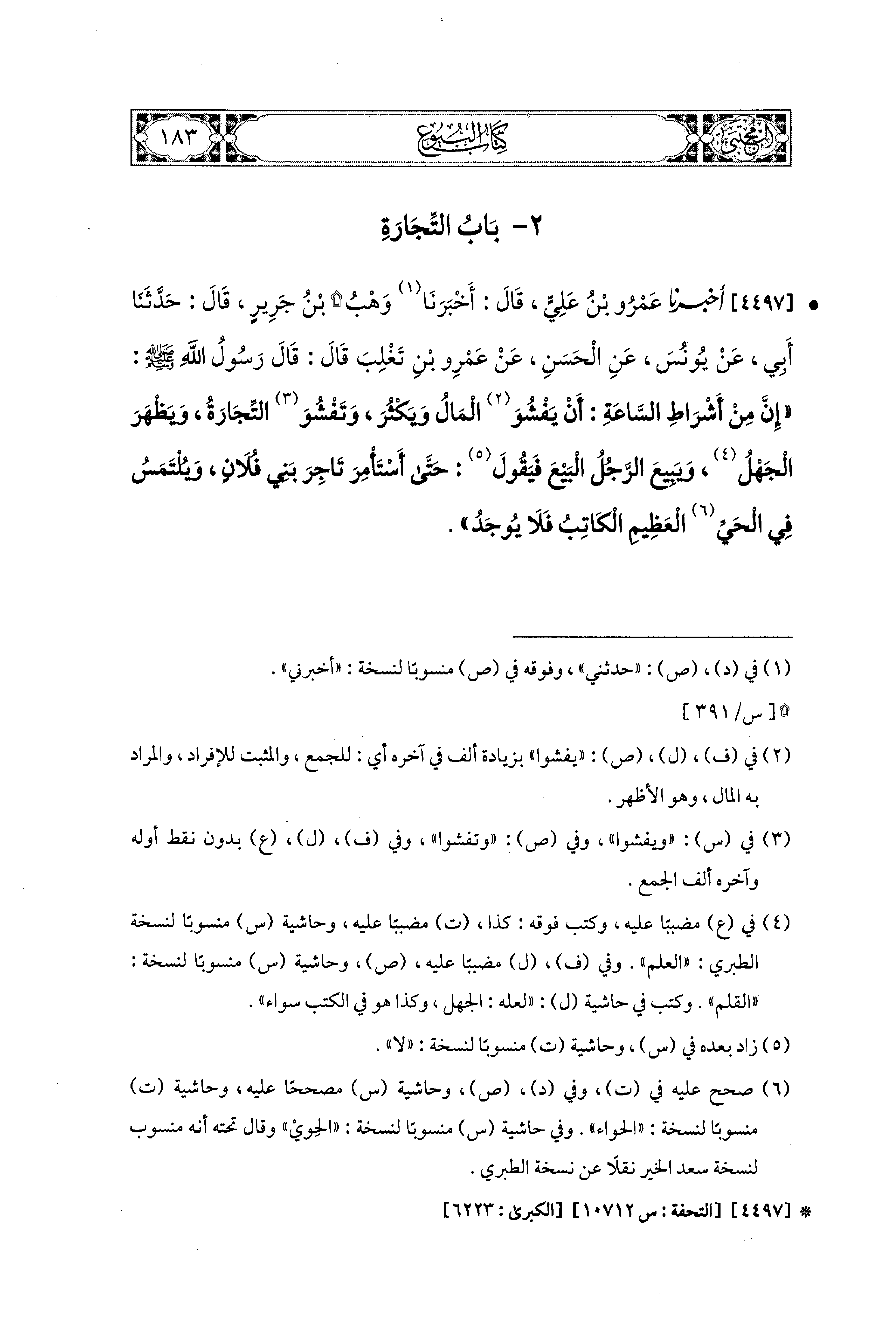 4497 - أَخبَرَنا عَمْرُو بْنُ عَلِيٍّ، قَالَ: أَخبَرنا وَهْبُ بْنُ جَرِيرٍ، قَالَ: حَدَّثَنا أَبِي، عَن يُونُسَ، عَنِ الحَسَنِ، عَن عَمْرِو بْنِ تَغْلِبَ قَالَ: قَالَ رَسُولُ اللهِ صَلى الله عَليه وسَلم: إِنَّ مِنْ أَشْرَاطِ السَّاعَةِ أَنْ يَفْشُوَ المَالُ وَيَكْثُرَ، وَتَفْشُوَ التِّجَارَةُ، وَيَظْهَرَ الْجَهْلُ، وَيَبِيعَ الرَّجُلُ البَيْعَ فَيَقُولَ: حَتَّى أَسْتَأْمِرَ تَاجِرَ بَني فُلاَنٍ، وَيُلْتَمَسَ فِي الحَيِّ العَظِيمِ الكَاتِبُ فَلاَ يُوجَدُ.