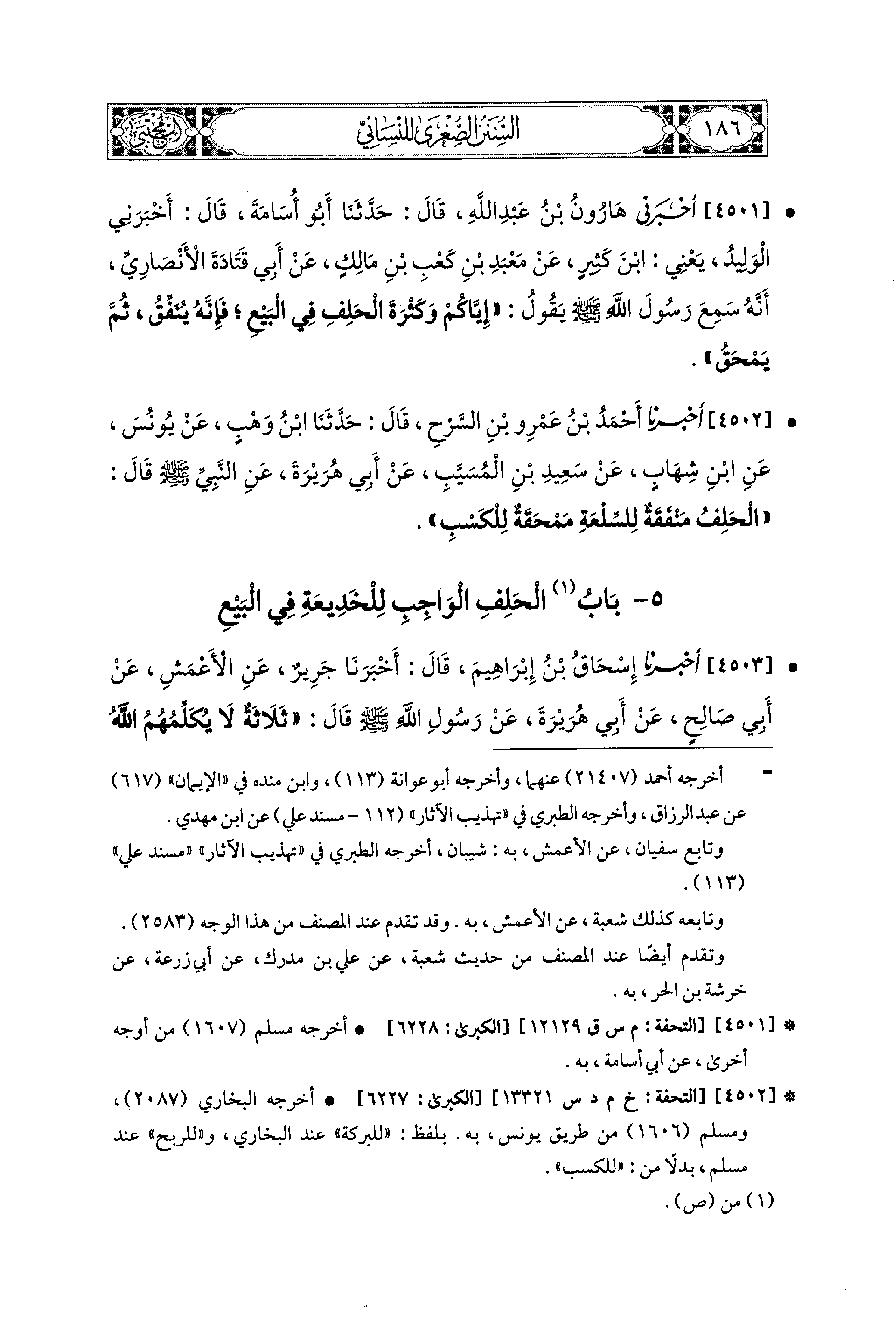 4501 - أَخْبَرَني هَارُونُ بْنُ عَبدِ اللهِ، قال: حَدثنا أَبو أُسَامَةَ، قَالَ: أَخْبَرَني الوَلِيدُ، يَعْني ابْنَ كَثِيرٍ، عَن مَعْبَدِ بْنِ كَعْبِ بْنِ مَالِكٍ، عَن أَبِي قَتَادَةَ الأَنصَارِيِّ أَنَّهُ سَمِعَ رَسُولَ اللهِ صَلى الله عَليه وسَلم يَقُولُ: إِيَّاكُمْ وَكَثْرَةَ الحَلِفِ فِي البَيْعِ، فَإِنَّهُ يُنَفِّقُ، ثُمَّ يَمْحَقُ.