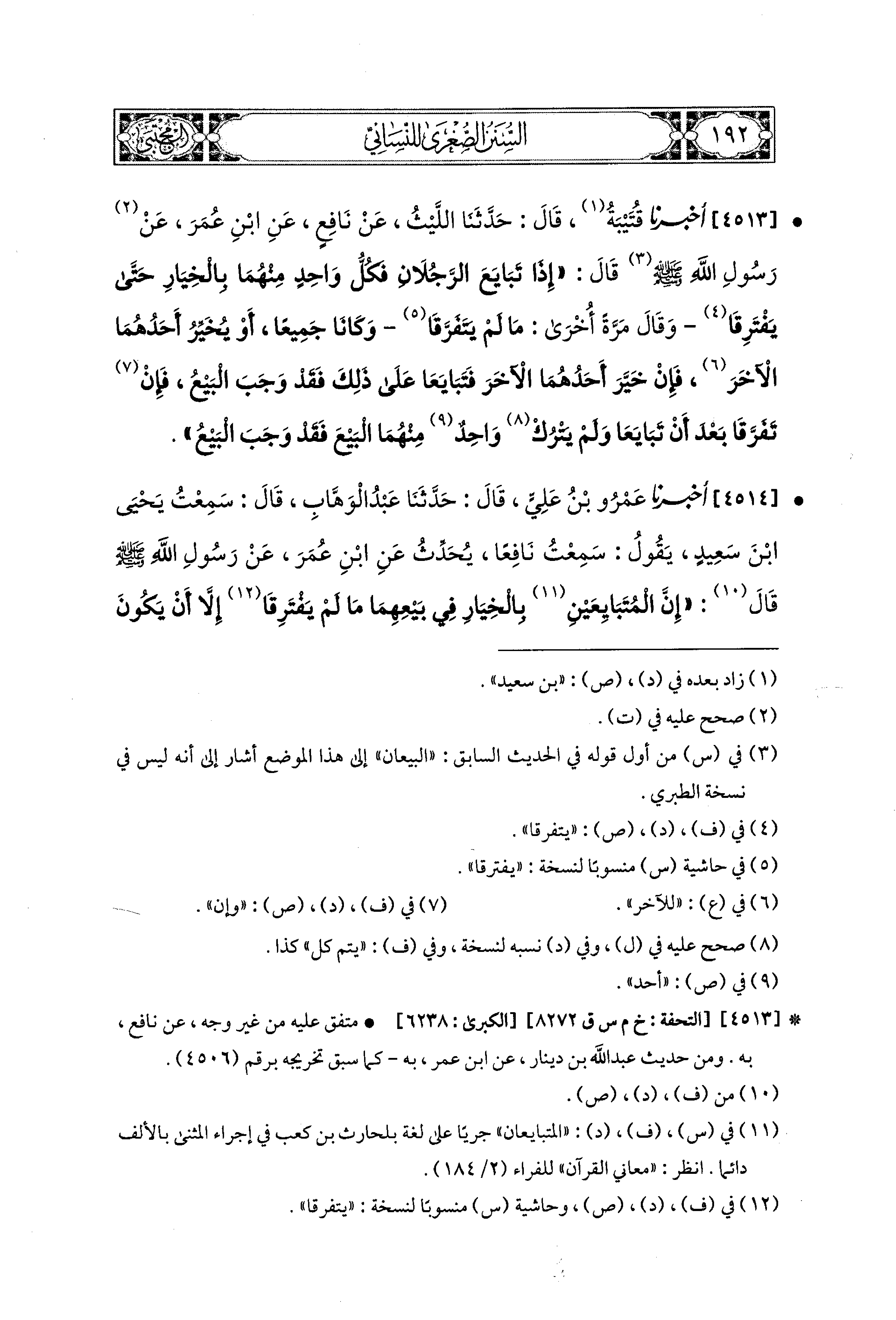 4513 - أَخبَرَنا قُتَيبَةُ، قال: حَدثنا اللَّيْثُ، عَن نَافِعٍ، عَنِ ابنِ عُمَرَ، عَن رَسُولِ اللهِ صَلى الله عَليه وسَلم قَالَ: إِذَا تَبَايَعَ الرَّجُلاَنِ فَكُلُّ وَاحِدٍ مِنْهُمَا بِالخِيَارِ حَتَّى يَفْتَرِقَا، وَقَالَ مَرَّةً أُخْرَى: مَا لَمْ يَتَفَرَّقَا، وَكَانَا جَميعًا، أَوْ يُخَيِّرَ أَحَدُهُمَا الآخَرَ، فَإِنْ خَيَّرَ أَحَدُهُمَا الآخَرَ فَتَبَايَعَا عَلَى ذَلِكَ فَقَدْ وَجَبَ البَيْعُ، فَإِنْ تَفَرَّقَا بَعْدَ أَنْ تَبَايَعَا وَلَمْ يَتْرُكْ وَاحِدٌ مِنْهُمَا البَيْعَ فَقَدْ وَجَبَ البَيْعُ.