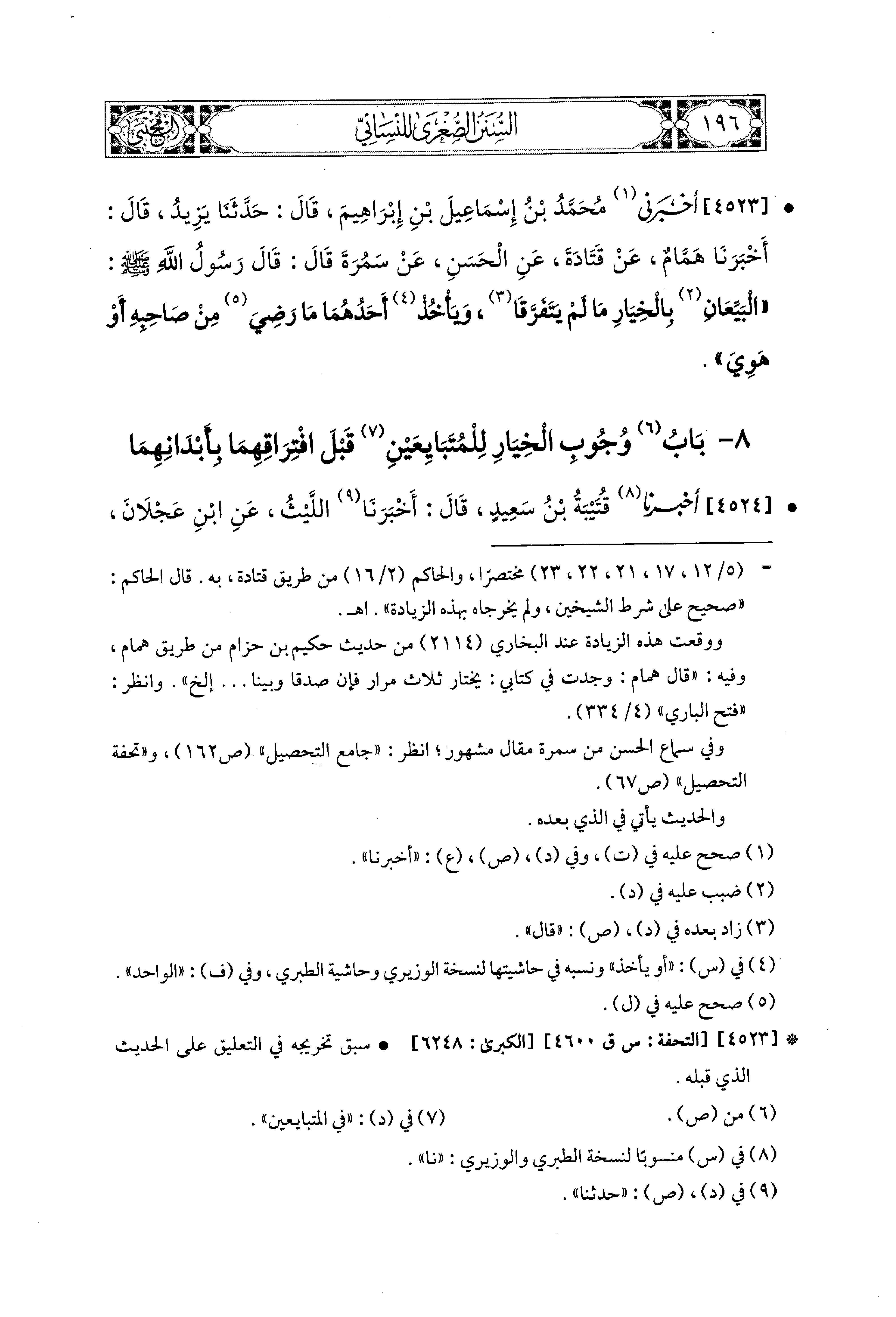 4523 - أَخْبَرَني مُحَمدُ بْنُ إِسماعِيلَ بْنِ إِبراهِيمَ، قال: حَدثنا يَزِيدُ، قَالَ: أَخبَرنا هَمَّامٌ، عَن قَتَادَةَ، عَنِ الحَسَنِ، عَن سَمُرَةَ قَالَ: قَالَ رَسُولُ اللهِ صَلى الله عَليه وسَلم: البَيِّعَانِ بِالخِيَارِ مَا لَمْ يَتَفَرَّقَا، وَيَأْخُذْ أَحَدُهُمَا مَا رَضِيَ مِنْ صَاحِبِهِ، أَوْ هَوِيَ.