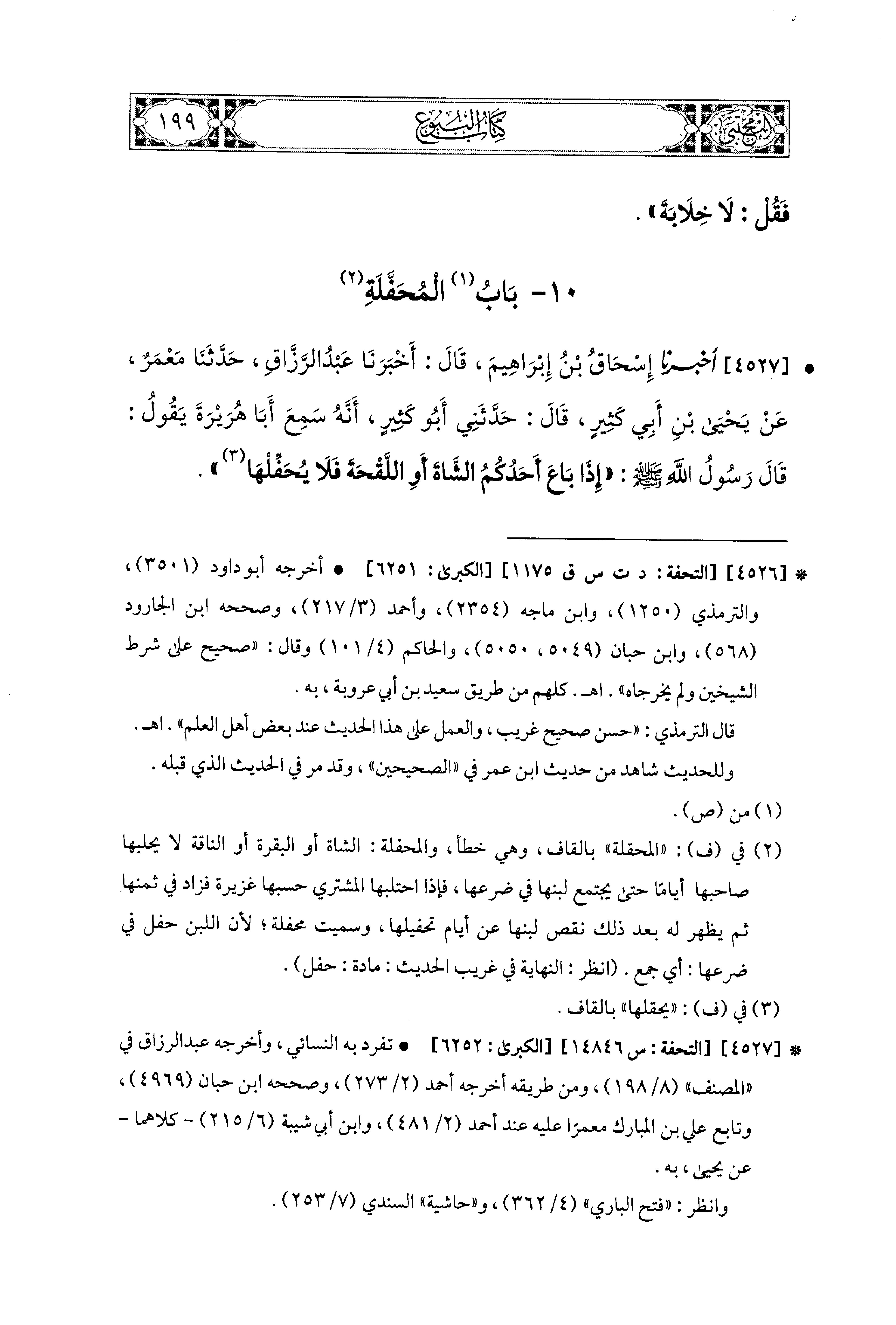 4527 - أَخبَرَنا إِسحَاقُ بْنُ إِبراهِيمَ، قَالَ: أَخبَرنا عَبدُ الرَّزَّاقِ، حَدَّثَنَا مَعْمَرٌ، عَن يَحيَى بْنِ أَبِي كَثِيرٍ، قَالَ: حَدَّثَني أَبو كَثِيرٍ أَنَّهُ: سَمِعَ أَبَا هُرَيرَةَ يَقُولُ: قَالَ رَسُولُ اللهِ صَلى الله عَليه وسَلم: إِذَا بَاعَ أَحَدُكُمُ الشَّاةَ أَوِ اللَّقْحَةَ فَلاَ يُحَفِّلْهَا.