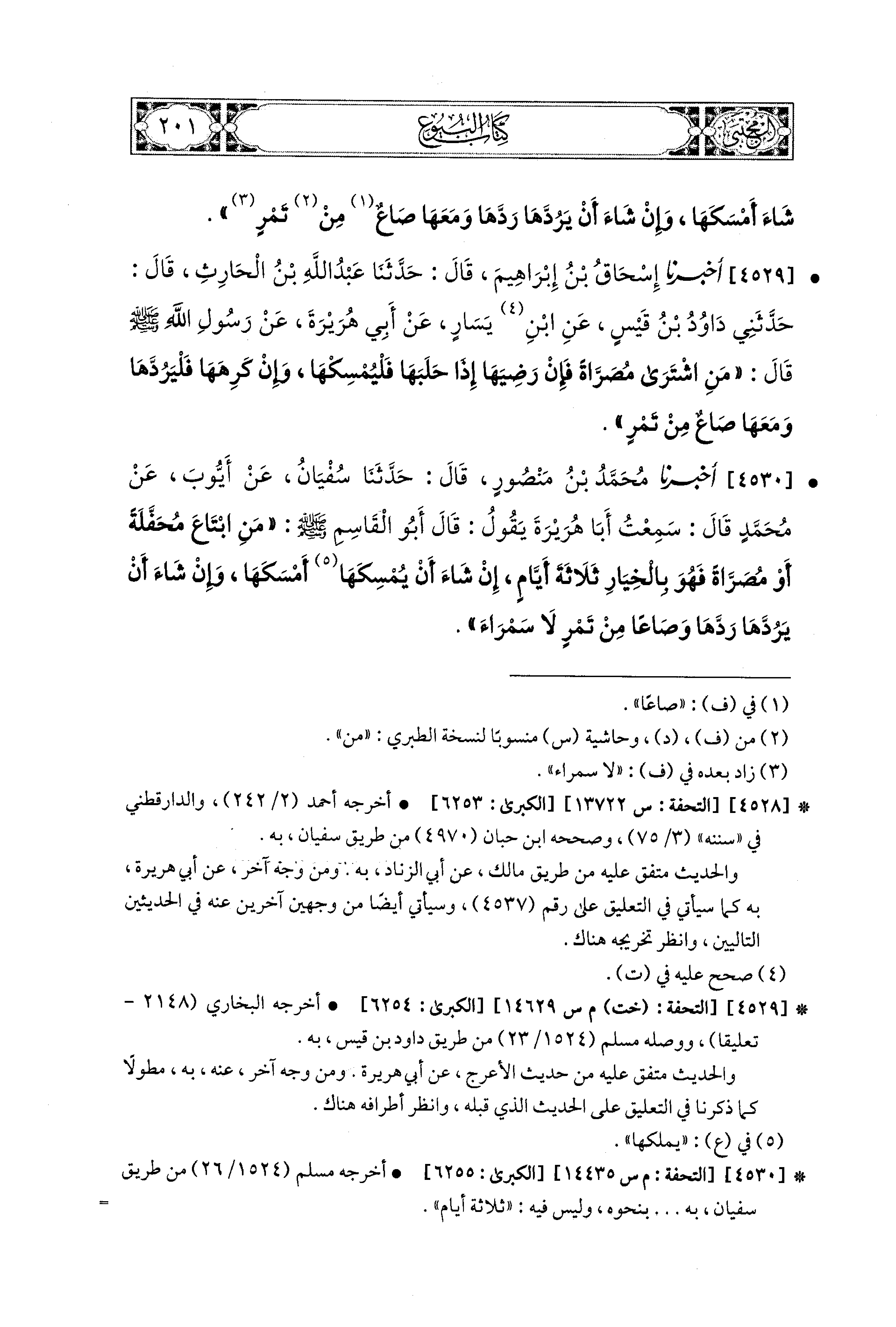 4530 - أَخبَرَنا مُحَمد بْنُ مَنْصُورٍ، قال: حَدثنا سُفْيَانُ، عَن أَيُّوبَ، عَن مُحَمدٍ، قَالَ: سَمِعْتُ أَبَا هُرَيرَةَ يَقُولُ: قَالَ أَبو القَاسِمِ صَلى الله عَليه وسَلم: مَنِ ابْتَاعَ مُحَفَّلَةً، أَوْ مُصَرَّاةً فَهُوَ بِالخِيَارِ ثَلاَثَةَ أَيَّامٍ، إِنْ شَاءَ أَنْ يُمْسِكَهَا أَمْسَكَهَا، وَإِنْ شَاءَ أَنْ يَرُدَّهَا رَدَّهَا وَصَاعًا مِنْ تَمْرٍ لاَ سَمْرَاءَ.