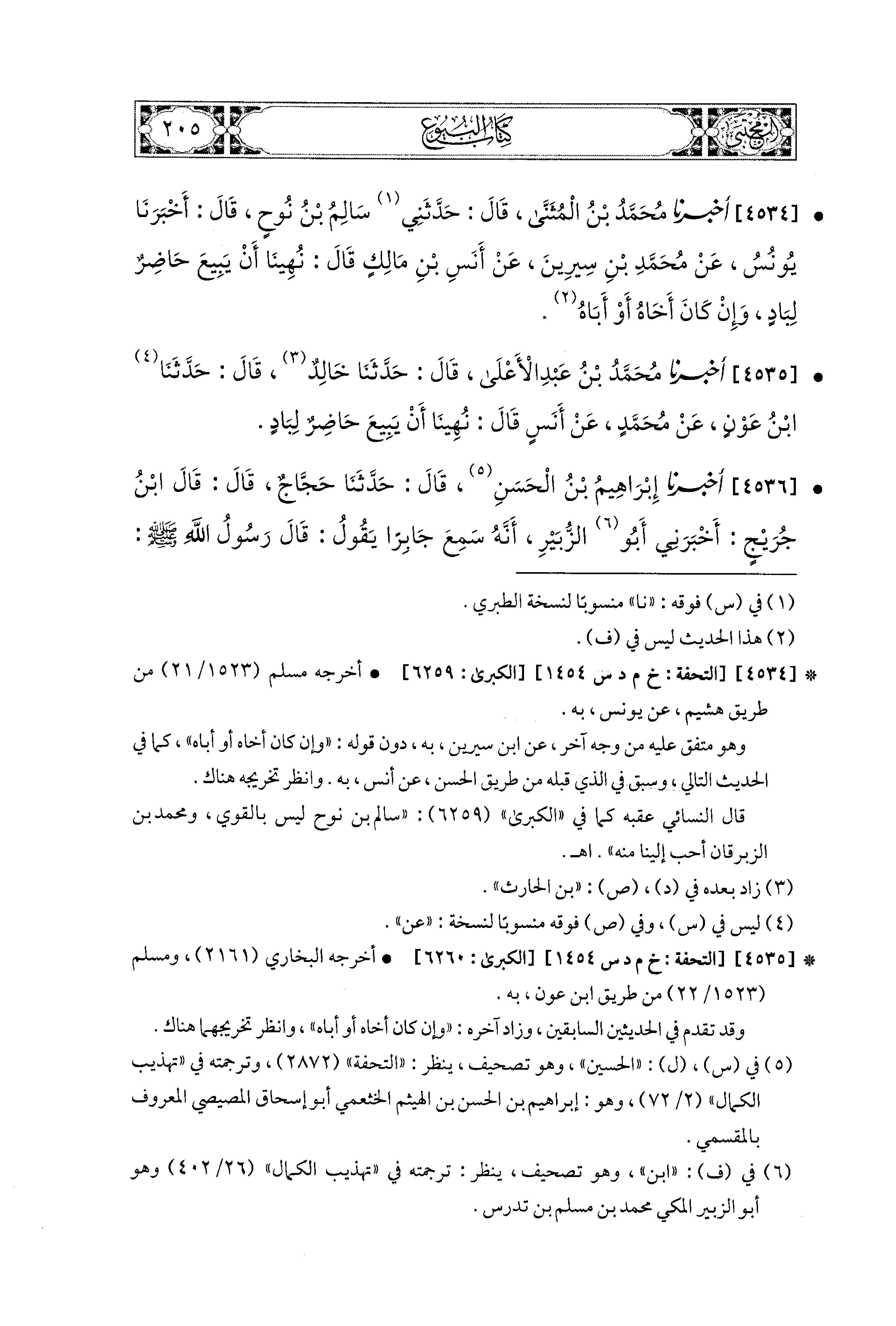 4535 - أَخبَرَنا مُحَمد بن عَبدِ الأَعلَى، قال: حَدثنا خَالِدٌ، قال: حَدثنا ابْنُ عَوْنٍ، عَن مُحَمدٍ، عَن أَنَسٍ قَالَ: نُهِينَا أَنْ يَبِيعَ حَاضِرٌ لِبَادٍ.