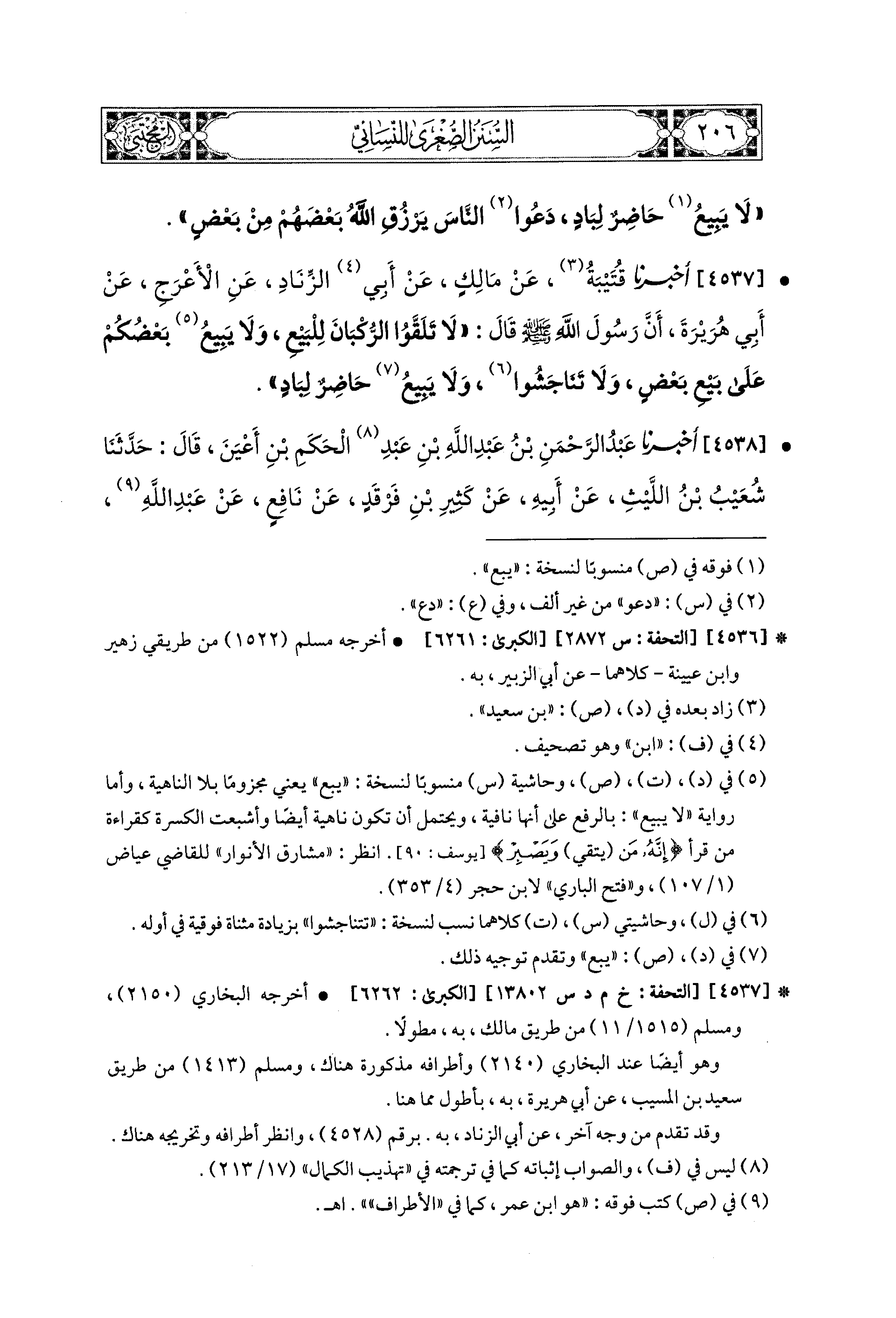 4537 - أَخبَرَنا قُتَيبَةُ، عَن مَالِكٍ، عَن أَبِي الزِّنَادِ، عَنِ الأَعْرَجِ، عَن أَبِي هُرَيرَةَ، أَنَّ رَسُولَ اللهِ صَلى الله عَليه وسَلم قَالَ: لاَ تَلَقَّوْا الرُّكْبَانَ لِلْبَيْعِ، وَلاَ يَبِيعُ بَعْضُكُمْ عَلَى بَيْعِ بَعْضٍ، وَلاَ تَنَاجَشُوا، وَلاَ يَبِيعُ حَاضِرٌ لِبَادٍ.