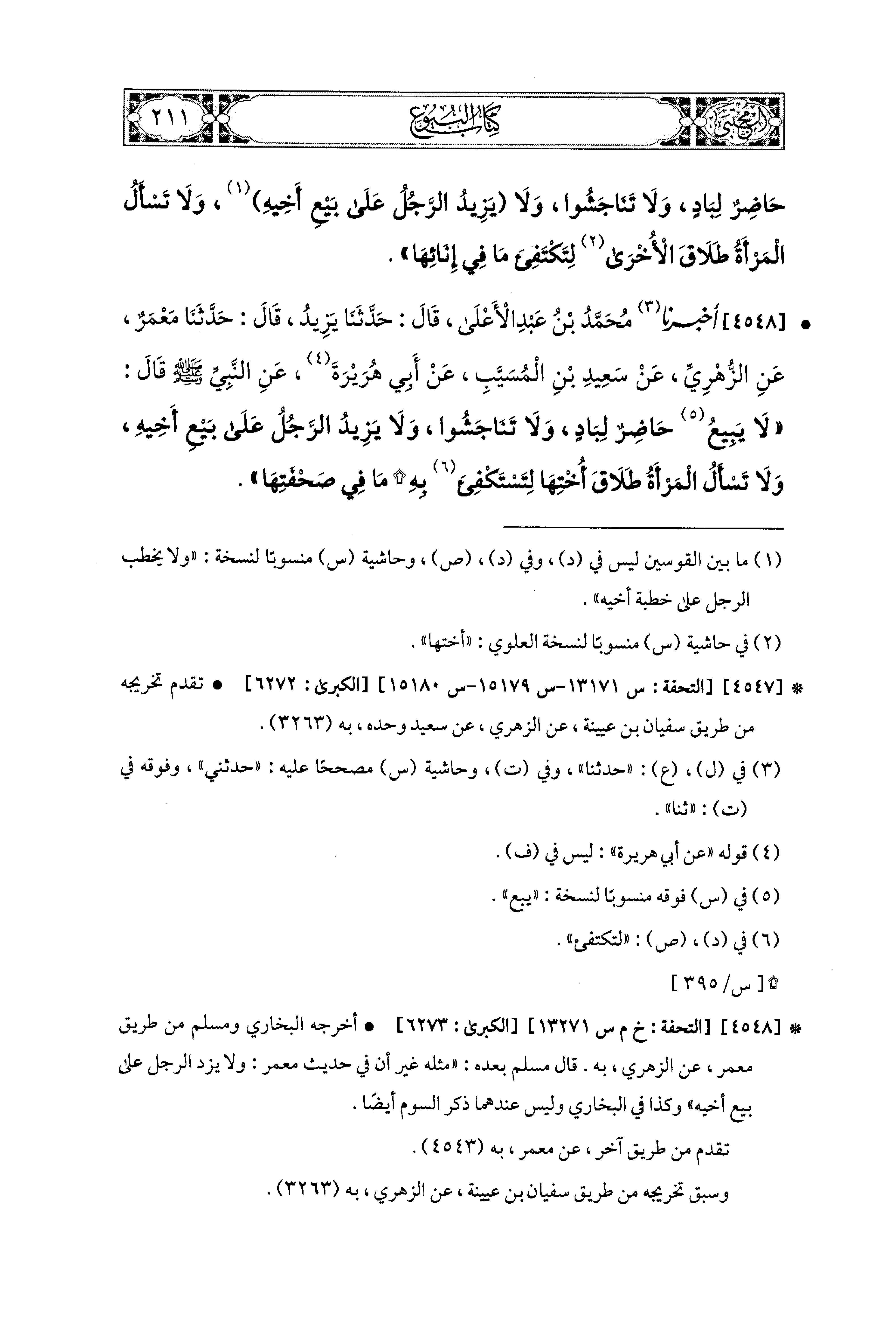 4548 - أخبرنا مُحَمدُ بن عَبدِ الأَعلَى، قال: حَدثنا يَزِيدُ، قال: حَدثنا مَعْمَرٌ، عَنِ الزُّهْرِيِّ، عَن سَعيدِ بْنِ المُسَيَّبِ، عَن أَبِي هُرَيرَةَ، عَنِ النَّبيِّ صَلى الله عَليه وسَلم قَالَ: لاَ يَبِيعُ حَاضِرٌ لِبَادٍ، وَلاَ تَنَاجَشُوا، وَلاَ يَزِيدُ الرَّجُلُ عَلَى بَيْعِ أَخِيهِ، وَلاَ تَسْأَلِ المَرْأَةُ طَلاَقَ أُخْتِهَا لِتَسْتَكْفِئَ بِهِ مَا فِي صَحْفَتِهَا.