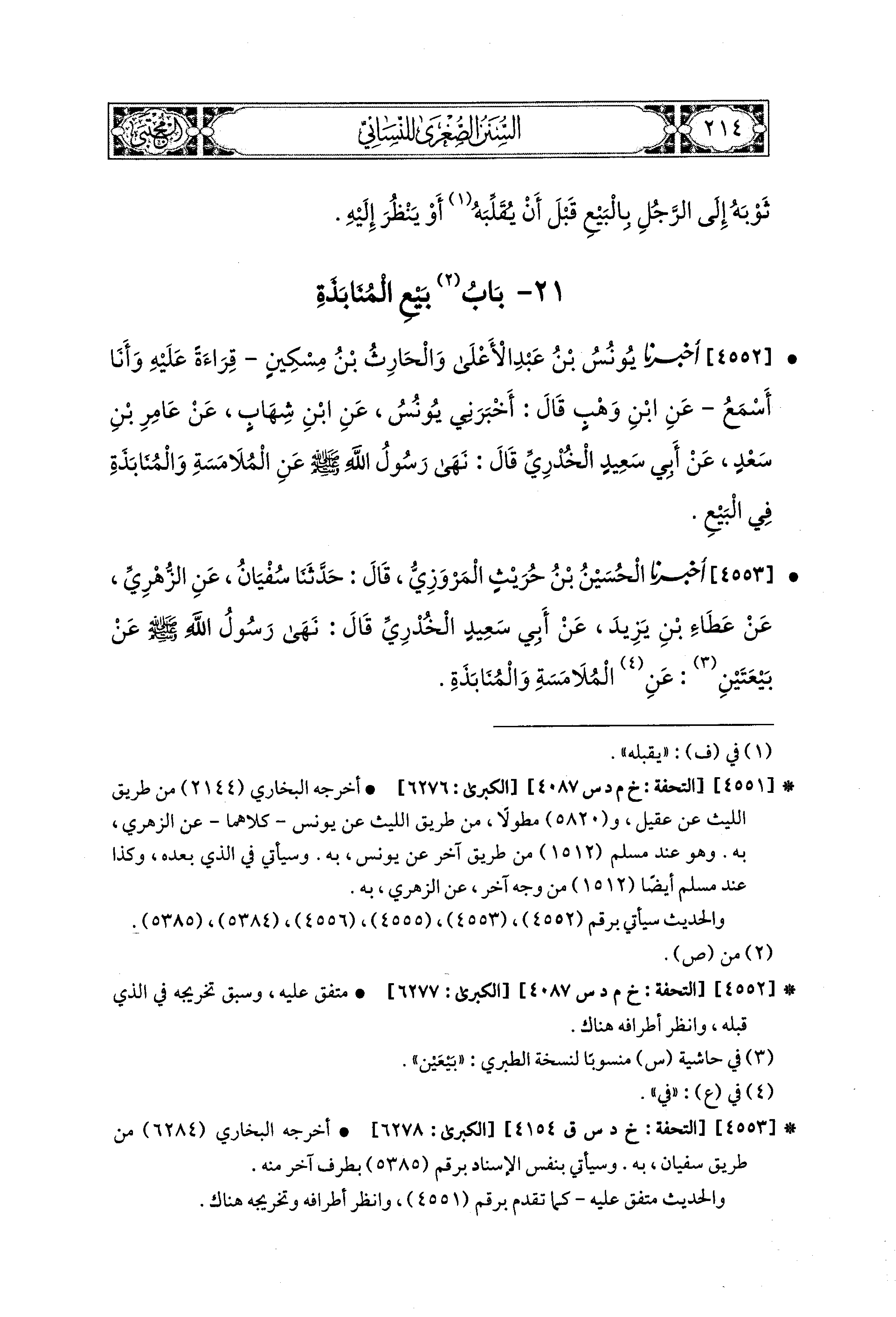 4553 - أَخبَرَنا الحُسَيْنُ بْنُ حُرَيْثٍ المَرْوَزِيُّ، قال: حَدثنا سُفْيَانُ، عَنِ الزُّهْرِيِّ، عَن عَطَاءِ بْنِ يَزِيدَ، عَن أَبِي سَعيدٍ الخُدْرِيِّ قَالَ: نَهَى رَسُولُ اللهِ صَلى الله عَليه وسَلم عَن بَيْعَتَيْنِ: عَنِ المُلاَمَسَةِ وَالمُنَابَذَةِ.