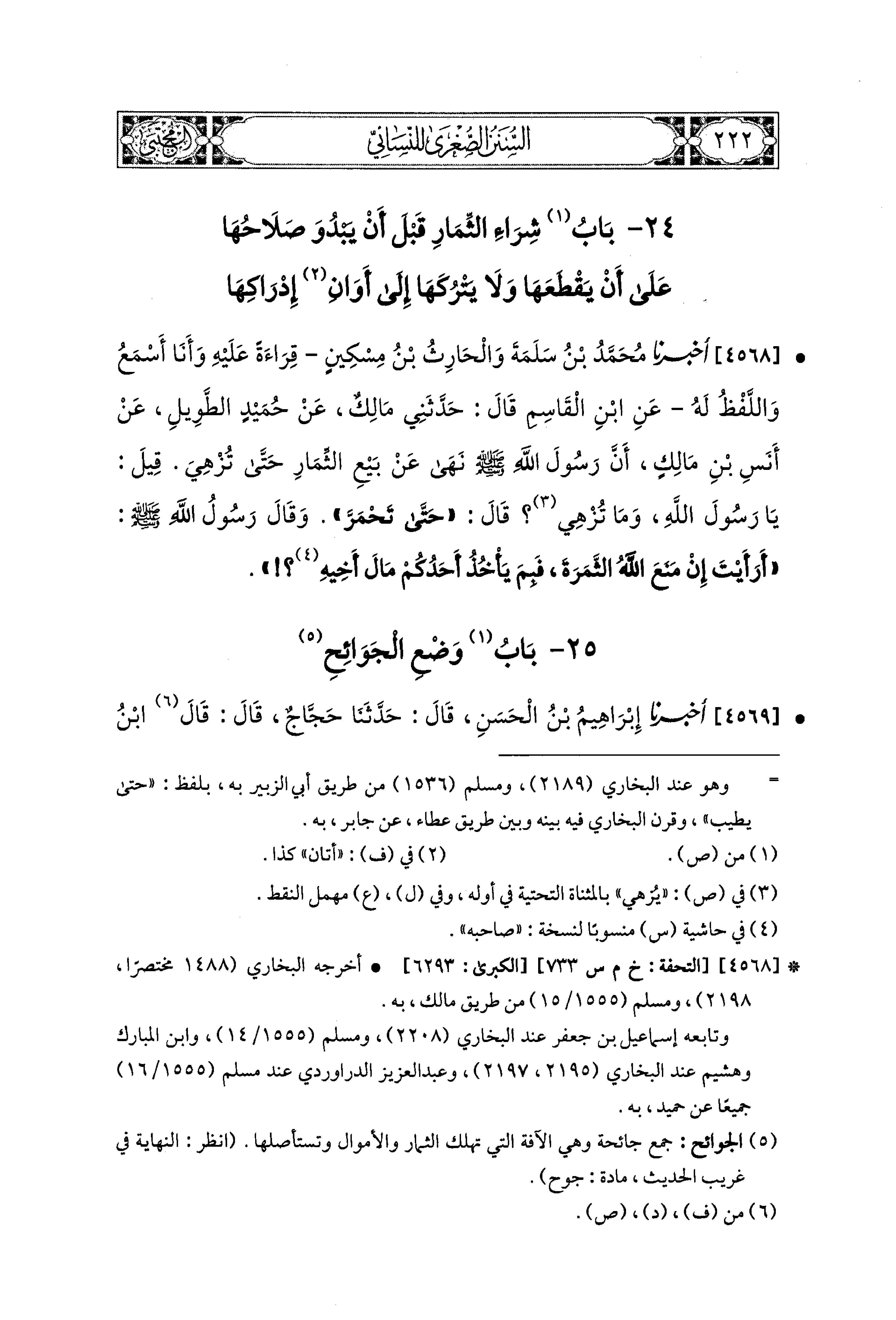 4568 - أَخبَرَنا مُحَمد بْنُ سَلَمَةَ، وَالحَارِثُ بْنُ مِسْكِينٍ، قِرَاءَةً عَلَيْهِ، وَأَنَا أَسْمَعُ، وَاللَّفْظُ لَهُ، عَنِ ابنِ القَاسِمِ، قَالَ: حَدَّثَني مَالِكٌ، عَن حُمَيْدٍ الطَّوِيلِ، عَن أَنَسِ بْنِ مَالِكٍ، أَنَّ رَسُولَ اللهِ صَلى الله عَليه وسَلم نَهَى عَن بَيْعِ الثِّمَارِ حَتَّى تُزْهِيَ، قِيلَ: يَا رَسُولَ اللهِ، وَمَا تُزْهِيَ؟ قَالَ: حَتَّى تَحْمَرَّ، وَقَالَ رَسُولُ اللهِ صَلى الله عَليه وسَلم: أَرَأَيْتَ إِنْ مَنَعَ اللهُ الثَّمَرَةَ، فَبِمَ يَأْخُذُ أَحَدُكُمْ مَالَ أَخِيهِ.