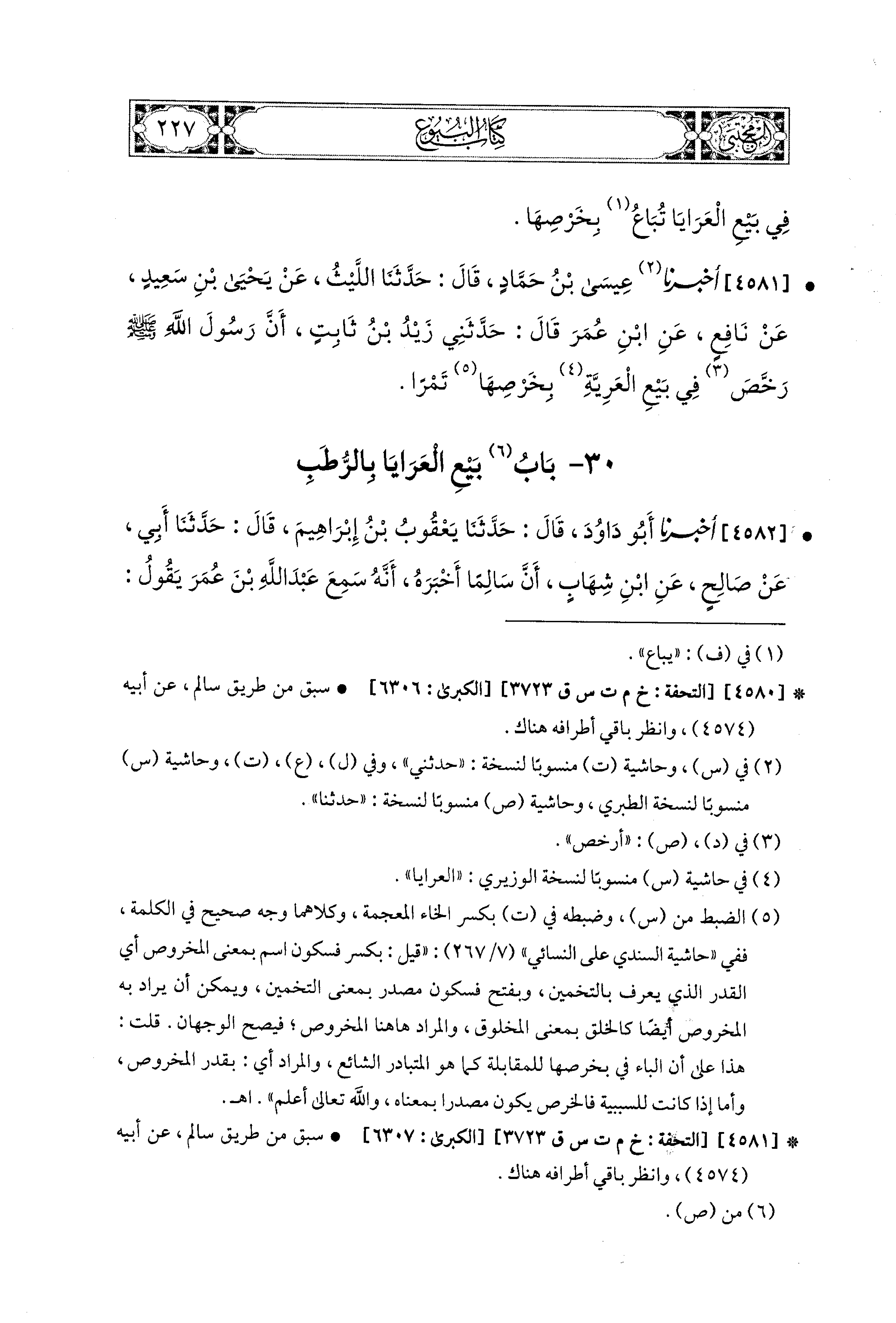 4581- أخبرنَا عِيسَى بْنُ حَمَّادٍ، قال: حَدثنا اللَّيْثُ، عَن يَحيَى بْنِ سَعيدٍ، عَن نَافِعٍ، عَنِ ابنِ عُمَرَ، قَالَ: حَدَّثَني زَيْدُ بْنُ ثَابِتٍ، أَنَّ رَسُولَ اللهِ صَلى الله عَليه وسَلم رَخَّصَ فِي بَيْعِ العَرِيَّةِ بِخِرْصِهَا تَمْرًا.