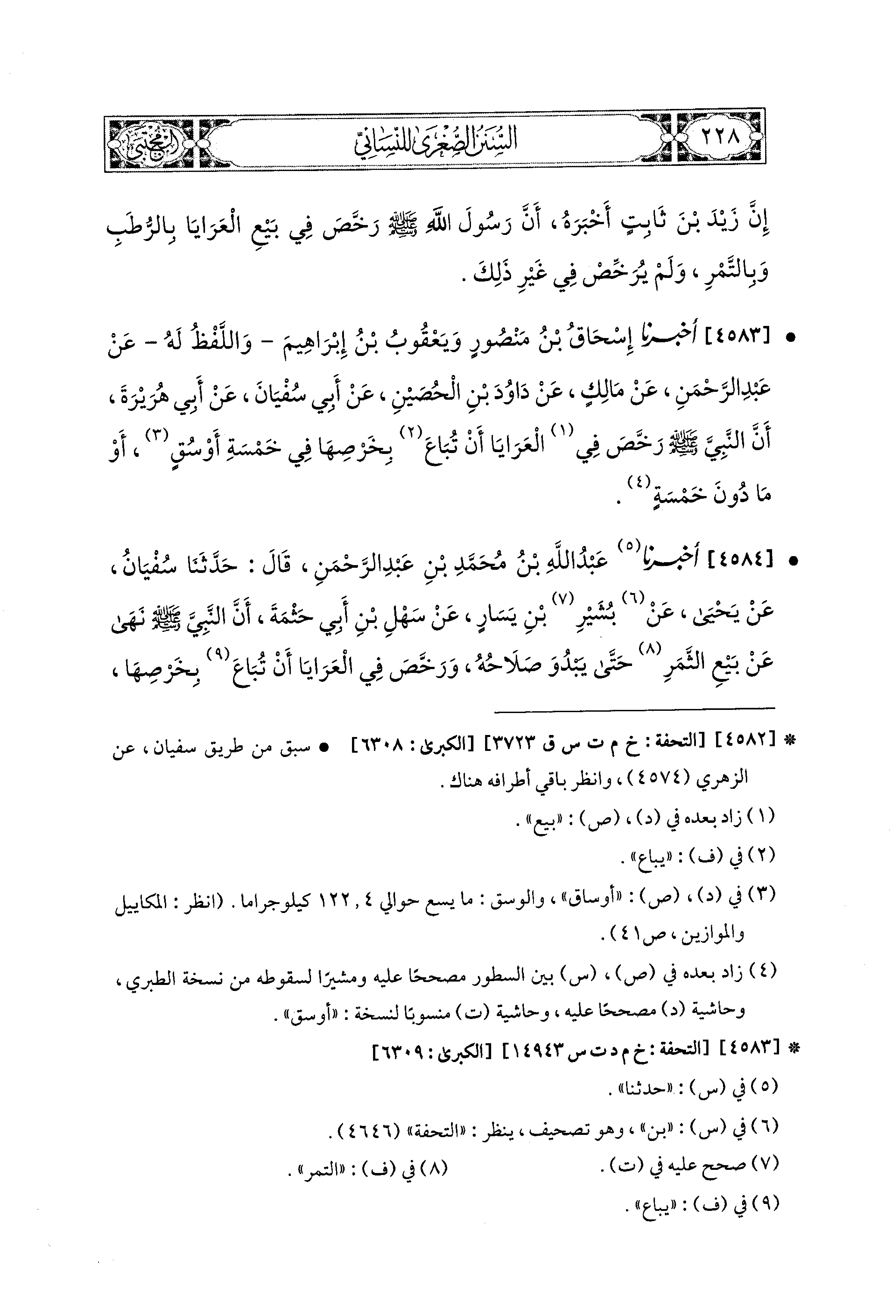 4583- أَخبَرَنا إِسحَاقُ بْنُ مَنْصُورٍ، وَيَعْقُوبُ بْنُ إِبراهِيمَ، وَاللَّفْظُ لَهُ، عَن عَبدِ الرَّحمَنِ، عَن مَالِكٍ، عَن دَاوُدَ بْنِ الحُصَيْنِ، عَن أَبِي سُفْيَانَ، عَن أَبِي هُرَيرَةَ، أَنَّ النَّبيَّ صَلى الله عَليه وسَلم رَخَّصَ فِي العَرَايَا أَنْ تُبَاعَ بِخِرْصِهَا فِي خَمْسَةِ أَوْسُقٍ، أَوْ مَا دُونَ خَمْسَةٍ.