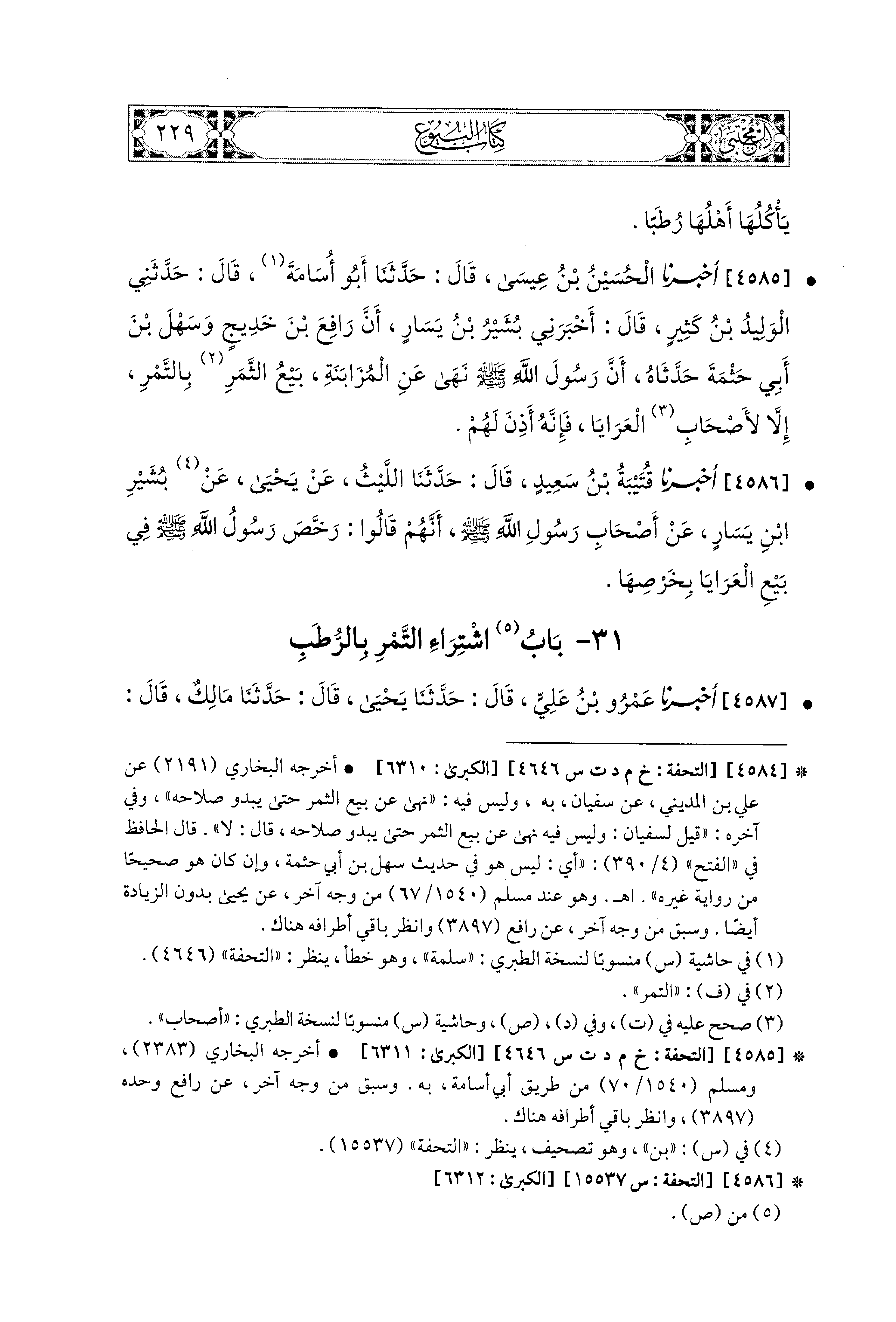 4585- أَخبَرَنا الحُسَيْنُ بْنُ عِيسَى، قال: حَدثنا أَبو أُسَامَةَ، قَالَ: حَدَّثَني الوَلِيدُ بْنُ كَثِيرٍ، قَالَ: أَخْبَرَني بُشَيْرُ بْنُ يَسَارٍ، أَنَّ رَافِعَ بْنَ خَدِيجٍ، وَسَهْلَ بْنَ أَبِي حَثْمَةَ، حَدَّثَاهُ أَنَّ رَسُولَ اللهِ صَلى الله عَليه وسَلم نَهَى عَنِ المُزَابَنَةِ بَيْعُ الثَّمَرِ بِالتَّمْرِ، إِلاَّ لأَصْحَابِ العَرَايَا، فَإِنَّهُ أَذِنَ لَهُمْ.