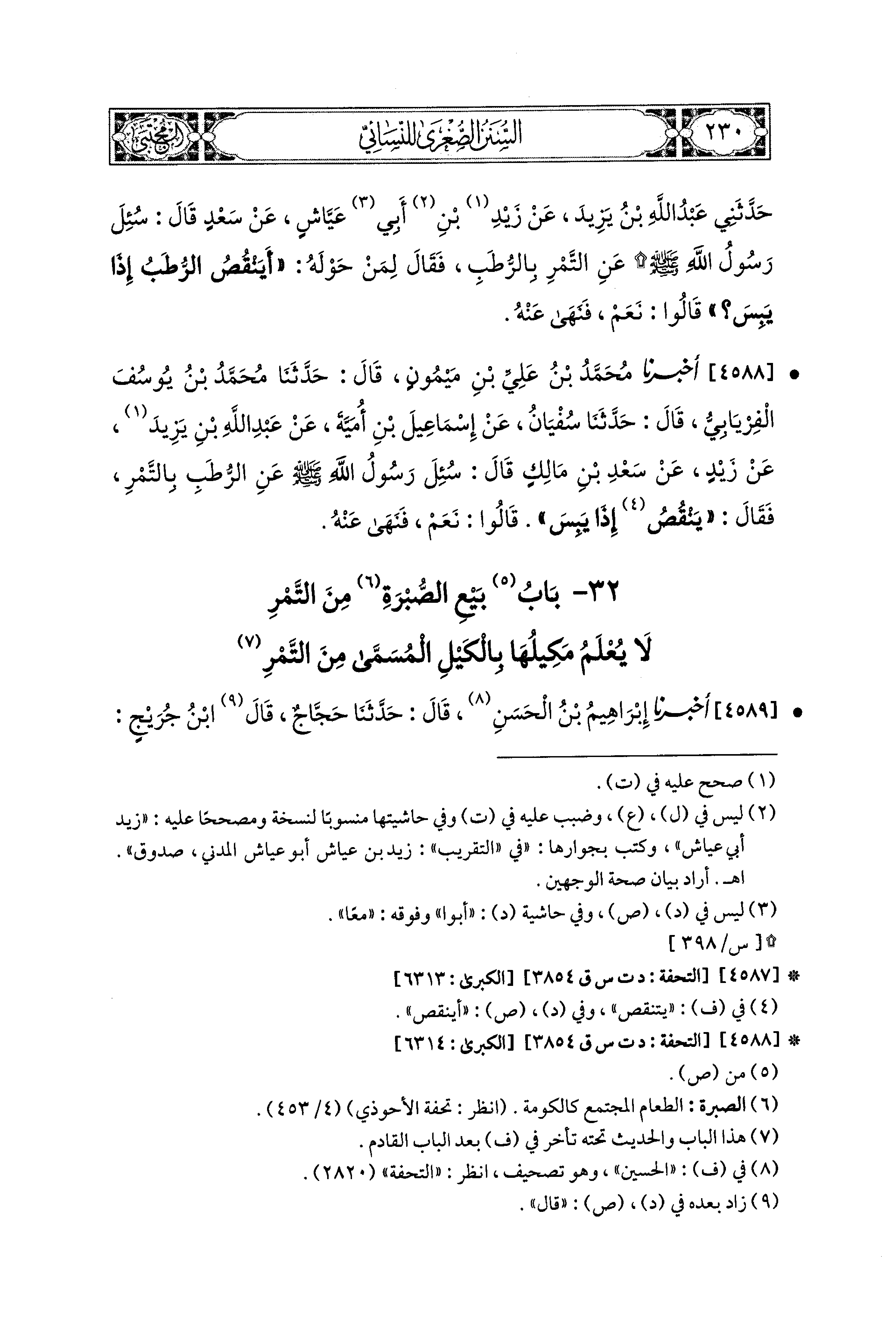 4588- أَخبَرَنا مُحَمد بْنُ عَلِيِّ بْنِ مَيْمُونٍ، قال: حَدثنا مُحَمدُ بْنُ يُوسُفَ الفِرْيَابيُّ، قال: حَدثنا سُفْيَانُ، عَن إِسماعِيلَ بْنِ أُمَيَّةَ، عَن عَبد اللهِ بن يَزِيدَ، عَن زَيْدٍ، عَن سَعْدِ بْنِ مَالِكٍ قَالَ: سُئِلَ رَسُولُ اللهِ صَلى الله عَليه وسَلم عَنِ الرُّطَبِ بِالتَّمْرِ، فَقَالَ: أَيَنْقُصُ (1) إِذَا يَبِسَ؟ قَالُوا: نَعَمْ، فَنَهَى عَنْهُ.