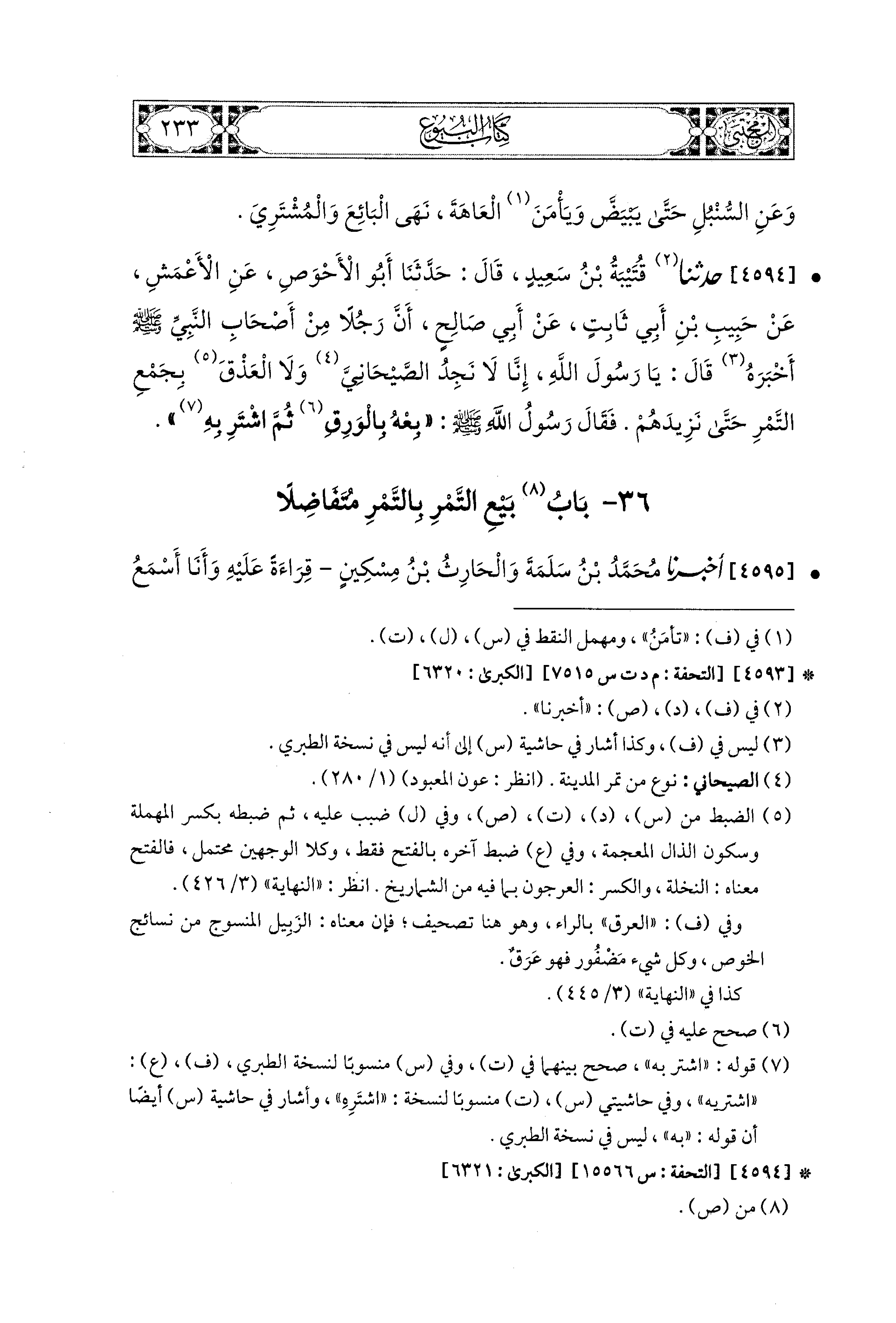 4594- حَدَّثَنَا قُتَيبَةُ بْنُ سَعيدٍ، قال: حَدثنا أَبو الأَحْوَصِ، عَنِ الأَعْمَشِ، عَن حَبِيبِ بْنِ أَبِي ثَابِتٍ، عَن أَبِي صَالِحٍ، أَنَّ رَجُلاً مَنْ أَصْحَابِ النَّبيِّ صَلى الله عَليه وسَلم أَخْبَرَهُ، قَالَ: يَا رَسُولَ اللهِ، إِنَّا لاَ نَجِدُ الصَّيْحَانيَّ، وَلاَ العِذْقَ بِجَمْعِ التَّمْرِ حَتَّى نَزِيدَهُمْ، فَقَالَ رَسُولُ اللهِ صَلى الله عَليه وسَلم: بِعْهُ بِالوَرِقِ، ثُمَّ اشْتَرِ بِهِ.