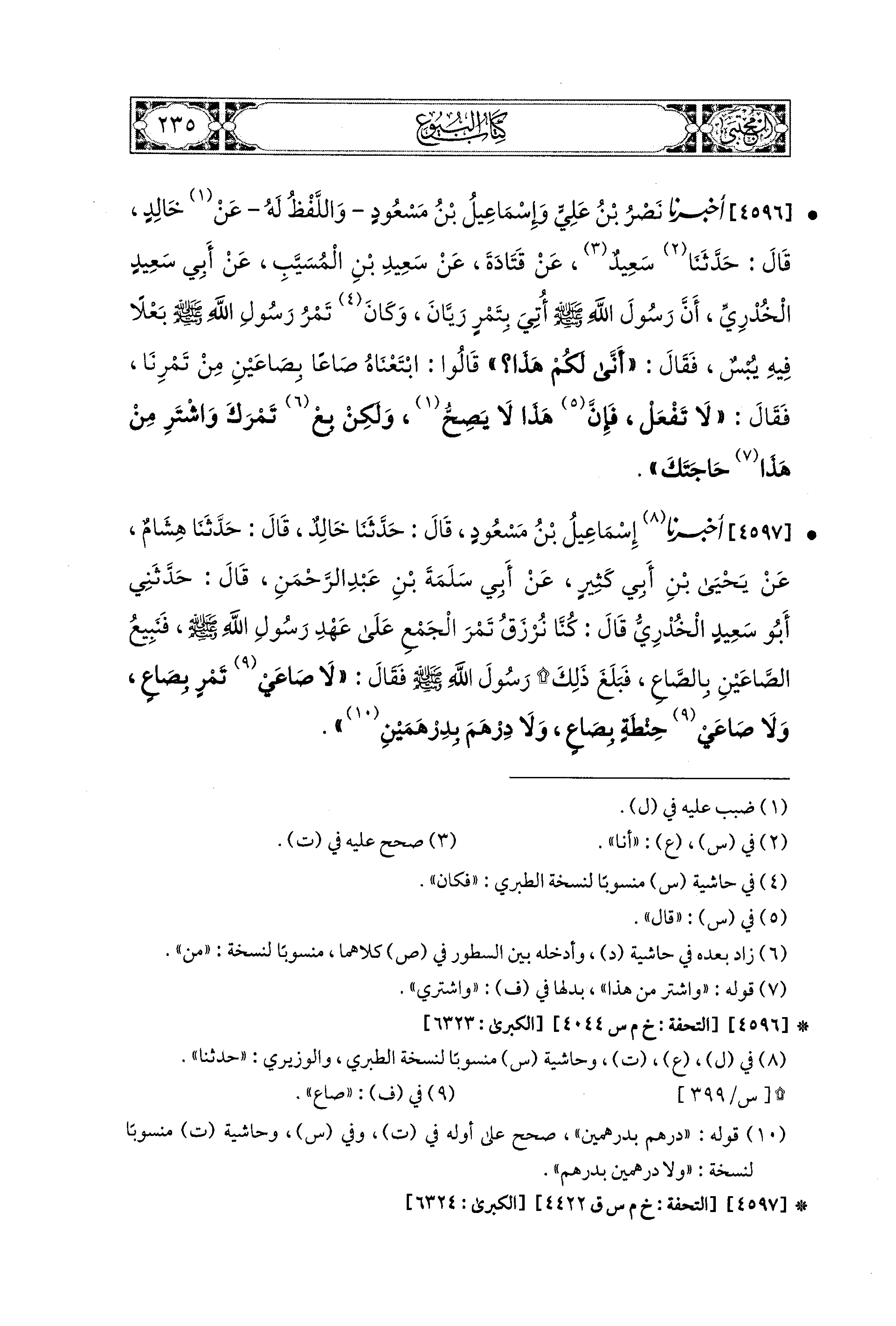 4597- أخبرنا إِسماعِيلُ بْنُ مَسْعُودٍ، قال: حَدثنا خَالِدٌ، قال: حَدثنا هِشَامٌ، عَن يَحيَى بْنِ أَبِي كَثِيرٍ، عَن أَبِي سَلَمَةَ بْنِ عَبدِ الرَّحمَنِ، قال: حَدثني أَبو سَعيدٍ الخُدْرِيُّ، قَالَ: كُنَّا نُرْزَقُ تَمْرَ الجَمْعِ عَلَى عَهْدِ رَسُولِ اللهِ صَلى الله عَليه وسَلم، فَنَبِيعُ الصَّاعَيْنِ بِالصَّاعِ، فَبَلَغَ ذَلِكَ رَسُولَ اللهِ صَلى الله عَليه وسَلم، فَقَالَ: لاَ صَاعَيْ تَمْرٍ بِصَاعٍ، وَلاَ صَاعَيْ حِنْطَةٍ بِصَاعٍ، وَلاَ دِرْهَمًا(1) بِدِرْهَمَيْنِ.