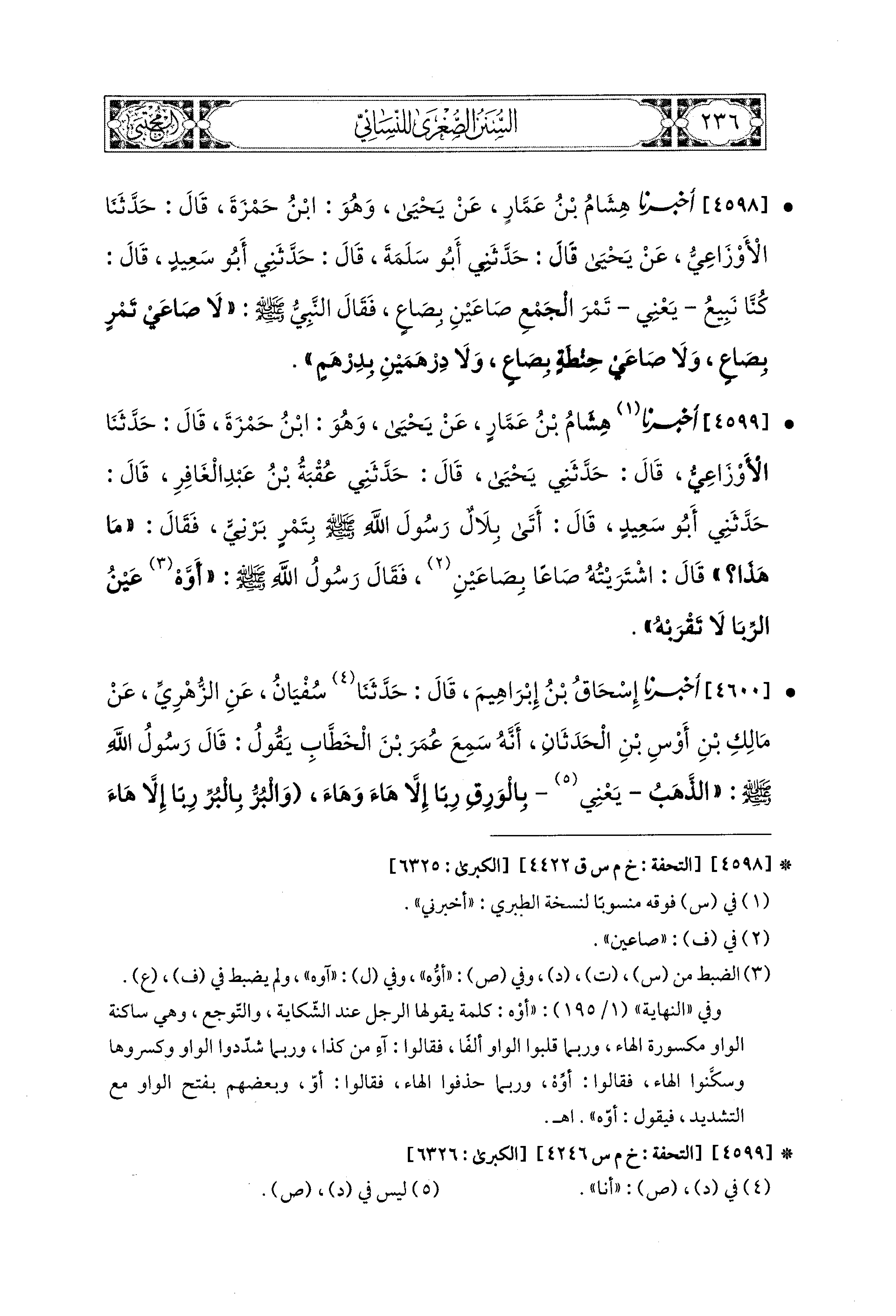 4599- أَخبَرَنا هِشَامُ بْنُ عَمَّارٍ، عَن يَحيَى، وَهُوَ ابْنُ حَمْزَةَ، قال: حَدثنا الأَوْزَاعِيُّ، قَالَ: حَدَّثَني يَحيَى، قَالَ: حَدَّثَني عُقْبَةُ بْنُ عَبدِ الغَافِرِ، قَالَ: حَدَّثَني أَبو سَعيدٍ قَالَ: أَتَى بِلاَلٌ رَسُولَ اللهِ صَلى الله عَليه وسَلم بِتَمْرٍ بَرْنيٍّ، فَقَالَ: مَا هَذَا؟ قَالَ: اشْتَرَيْتُهُ صَاعًا بِصَاعَيْنِ، فَقَالَ رَسُولُ اللهِ صَلى الله عَليه وسَلم: أَوِّهْ عَيْنُ الرِّبَا لاَ تَقْرَبْهُ.