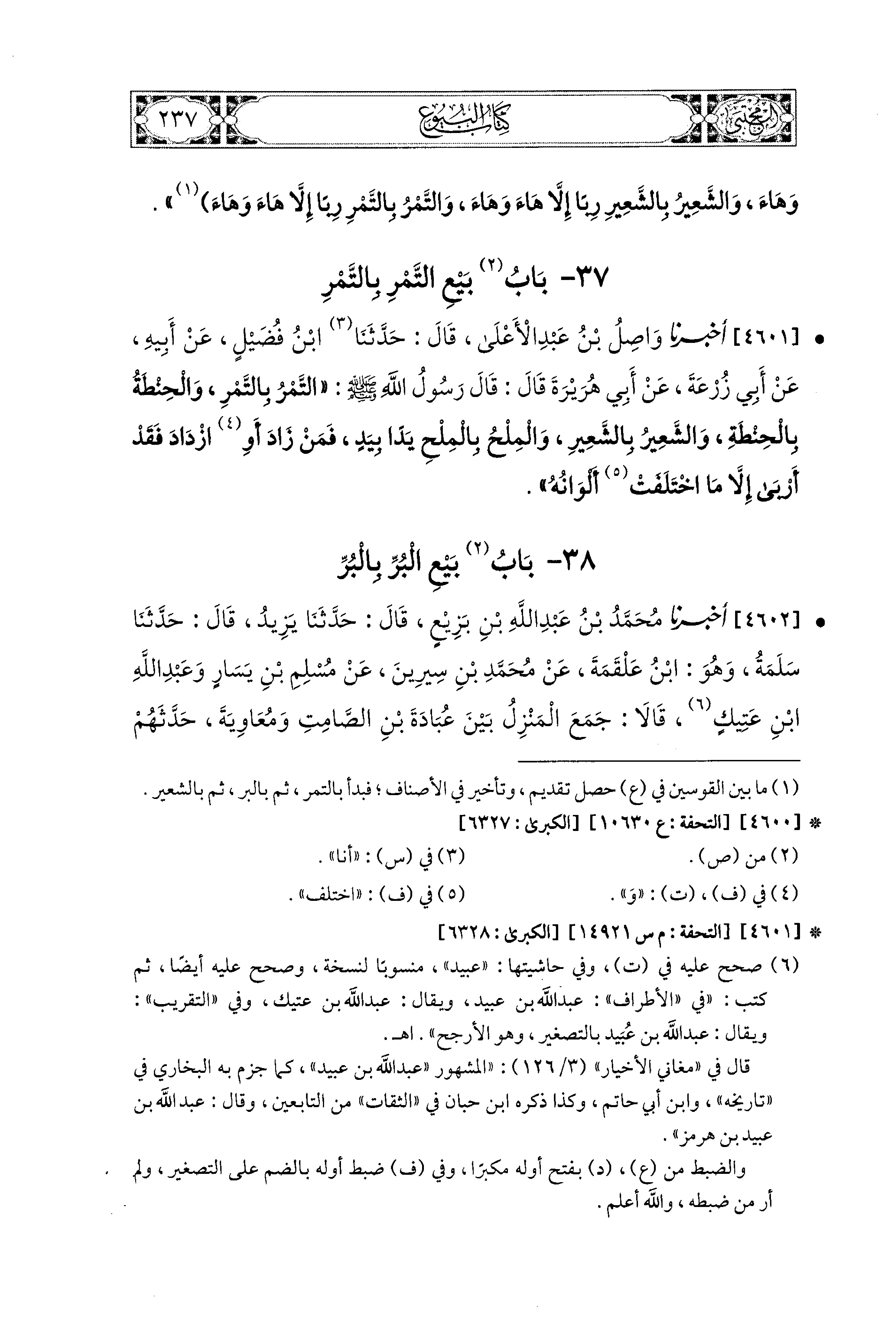 4602- أَخبَرَنا مُحَمد بْنُ عَبدِ اللهِ بْنِ بَزِيعٍ، قال: حَدثنا يَزِيدُ، قال: حَدثنا سَلَمَةُ، وَهُوَ ابْنُ عَلْقَمَةَ، عَن مُحَمدِ بْنِ سِيرِينَ، عَن مُسْلِمِ بْنِ يَسَارٍ، وَعَبدِ اللهِ بْنِ عَتِيكٍ قَالاَ: جَمَعَ المَنْزِلُ بَيْنَ عُبَادَةَ بْنِ الصَّامِتِ، وَمُعَاوِيَةَ، حَدَّثَهُمْ عُبَادَةُ قَالَ: نَهَانَا رَسُولُ اللهِ صَلى الله عَليه وسَلم عَن بَيْعِ الذَّهَبِ بِالذَّهَبِ، وَالوَرِقِ بِالوَرِقِ، وَالبُرِّ بِالبُرِّ، وَالشَّعِيرِ بِالشَّعِيرِ، وَالتَّمْرِ بِالتَّمْرِ، قَالَ أَحَدُهُمَا: وَالمِلْحِ بِالمِلْحِ، وَلَمْ يَقُلْهُ الآخَرُ: إِلاَّ مِثْلاً بِمِثْلٍ يَدًا بِيَدٍ، وَأَمَرَنَا أَنْ نَبِيعَ الذَّهَبَ بِالوَرِقِ، وَالوَرِقَ بِالذَّهَبِ، وَالبُرَّ بِالشَّعِيرِ، وَالشَّعِيرَ بِالبُرِّ، يَدًا بِيَدٍ، كَيْفَ شِئْنَا، قَالَ أَحَدُهُمَا: فَمَنْ زَادَ أَوِ ازْدَادَ فَقَدْ أَرْبَى.