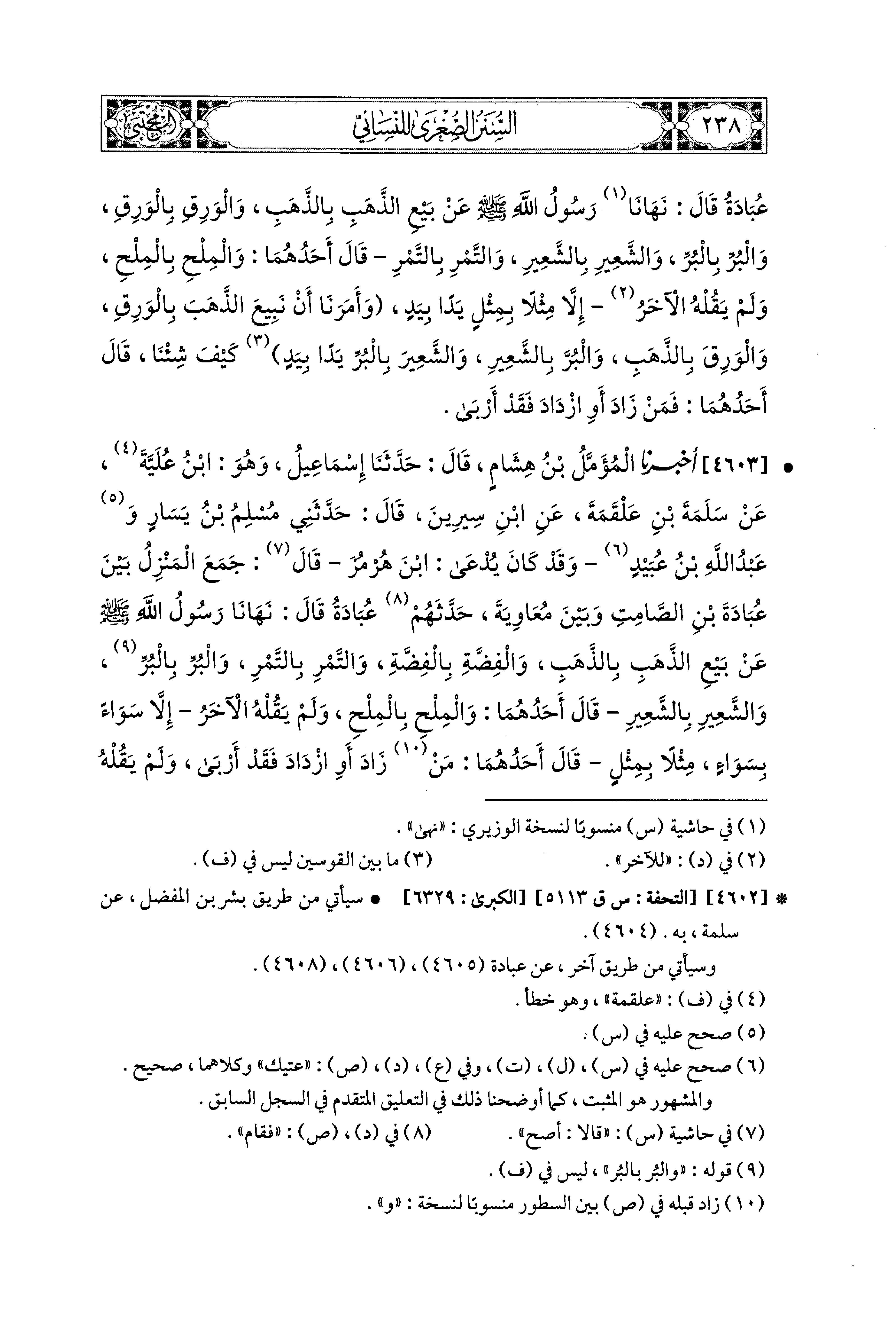 4603- أَخبَرَنا المُؤَمَّلُ بْنُ هِشَامٍ، قال: حَدثنا إِسماعِيلُ، وَهُوَ ابْنُ عُلَيَّةَ، عَن سَلَمَةَ بْنِ عَلْقَمَةَ، عَنِ ابنِ سِيرِينَ، قَالَ: حَدَّثَني مُسْلِمُ بْنُ يَسَارٍ، وَعَبدُ اللهِ بْنُ عُبَيدٍ، وَقَدْ كَانَ يُدْعَى ابْنَ هُرْمُزَ، قَالَ: جَمَعَ المَنْزِلُ بَيْنَ عُبَادَةَ بْنِ الصَّامِتِ وَبَيْنَ مُعَاوِيَةَ، حَدَّثَهُمْ عُبَادَةُ قَالَ: نَهَانَا رَسُولُ اللهِ صَلى الله عَليه وسَلم عَن بَيْعِ الذَّهَبِ بِالذَّهَبِ، وَالفِضَّةِ بِالفِضَّةِ، وَالتَّمْرِ بِالتَّمْرِ، وَالبُرِّ بِالبُرِّ، وَالشَّعِيرِ بِالشَّعِيرِ، قَالَ أَحَدُهُمَا: وَالمِلْحِ بِالمِلْحِ، وَلَمْ يَقُلْهُ الآخَرُ: إِلاَّ سَوَاءً بِسَوَاءٍ مِثْلاً بِمِثْلٍ، قَالَ أَحَدُهُمَا: مَنْ زَادَ أَوِ ازْدَادَ فَقَدْ أَرْبَى، وَلَمْ يَقُلْهُ الآخَرُ، وَأَمَرَنَا أَنْ نَبِيعَ الذَّهَبَ بِالفِضَّةِ، وَالفِضَّةَ بِالذَّهَبِ، وَالبُرَّ بِالشَّعِيرِ، وَالشَّعِيرَ بِالبُرِّ، يَدًا بِيَدٍ كَيْفَ شِئْنَا.